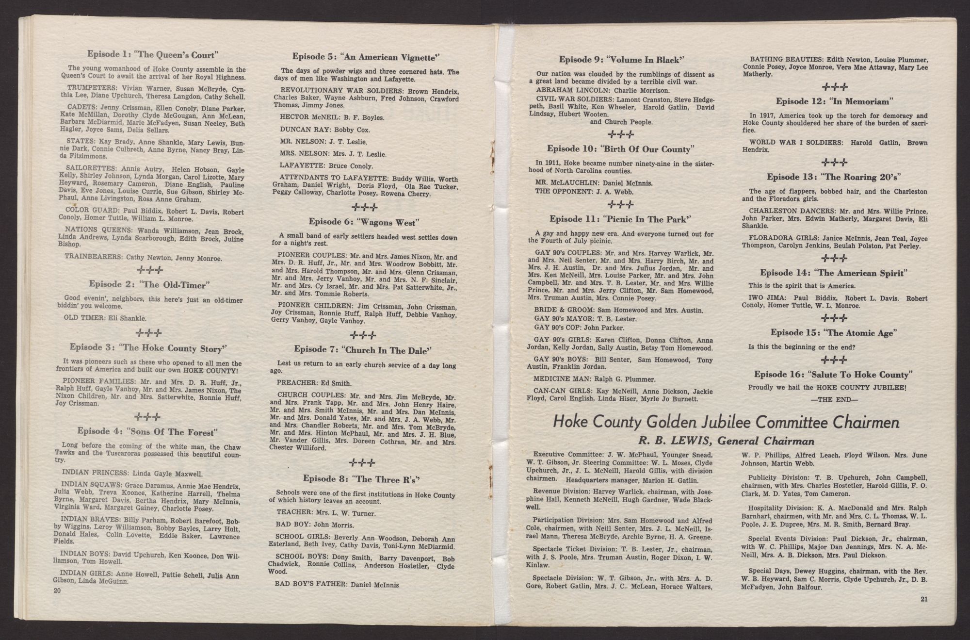 The material for this historical program was assembled and prepared by a committee of Hoke County Golden Jubilee which had Miss Josephine Hall, Hoke County Home Ecomonics Agent and daughter of the county's first sheriff, as chairman. Assisting Miss Hall in the preparation of the history were Mrs. D. B. McFadyen, Mrs. Luke Bethune and Rear Admiral A. M. Patterson, USN, Ret. Admiral Patterson is a Hoke County native and now works with the N. C. Department of Archives and History.