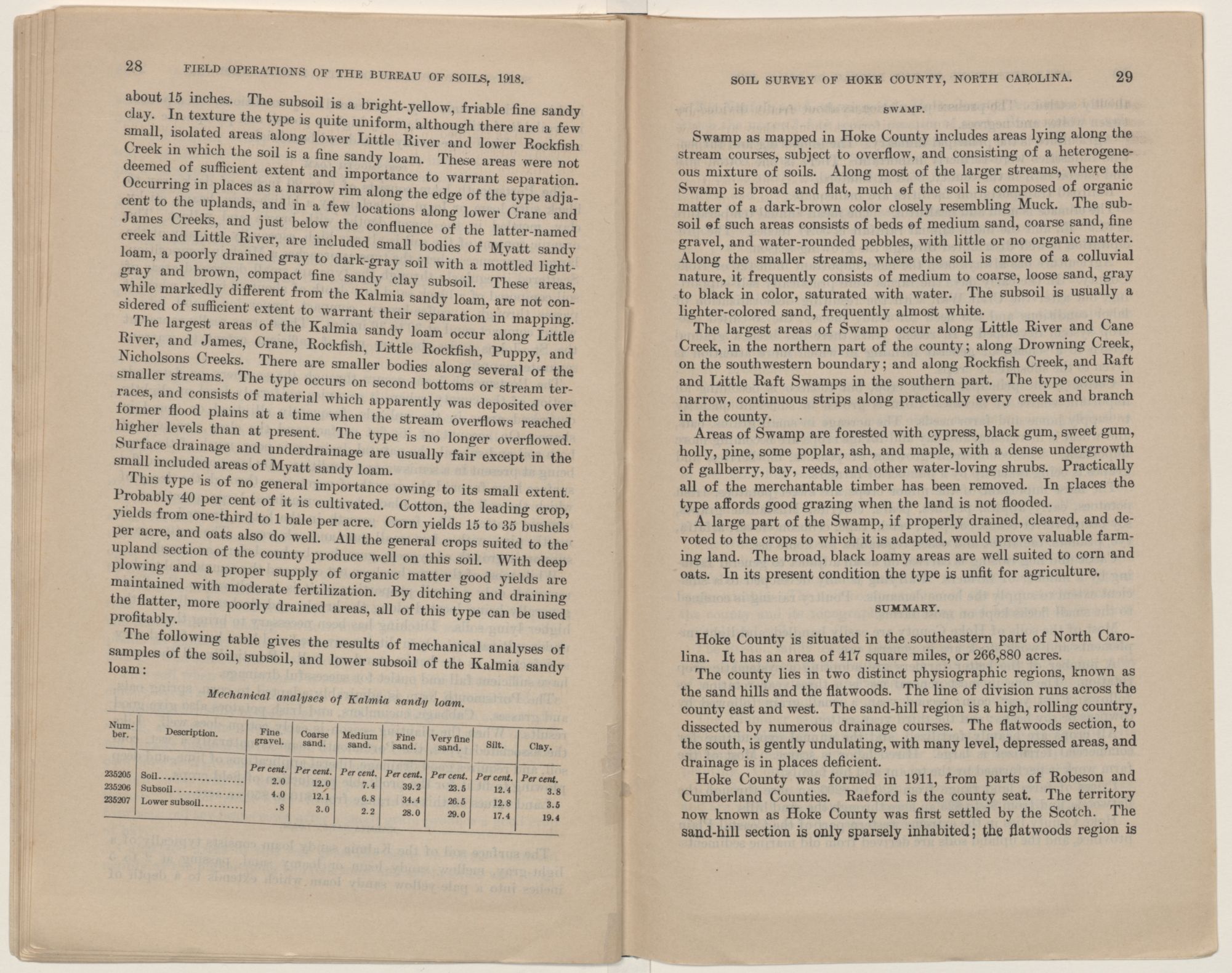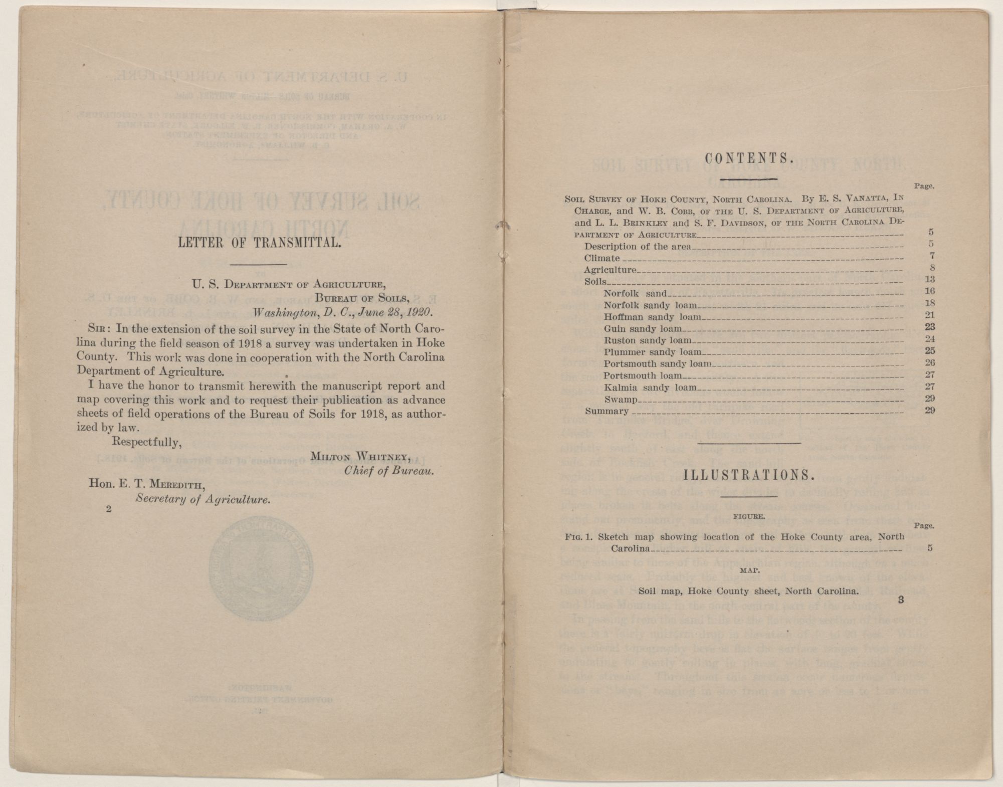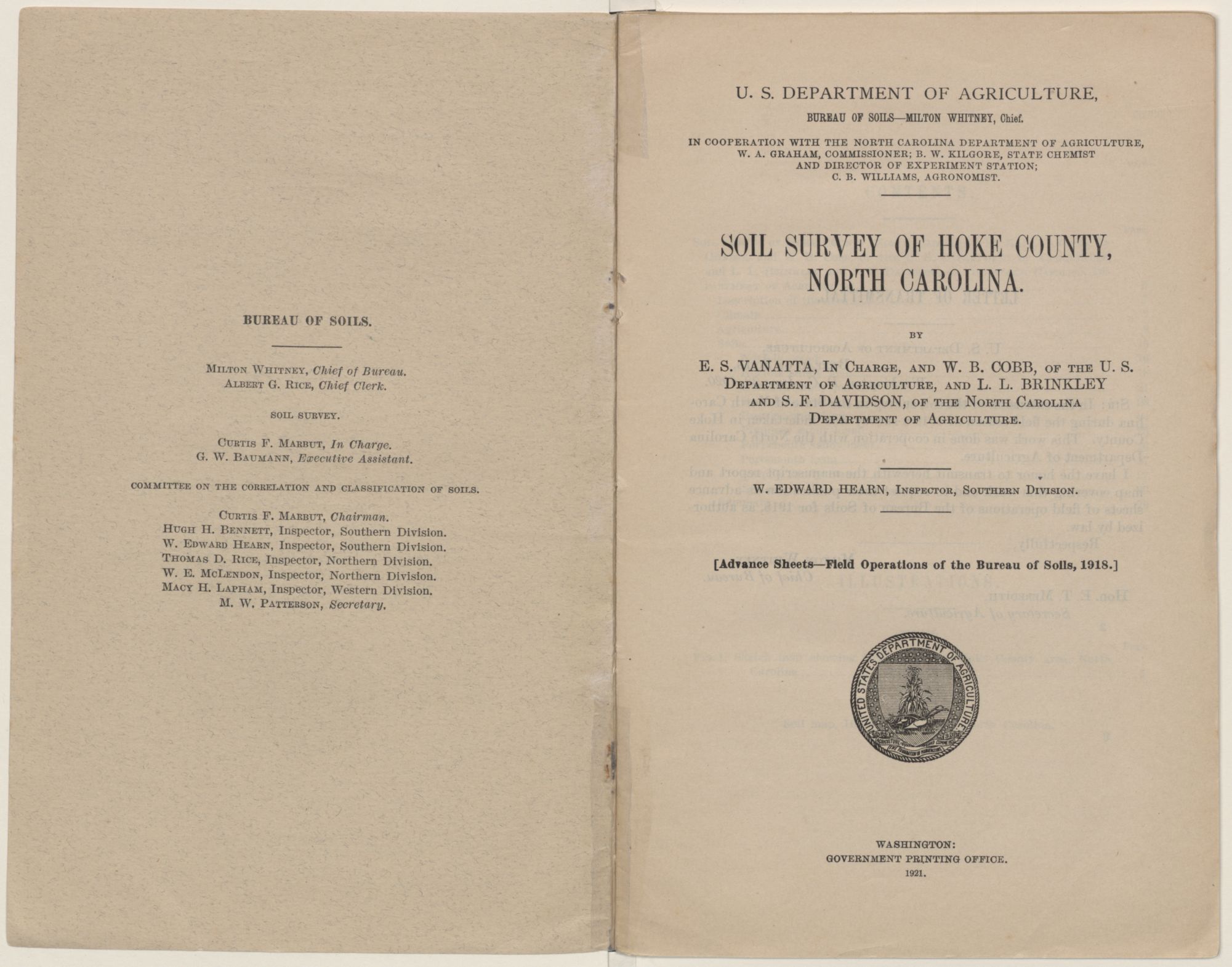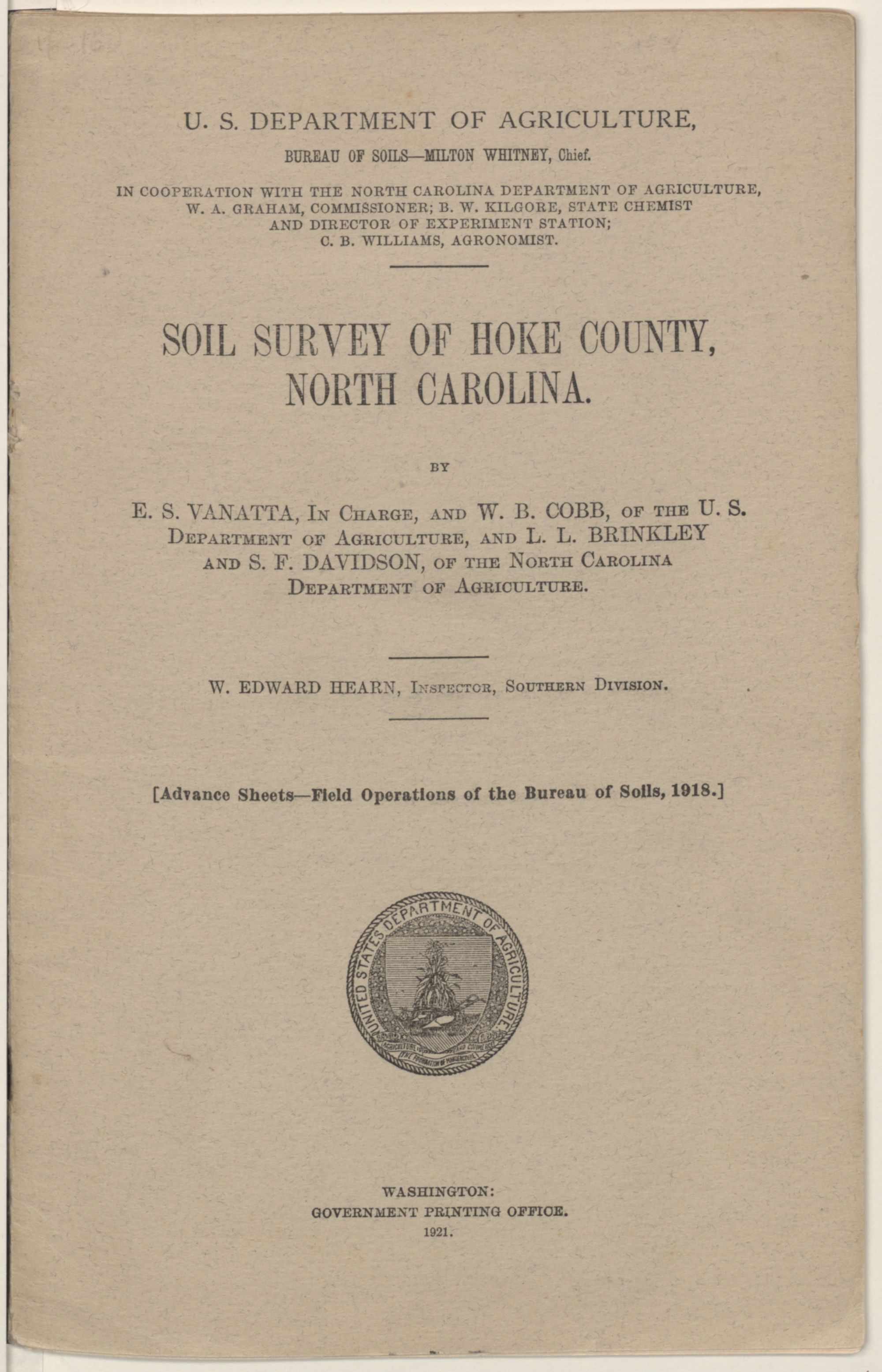 U. S. DEPARTMENT OF AGRICULTURE, BUREAU OF SOILS—MILTON WHITNEY, Chief. IN COOPERATION WITH THE NORTH CAROLINA DEPARTMENT OF AGRICULTURE, W. A. GRAHAM, COMMISSIONER; B. W. KILGORE, STATE CHEMIST AND DIRECTOR OF EXPERIMENT STATION; C. B. WILLIAMS, AGRONOMIST.SOIL SURVEY OF HOKE COUNTY, NORTH CAROLINA.BY E. S. VANATTA, IN CHARGE, AND W. B. COBB, OF THE U. S. DEPARTMENT OF AGRICULTURE, AND L. L. BRINKLEY AND S. F. DAVIDSON, OF THE NORTH CAROLINA DEPARTMENT OF AGRICULTURE.W. EDWARD HEARN, INSPECTOR, SOUTHERN DIVISION. [Advance Sheets—Field Operations of the Bureau of Soils, 1918.]United States Department of Agriculture 1862 Agriculture is the Foundation of Manufacture and Commerce 1889Seal of the United States Department of AgricultureWASHINGTON:GOVERNMENT PRINTING OFFICE.1921.