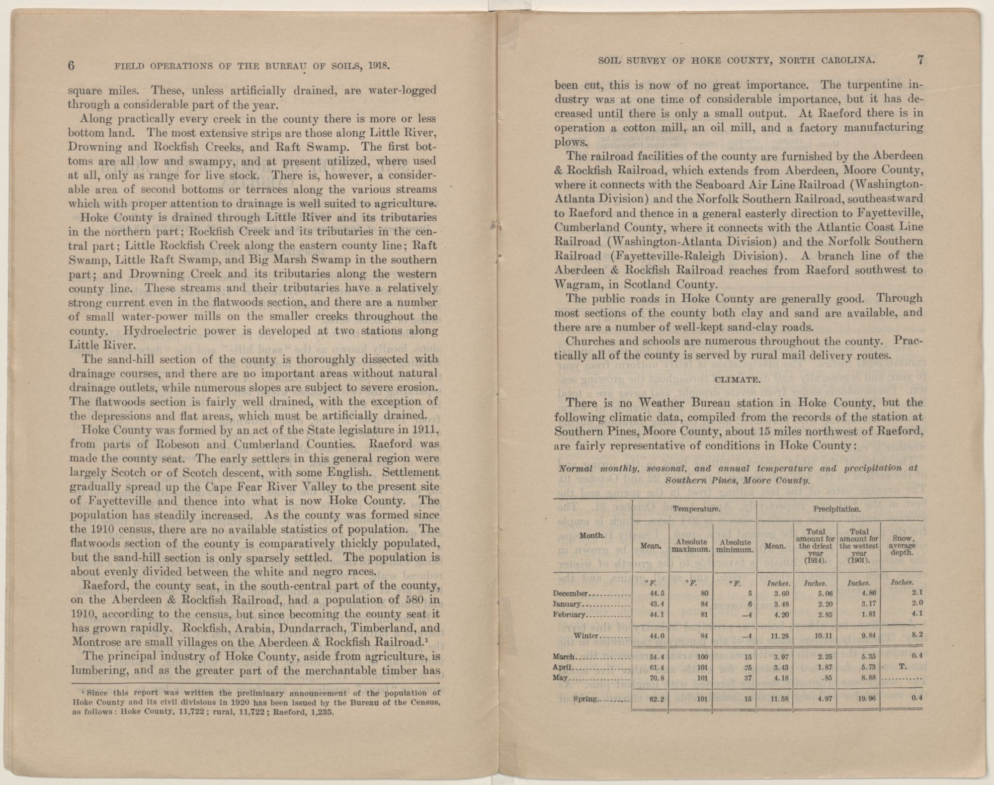 CLIMATE.There is no Weather Bureau station in Hoke County, but the following climatic data, compiled from the records of the station at Southern Pines, Moore County, about 15 miles northwest of Raeford, are fairly representative of conditions in Hoke County: