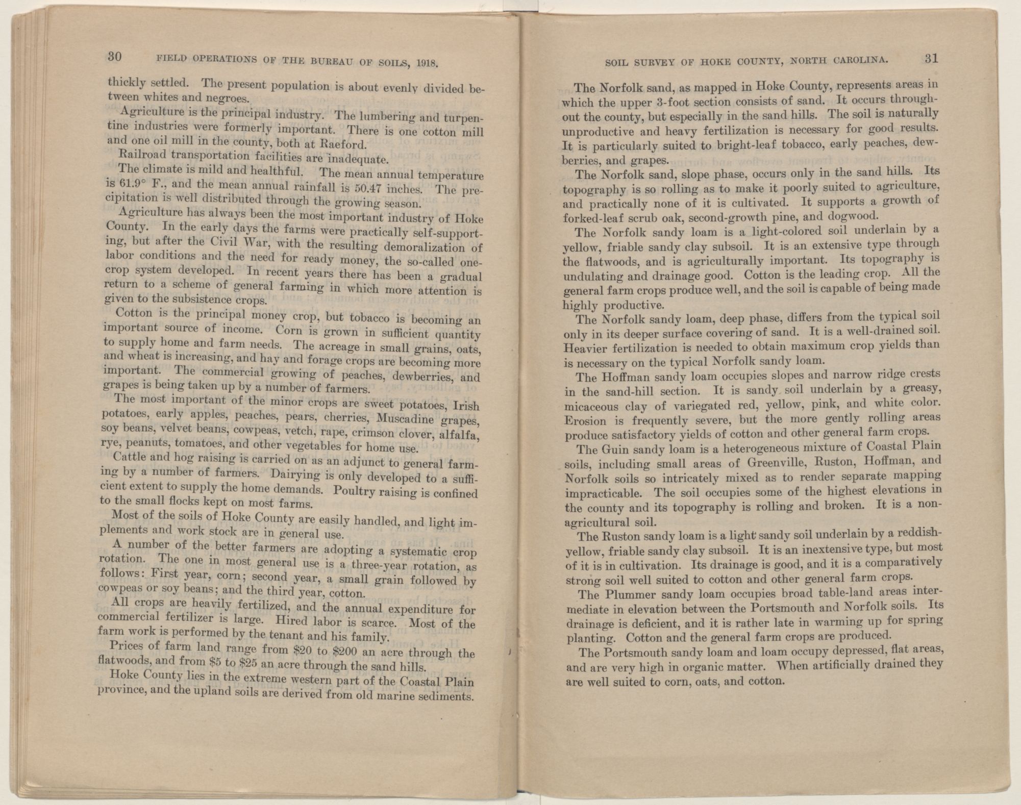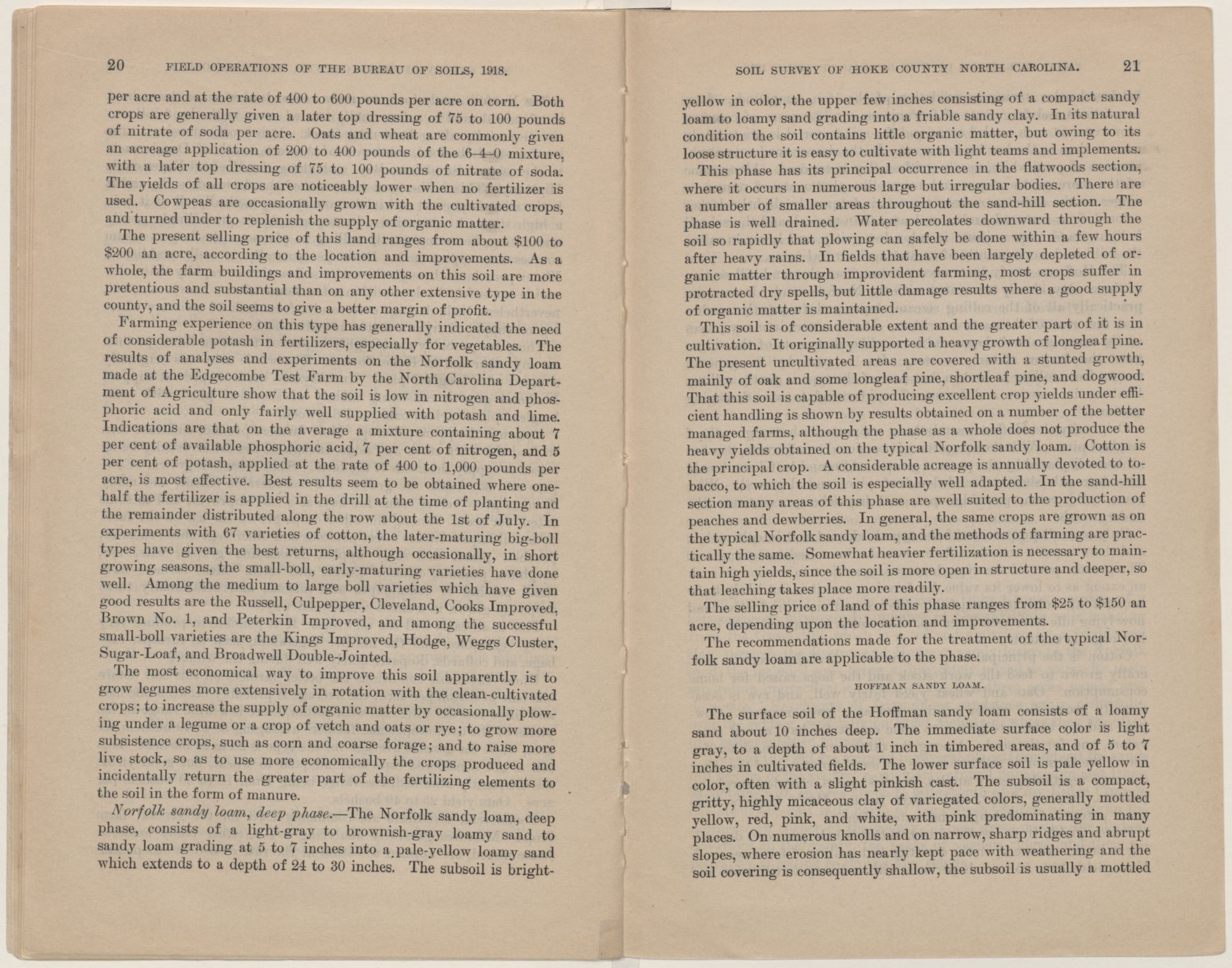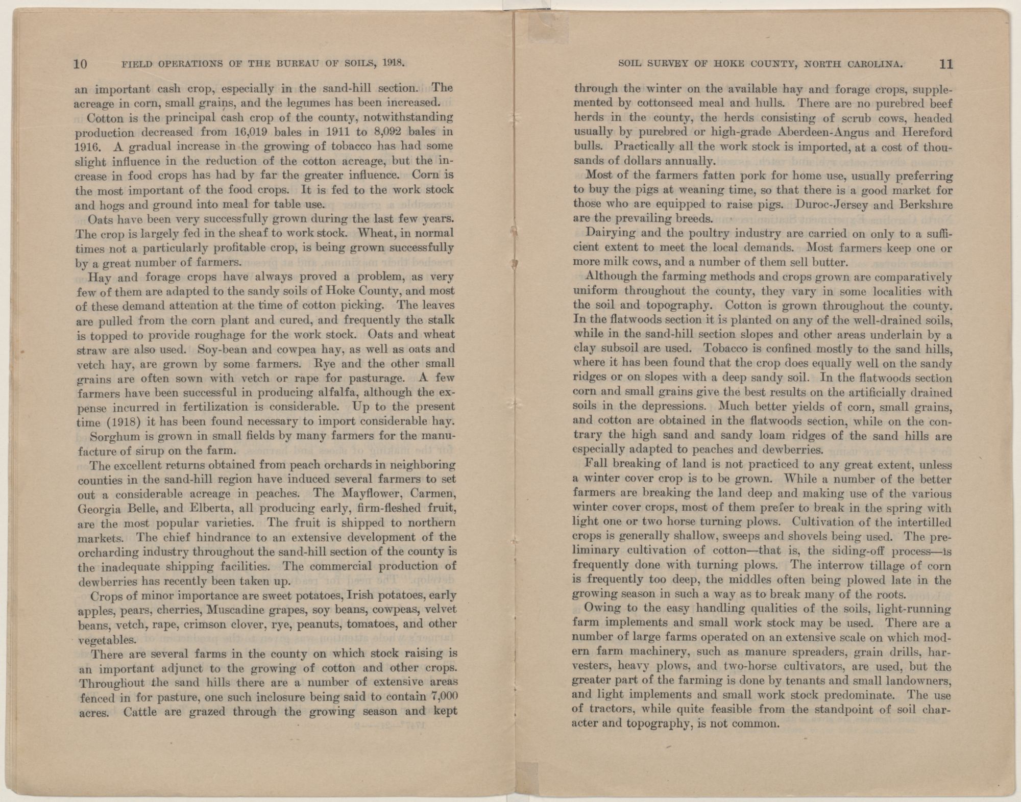 Most of the soils of Hoke County are easily handled, and light implements and work stock are in general use.