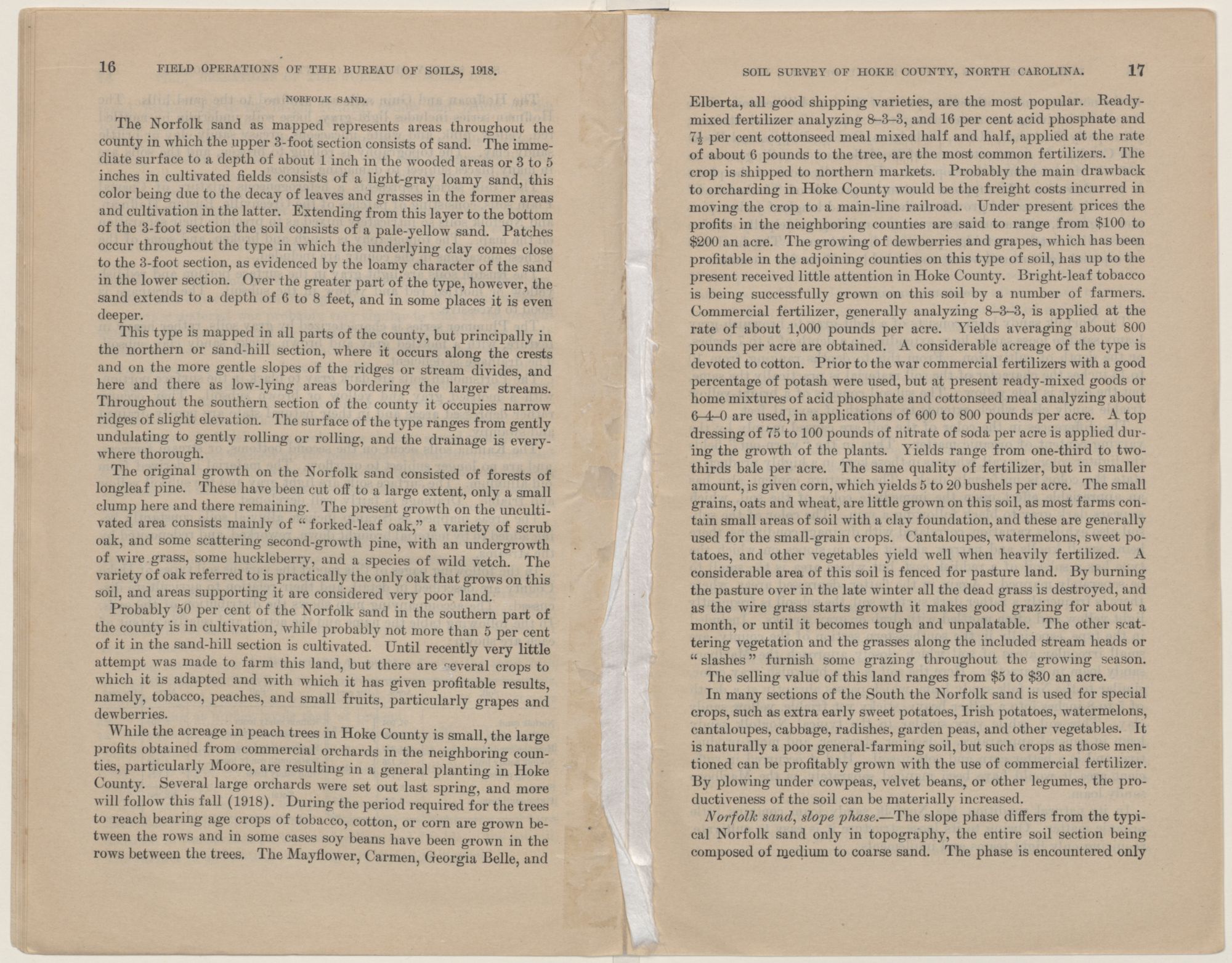 The Norfolk sand, as mapped in Hoke County, represents areas in which the upper 3-foot section consists of sand. It occurs throughout the county, but especially in the sand hills. The soil is naturally unproductive and heavy fertilization is necessary for good results. It is particularly suited to bright-leaf tobacco, early peaches, dewberries, and grapes.