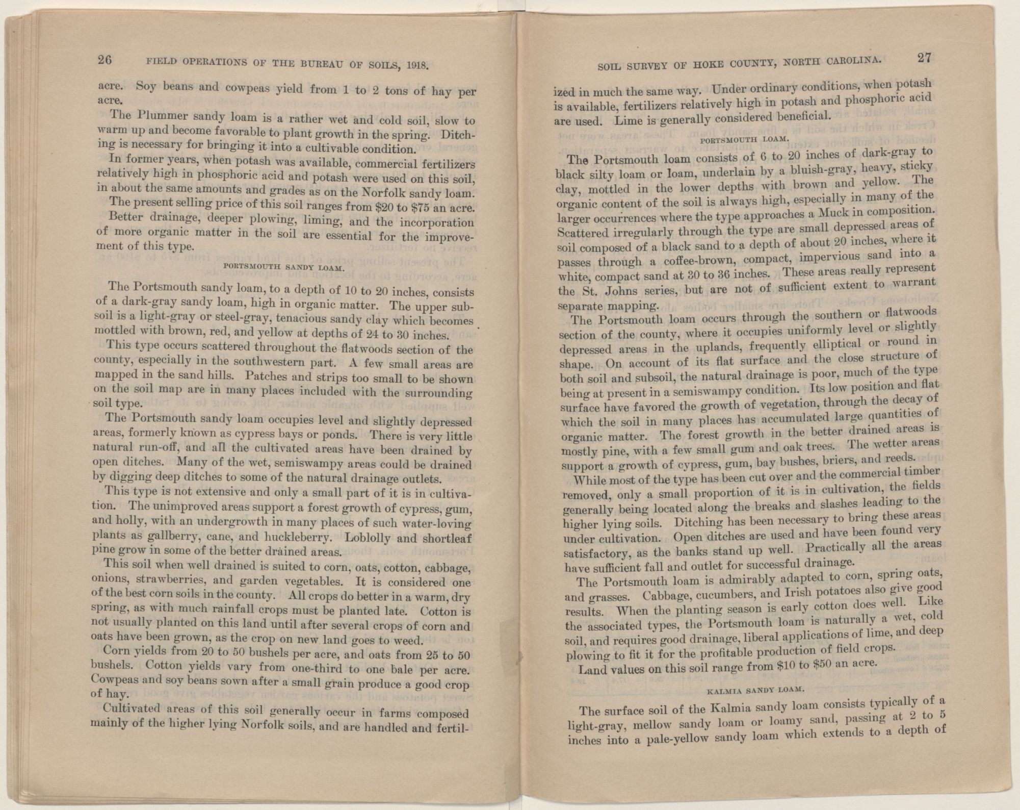The Portsmouth loam is admirably adapted to corn, spring oats, and grasses. Cabbage, cucumbers, and Irish potatoes also give good results. When the planting season is early cotton does well. Like the associated types, the Portsmouth loam is naturally a wet, cold soil, and requires good drainage, liberal applications of lime, and deep plowing to fit it for the profitable production of field crops.