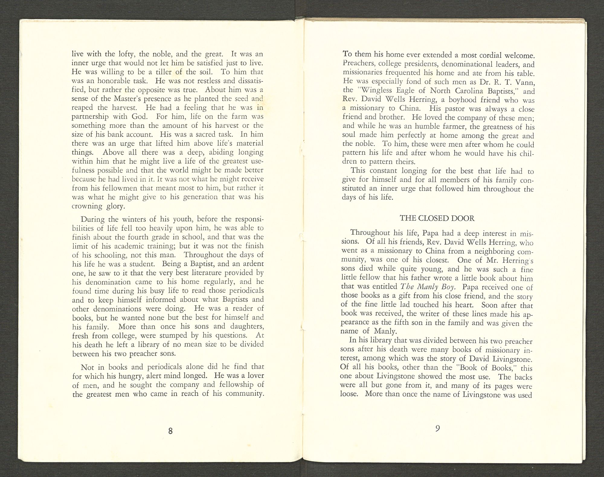 THE CLOSED DOORThroughout his life, Papa had a deep interest in missions. Of all his friends, Rev. David Wells Herring, who went as a missionary to China from a neighboring community, was one of his closest. One of Mr. Herring's sons died while quite young, and he was such a fine little fellow that his father wrote a little book about him that was entitled The Manly Boy. Papa received one of those books as a gift from his close friend, and the story of the fine little lad touched his heart. Soon after that book was received, the writer of these lines made his appearance as the fifth son in the family and was given the name of Manly.