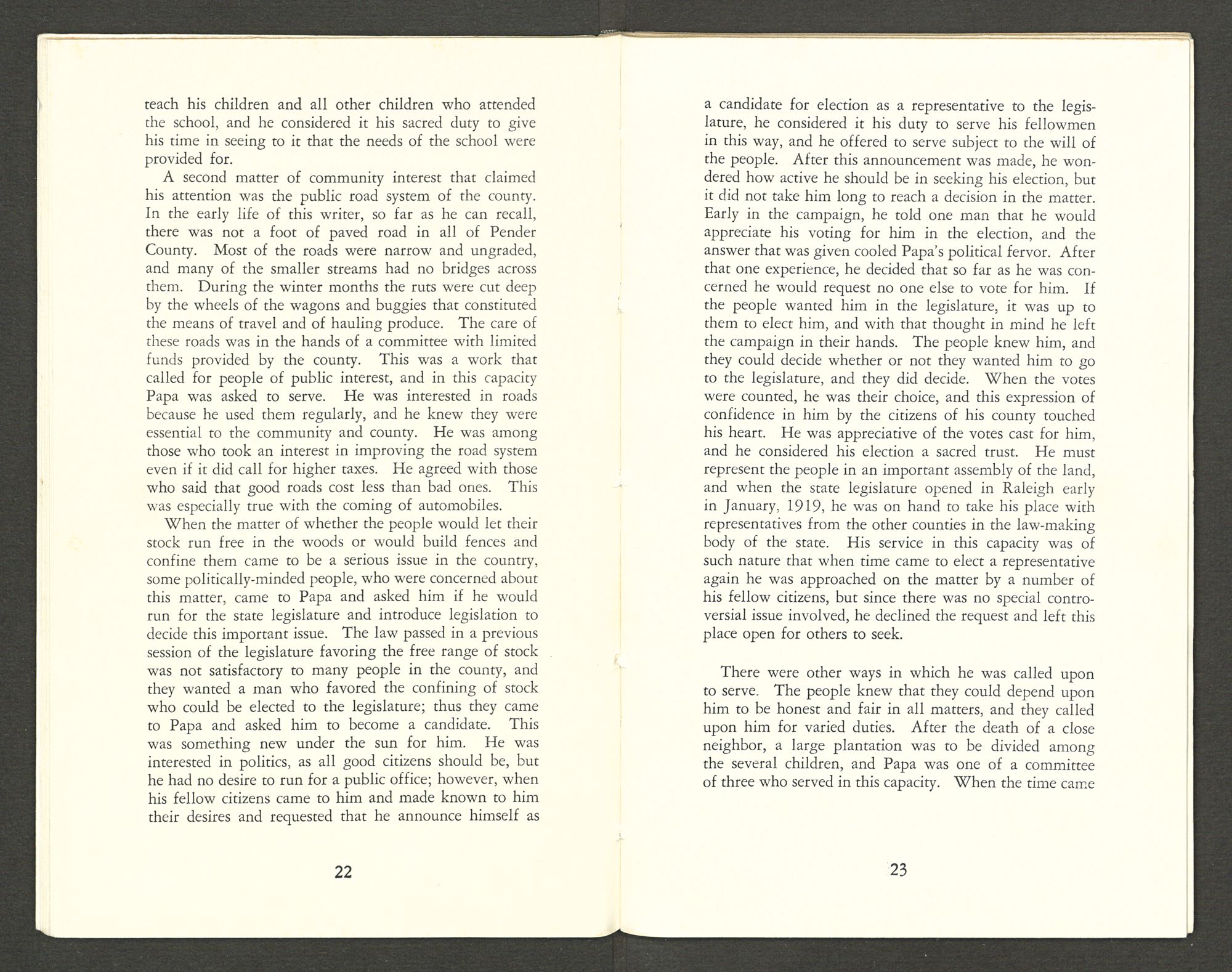 This one about whom these lines are written did not come to be known as a national leader. His name will not be found in any hall of fame, and he was not listed in Who's Who in America. He was an humble man who lived an humble life, unknown by many who are called great. He entered no institution of learning from which he could receive a diploma or degree of honor. To begin with, his sphere of opportunity was limited. He took his place on a small farm in Pender County in Eastern North Carolina, and there he lingered as a faithful tiller of the soil through his threescore years and ten. Yes, there he remained, and there he labored and toiled with his devoted companion to rear and to provide for his family; but while this man labored with his hands from daylight until dusk, and while he lingered close at home in his community, there was something about him surging in his heart and mind that lifted him out of his limited surroundings and circumstances and made him to