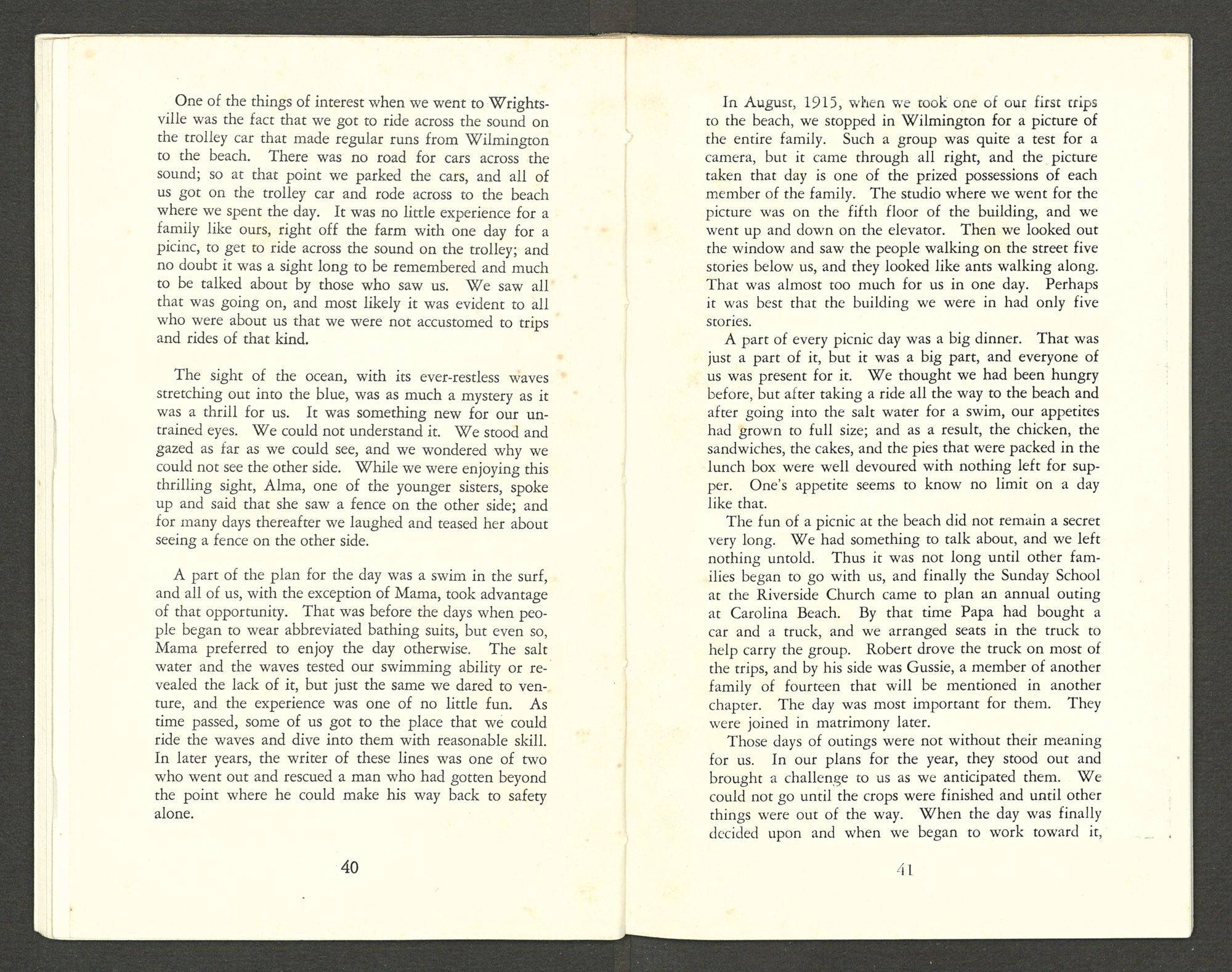 The following pages are written in an effort to relate in a simple way some of the interesting things about two humble and consecrated servants of the Lord who dared to attempt in the education of their children what to many people would have been the impossible. We refer affectionately to Papa and Mama, who were known to their many friends, apart from the members of their family, as Reverend and Mrs. J. D. Hocutt of Burgaw, North Carolina.