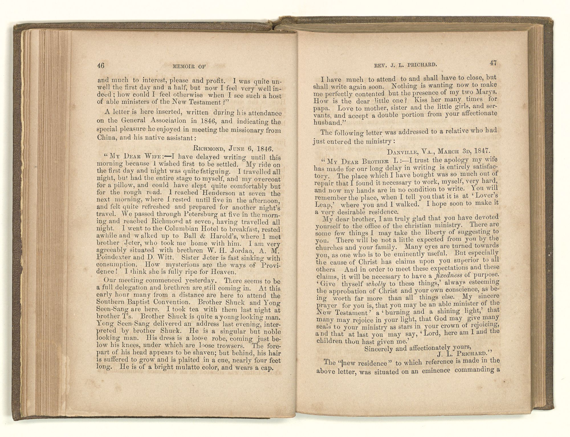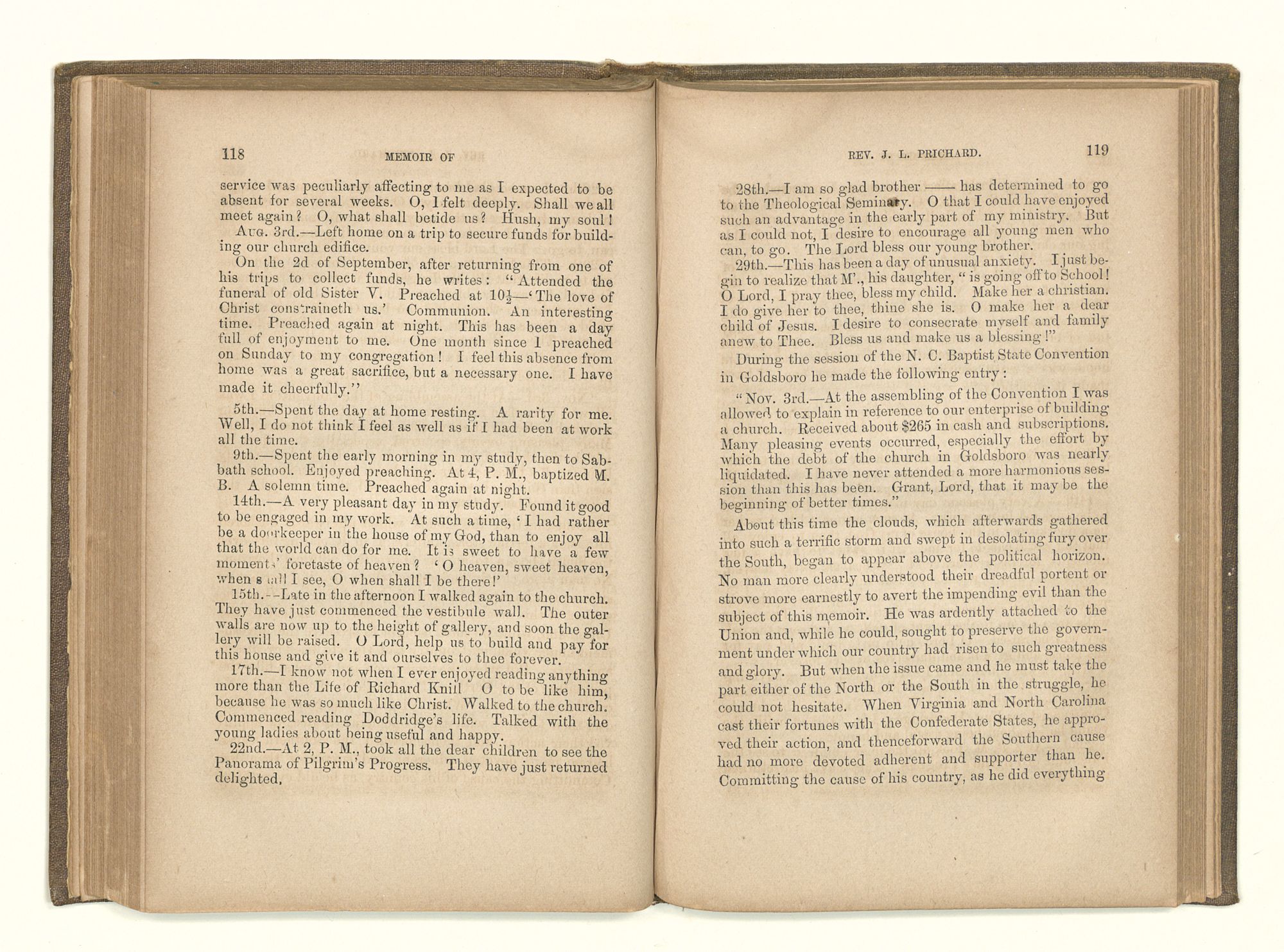 “I will cite an instance in illustration of this point. It has long been the rule of the Virginia Baptist Education Board, to require of each beneficiary a bond for the amount furnished him, payable, however, only when he should feel himself able to pay it. Mr. Prichard was opposed to this plan. He had lively recollections of his own experience in securing an education, and his sympathy for the student for the ministry had almost a motherly tenderness. Hence, while no man on earth would have been prompter or more certain to pay such a claim, he yet thought that it ought not, even in the mildest form, to be held over the young minister; but that the churches should send him forth to his work, debt-free.