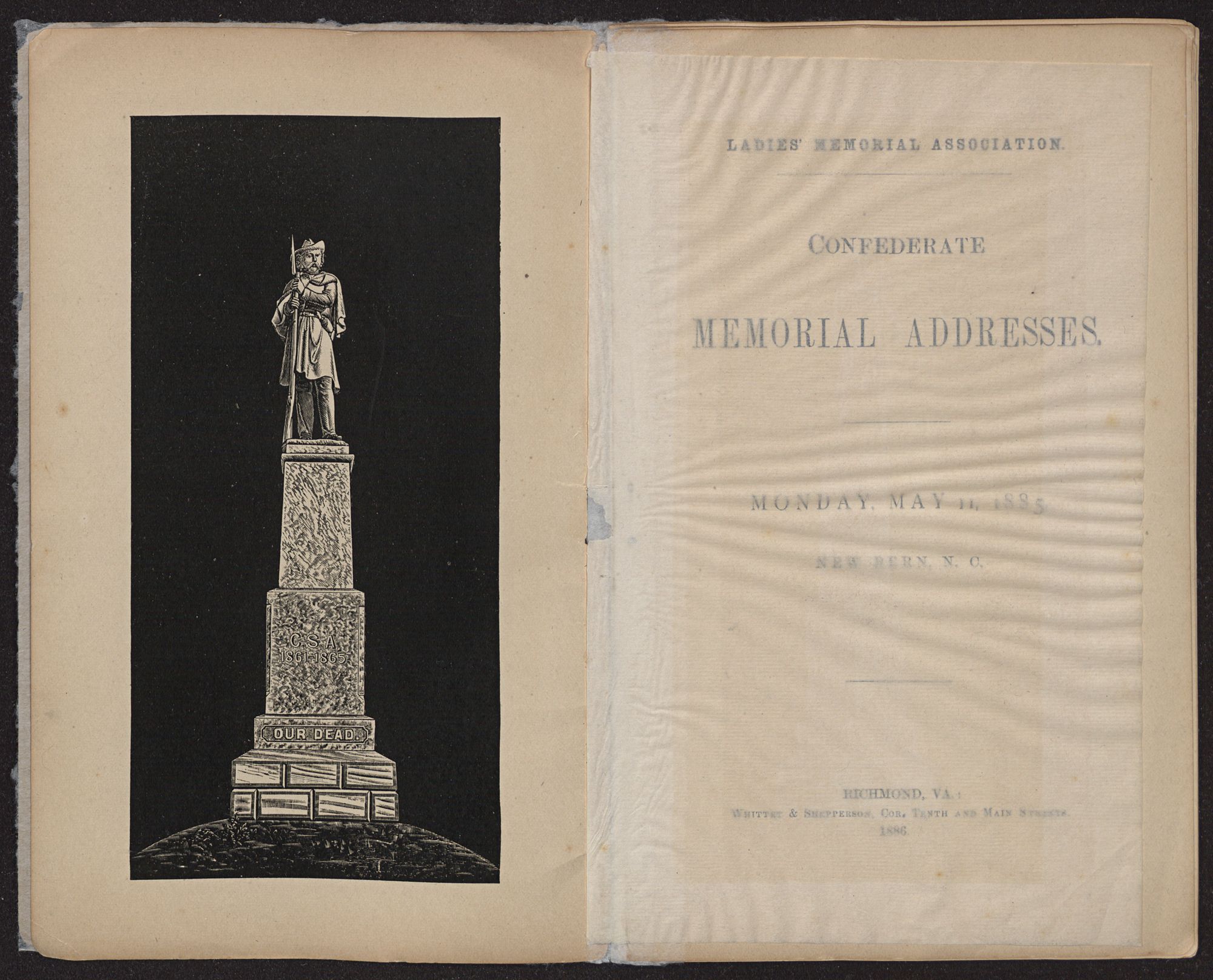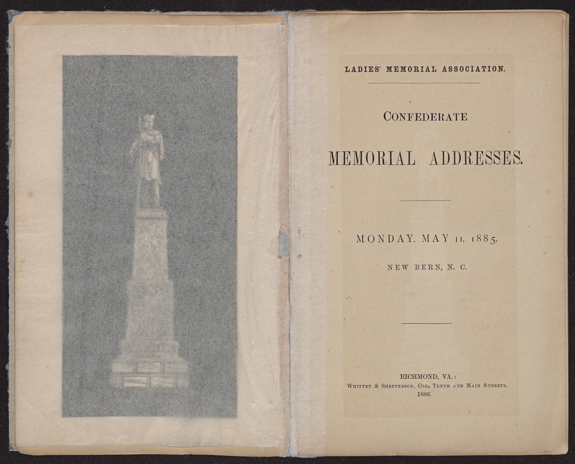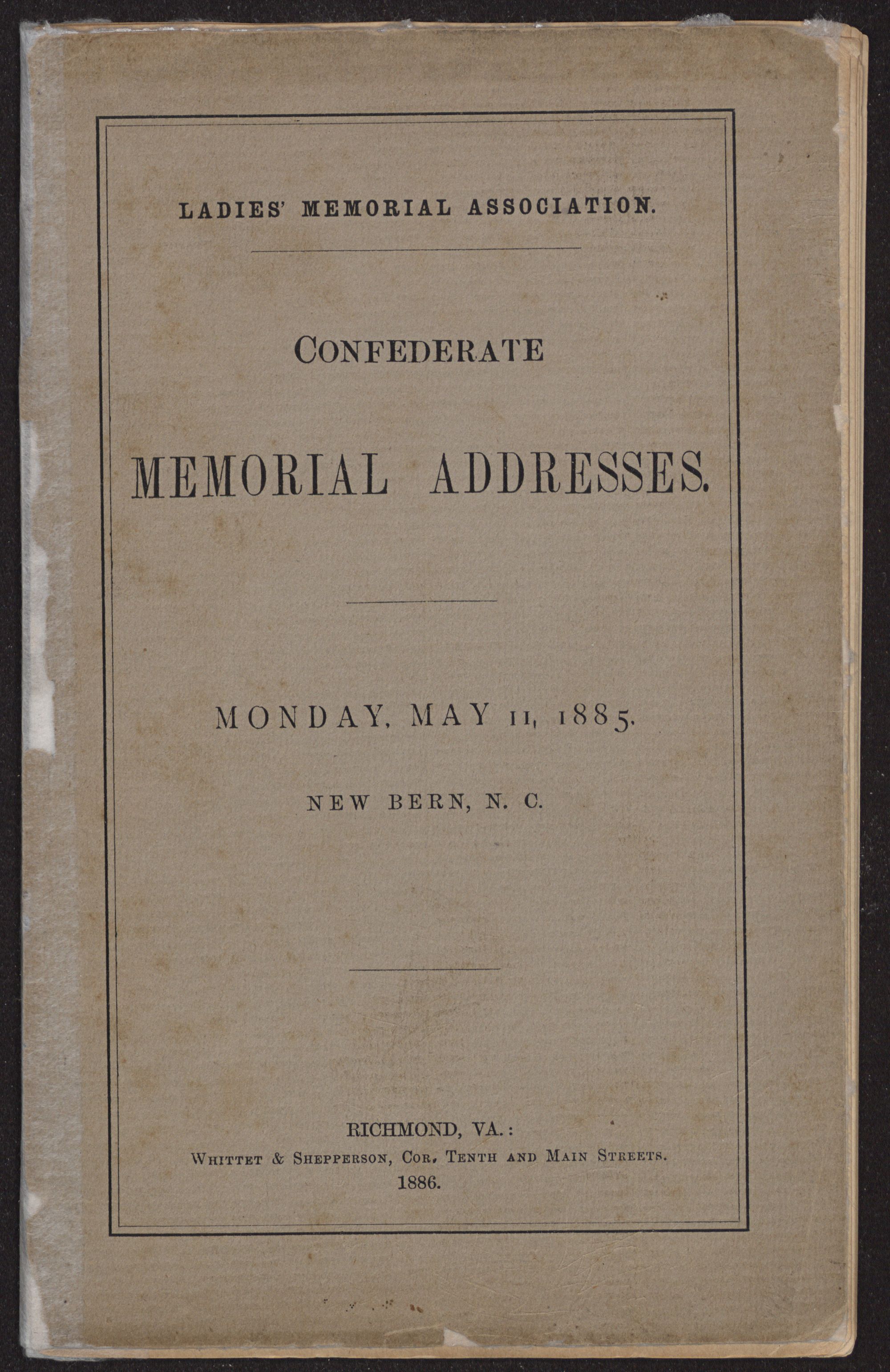 LADIES’ MEMORIAL ASSOCIATION. CONFEDERATEMEMORIAL ADDRESSES.MONDAY, MAY 11, 1885.NEW BERN, N. C.RICHMOND, VA.:Whittet & Shepperson, Cor. Tenth and Main Streets.1886.
