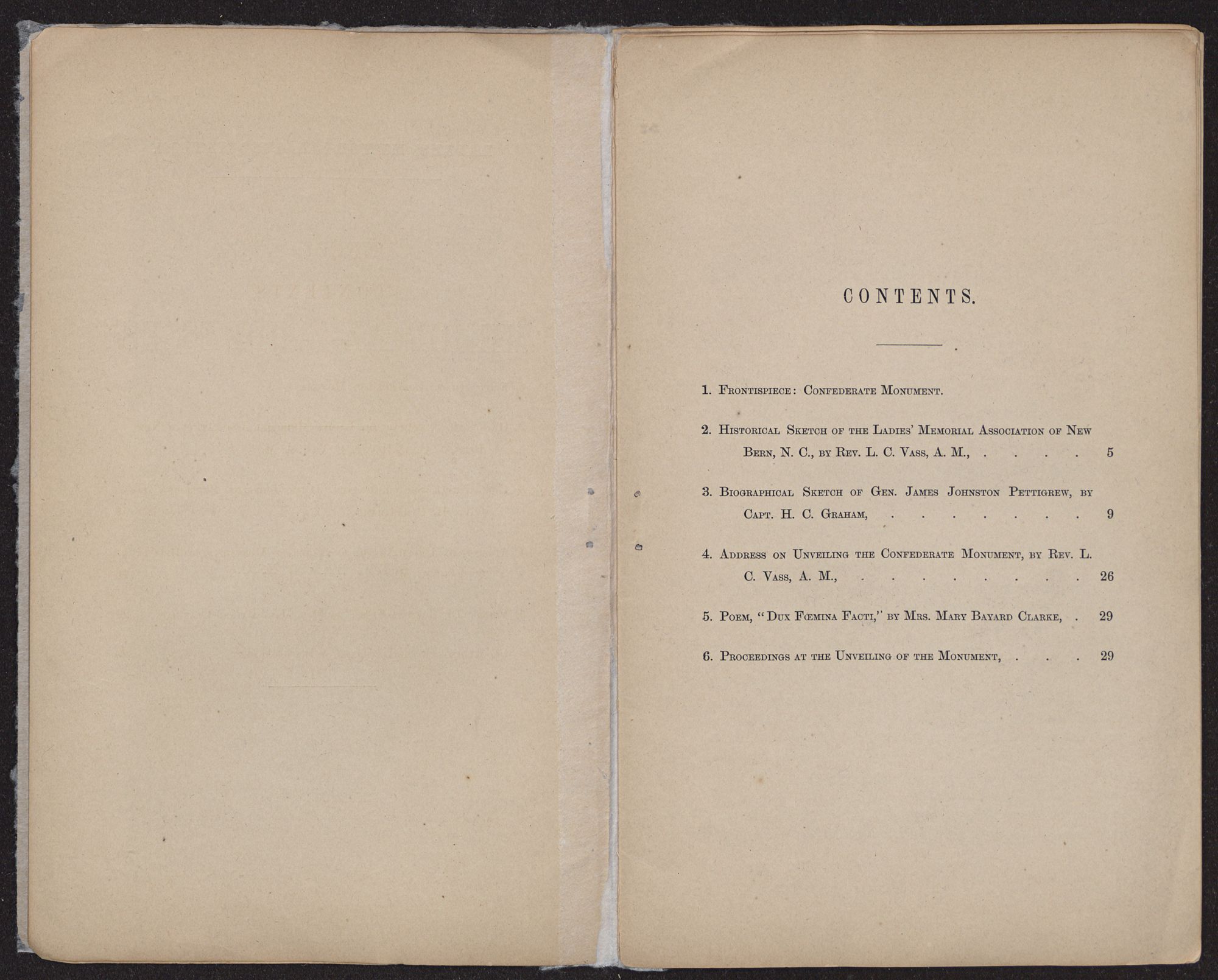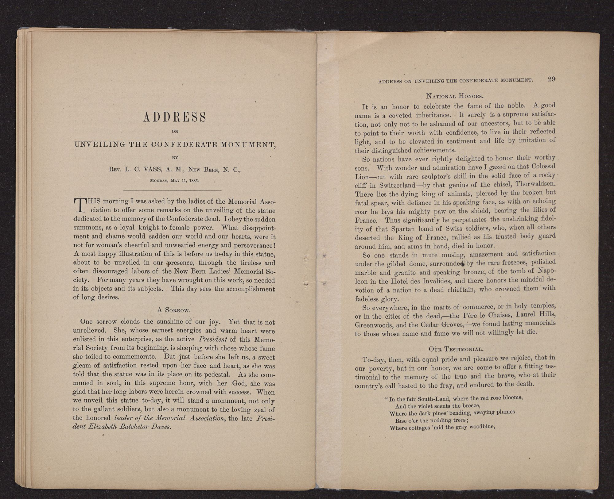 | 4. | Address on Unveiling the Confederate Monument, by Rev. L. C. Vass, A. M., | 26 |