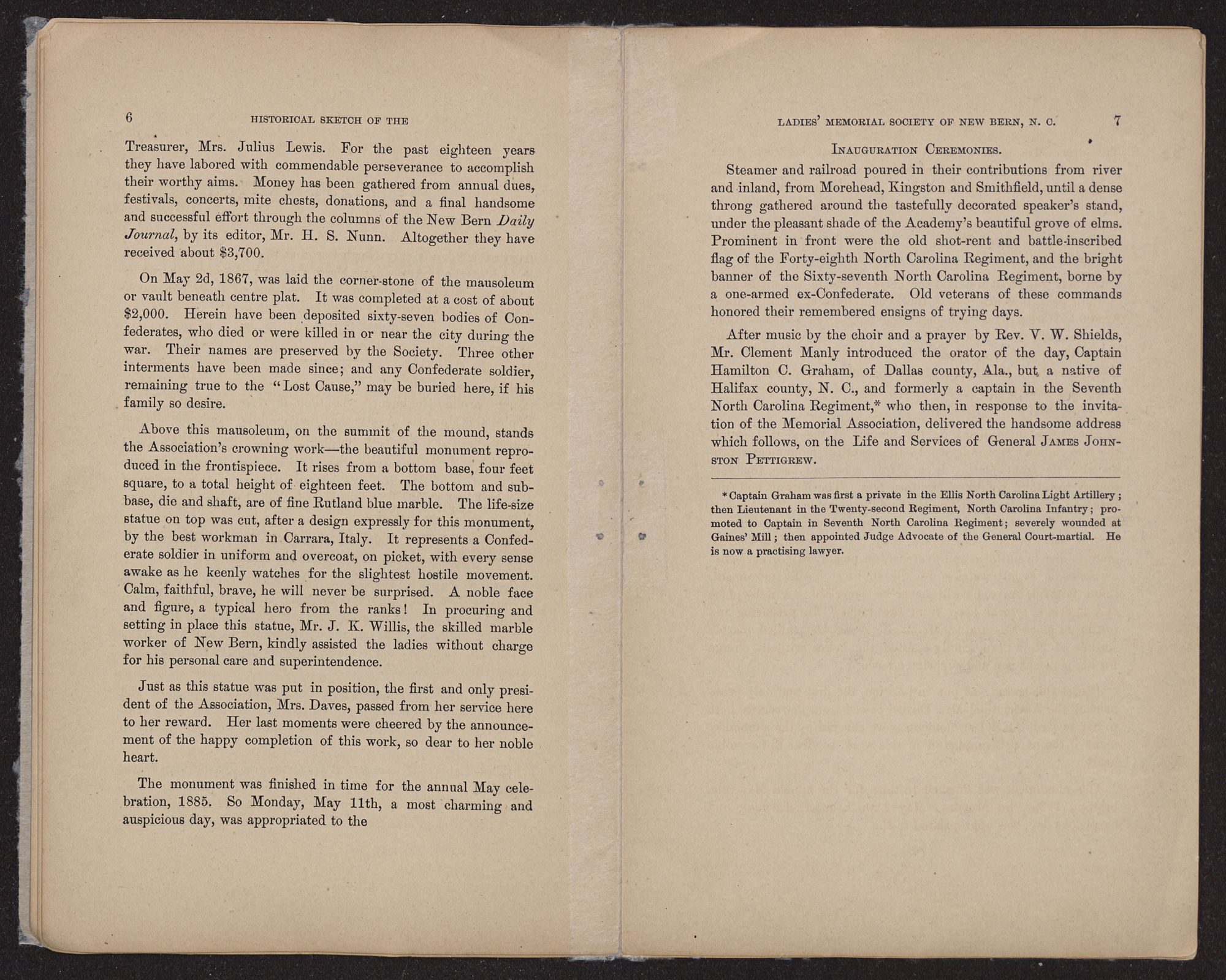 Treasurer, Mrs. Julius Lewis. For the past eighteen years they have labored with commendable perseverance to accomplish their worthy aims. Money has been gathered from annual dues, festivals, concerts, mite chests, donations, and a final handsome and successful effort through the columns of the New Bern Daily Journal, by its editor, Mr. H. S. Nunn. Altogether they have received about $3,700.