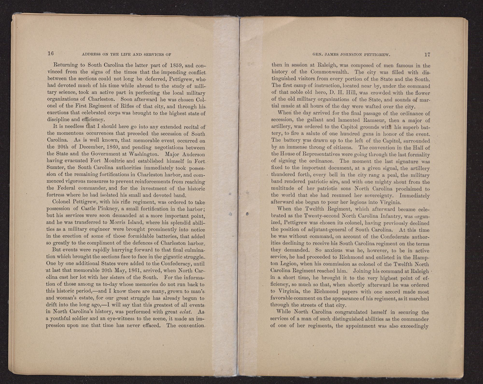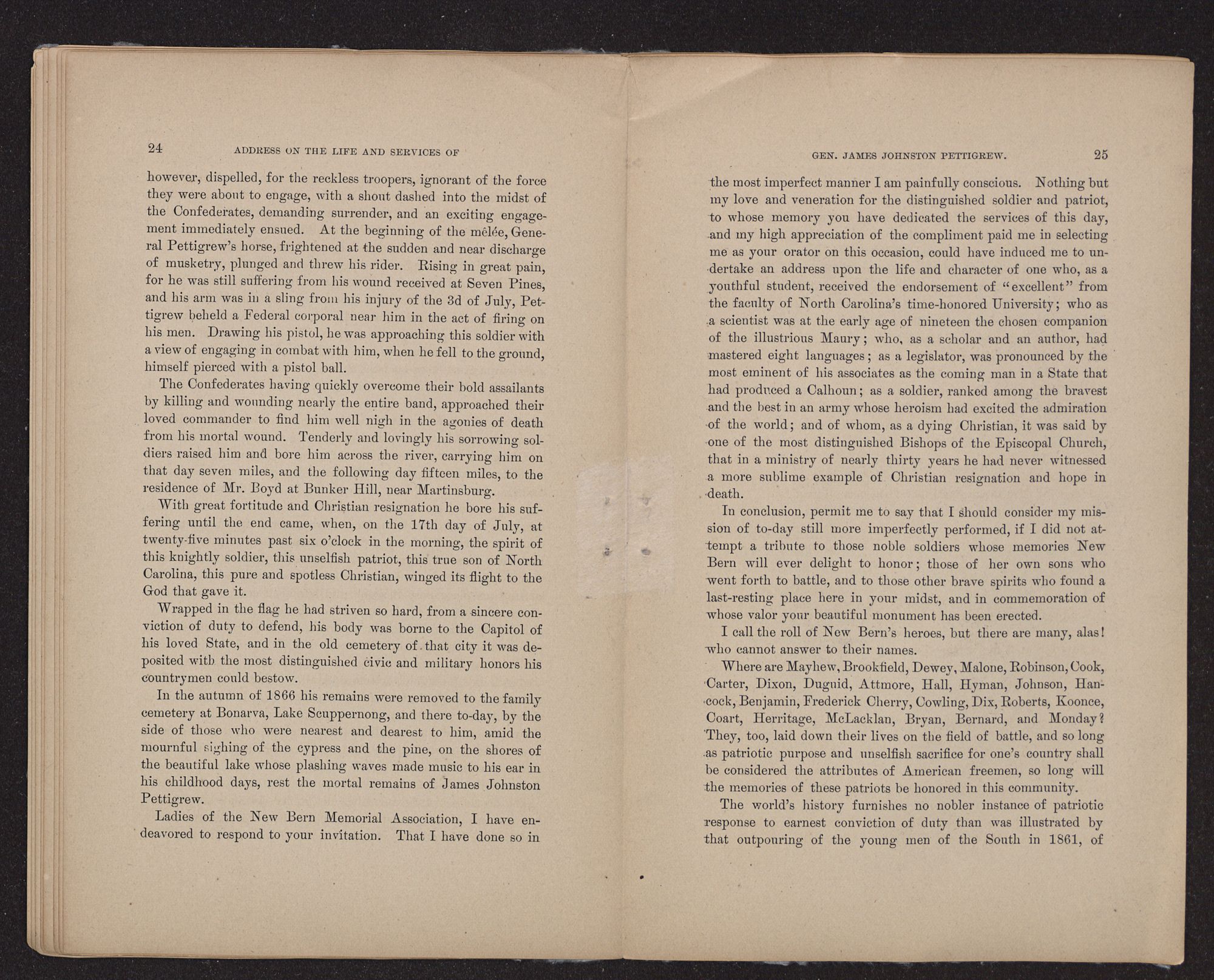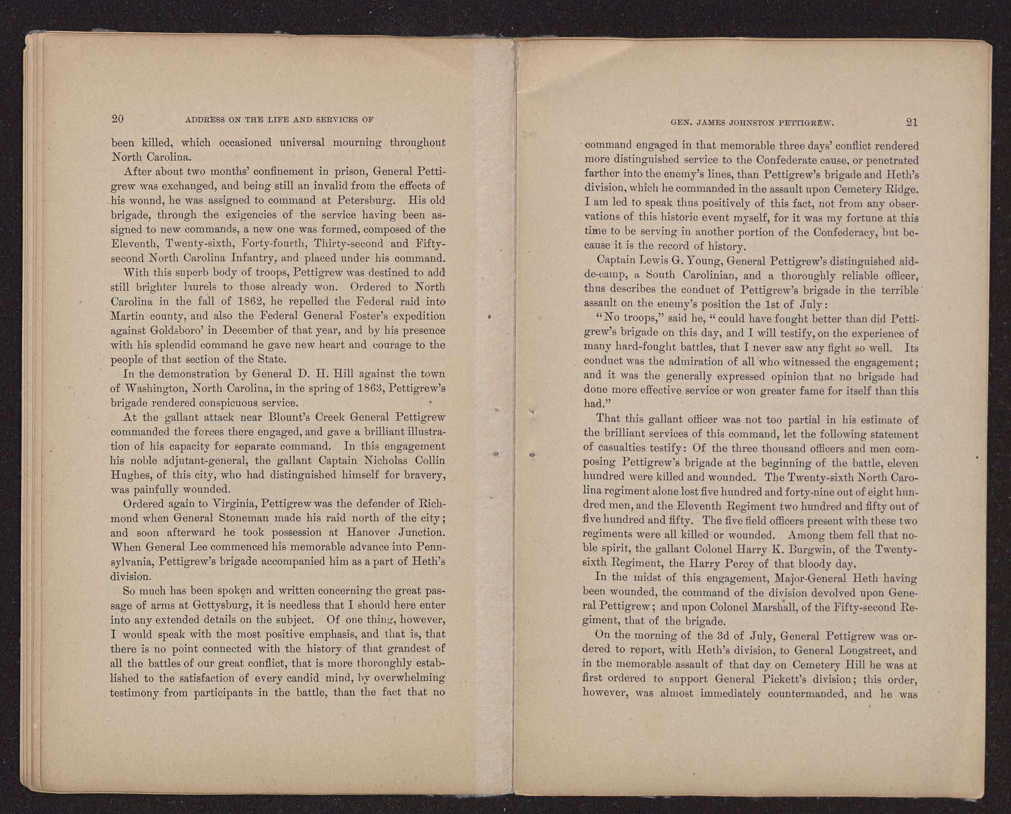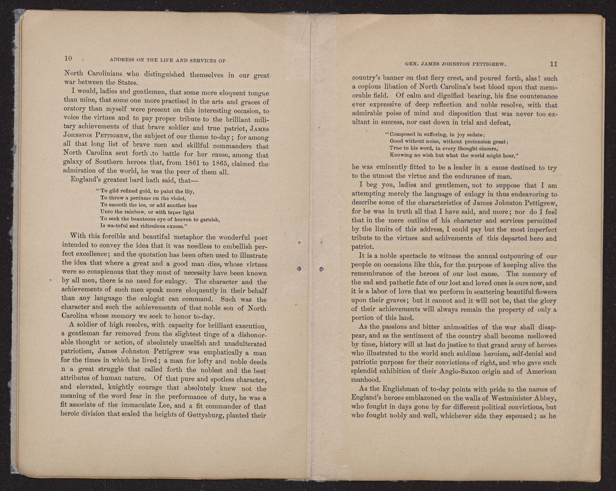 I would, ladies and gentlemen, that some more eloquent tongue than mine, that some one more practised in the arts and graces of oratory than myself were present on this interesting occasion, to voice the virtues and to pay proper tribute to the brilliant military achievements of that brave soldier and true patriot, James Johnston Pettigrew, the subject of our theme to-day; for among all that long list of brave men and skillful commanders that North Carolina sent forth to battle for her cause, among that galaxy of Southern heroes that, from 1861 to 1865, claimed the admiration of the world, he was the peer of them all.
