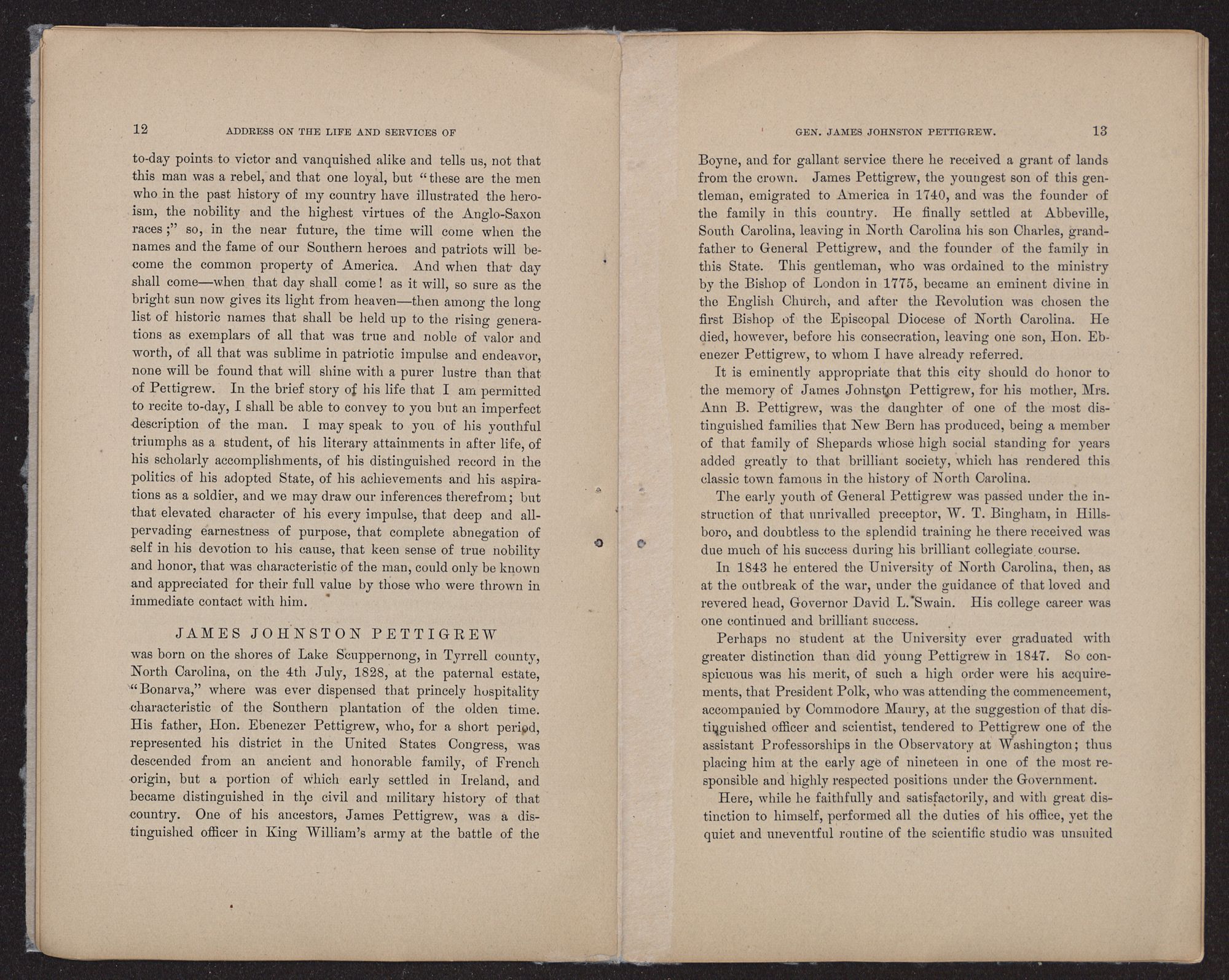 Boyne, and for gallant service there he received a grant of lands from the crown. James Pettigrew, the youngest son of this gentleman, emigrated to America in 1740, and was the founder of the family in this country. He finally settled at Abbeville, South Carolina, leaving in North Carolina his son Charles, grandfather to General Pettigrew, and the founder of the family in this State. This gentleman, who was ordained to the ministry by the Bishop of London in 1775, became an eminent divine in the English Church, and after the Revolution was chosen the first Bishop of the Episcopal Diocese of North Carolina. He died, however, before his consecration, leaving one son, Hon. Ebenezer Pettigrew, to whom I have already referred.