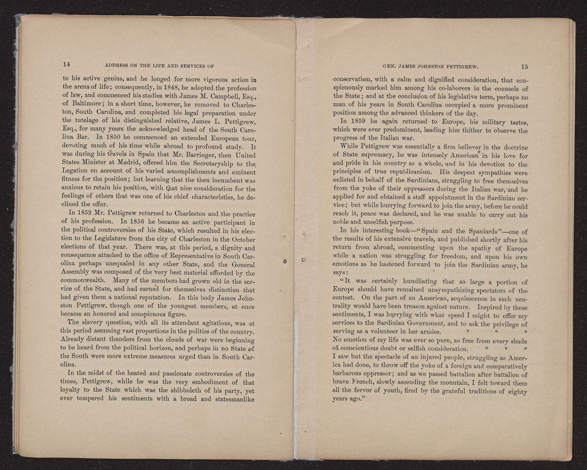 While Pettigrew was essentially a firm believer in the doctrine of State supremacy, he was intensely American in his love for and pride in his country as a whole, and in his devotion to the principles of true republicanism. His deepest sympathies were enlisted in behalf of the Sardinians, struggling to free themselves from the yoke of their oppressors during the Italian war, and he applied for and obtained a staff appointment in the Sardinian service; but while hurrying forward to join the army, before he could reach it, peace was declared, and he was unable to carry out his noble and unselfish purpose.