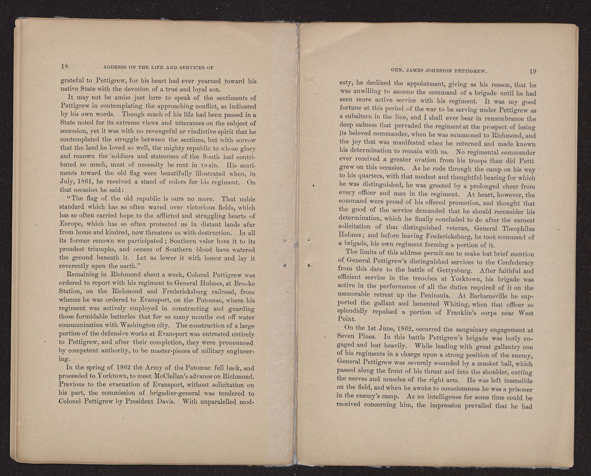 On the 1st June, 1862, occurred the sanguinary engagement at Seven Pines. In this battle Pettigrew's brigade was hotly engaged and lost heavily. While leading with great gallantry one of his regiments in a charge upon a strong position of the enemy, General Pettigrew was severely wounded by a musket ball, which passed along the front of his throat and into the shoulder, cutting the nerves and muscles of the right arm. He was left insensible on the field, and when he awoke to consciousness he was a prisoner in the enemy's camp. As no intelligence for some time could be received concerning him, the impression prevailed that he had