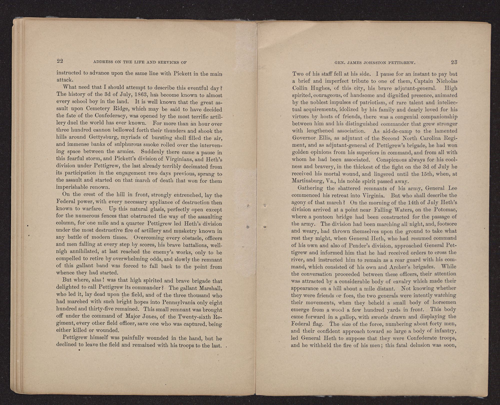 Two of his staff fell at his side. I pause for an instant to pay but a brief and imperfect tribute to one of them, Captain Nicholas Collin Hughes, of this city, his brave adjutant-general. High spirited, courageous, of handsome and dignified presence, animated by the noblest impulses of patriotism, of rare talent and inteliectual acquirements, idolized by his family and dearly loved for his virtues by hosts of friends, there was a congenial companionship between him and his distinguished commander that grew stronger with lengthened association. As aid-de-camp to the lamented Governor Ellis, as adjutant of the Second North Carolina Regiment, and as adjutant-general of Pettigrew's brigade, he had won golden opinions from his superiors in command, and from all with whom he had been associated. Conspicuous always for his coolness and bravery, in the thickest of the fight on the 3d of July he received his mortal wound, and lingered until the 15th, when, at Martinsburg, Va., his noble spirit passed away.