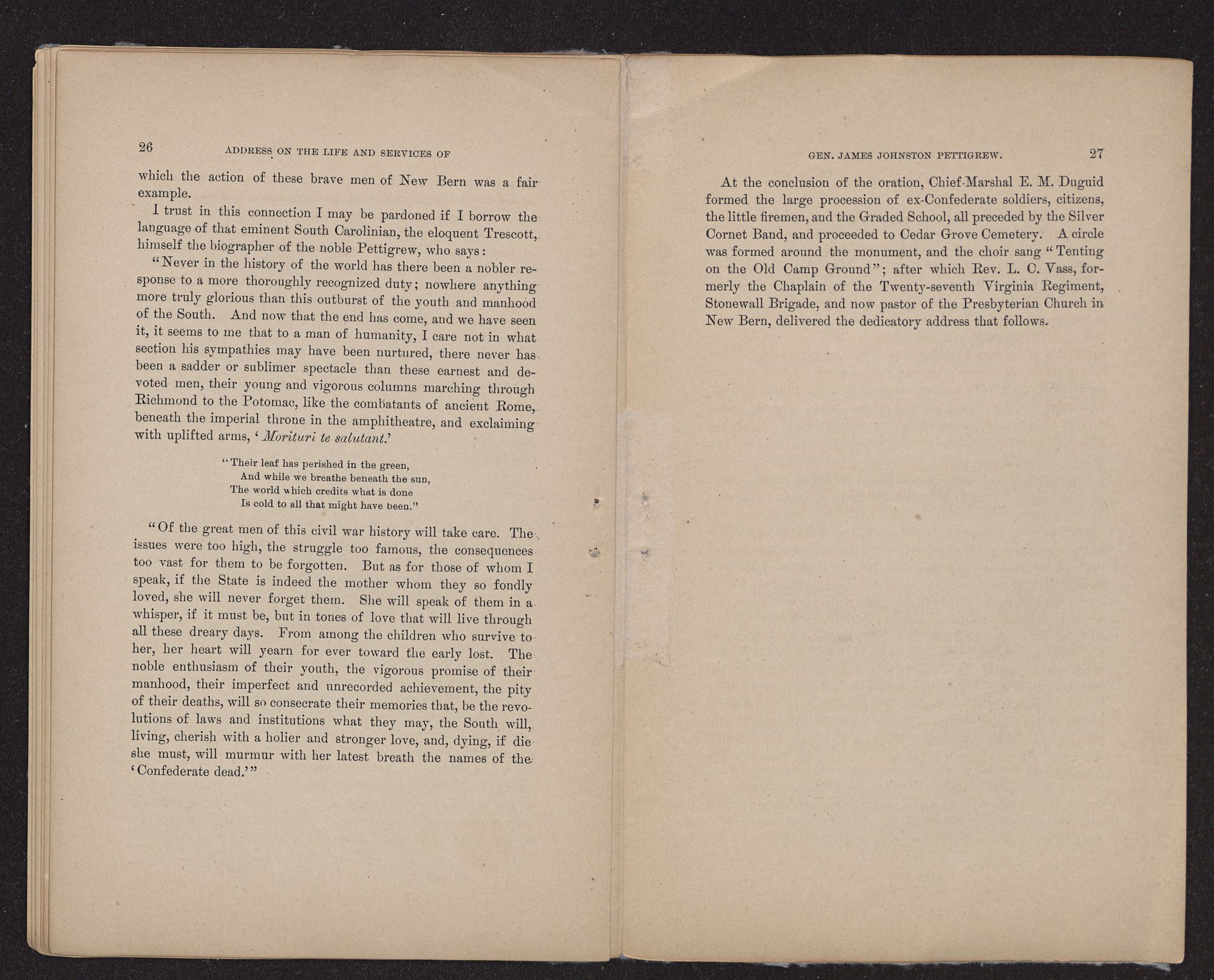 At the conclusion of the oration, Chief-Marshal E. M. Duguid formed the large procession of ex-Confederate soldiers, citizens, the little firemen, and the Graded School, all preceded by the Silver Cornet Band, and proceeded to Cedar Grove Cemetery. A circle was formed around the monument, and the choir sang “Tenting on the Old Camp Ground”; after which Rev. L. C. Vass, formerly the Chaplain of the Twenty-seventh Virginia Regiment, Stonewall Brigade, and now pastor of the Presbyterian Church in New Bern, delivered the dedicatory address that follows.