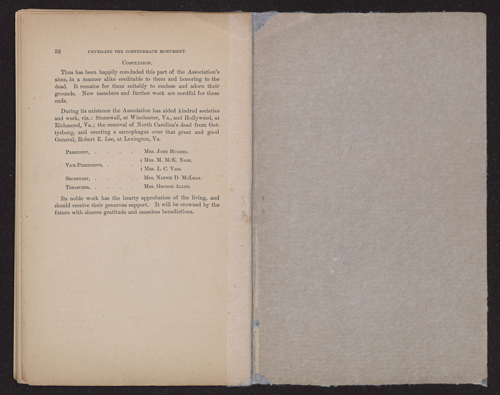 Thus has been happily concluded this part of the Association's aims, in a manner alike creditable to them and honoring to the dead. It remains for them suitably to enclose and adorn their grounds. New members and further work are needful for these ends.