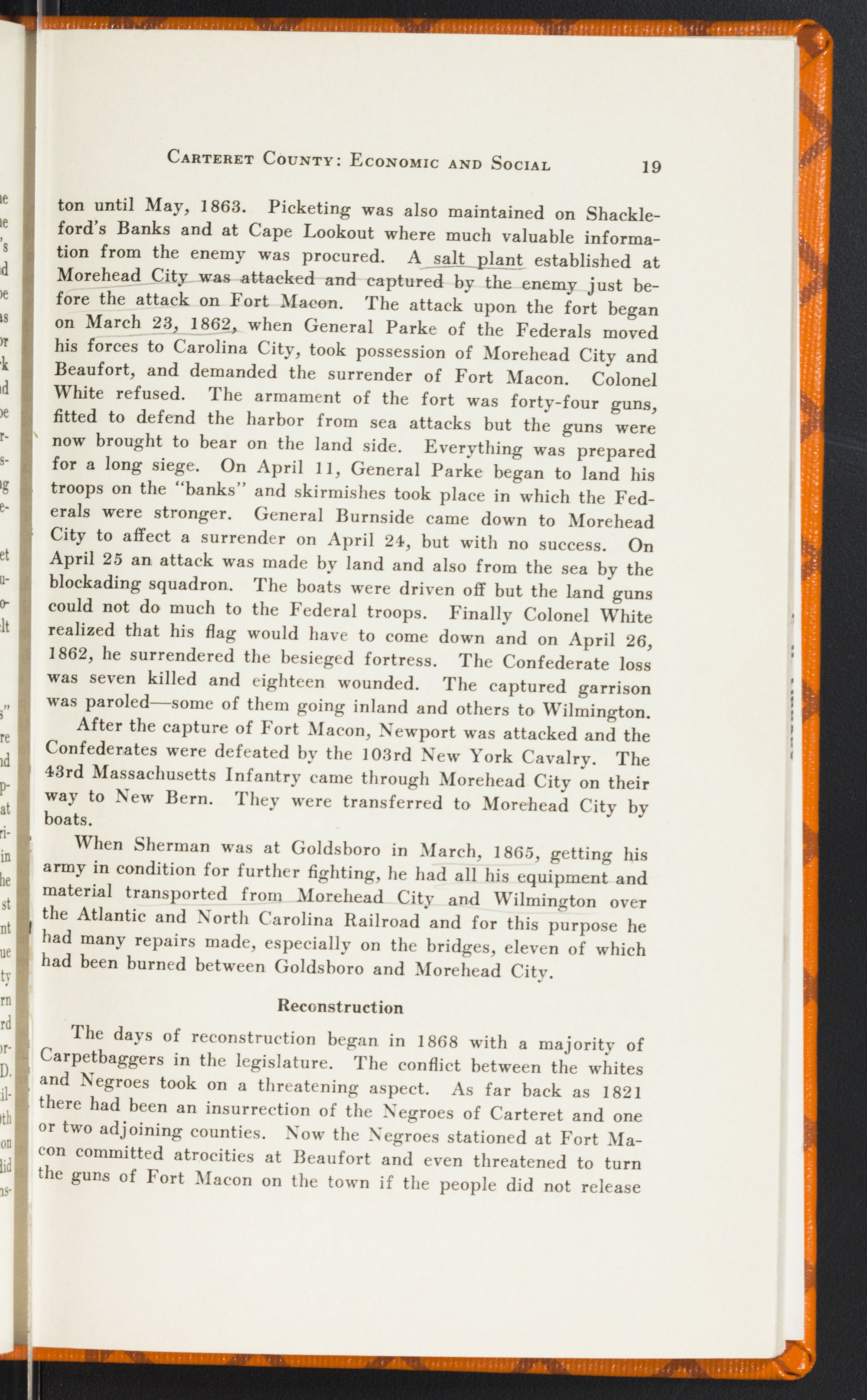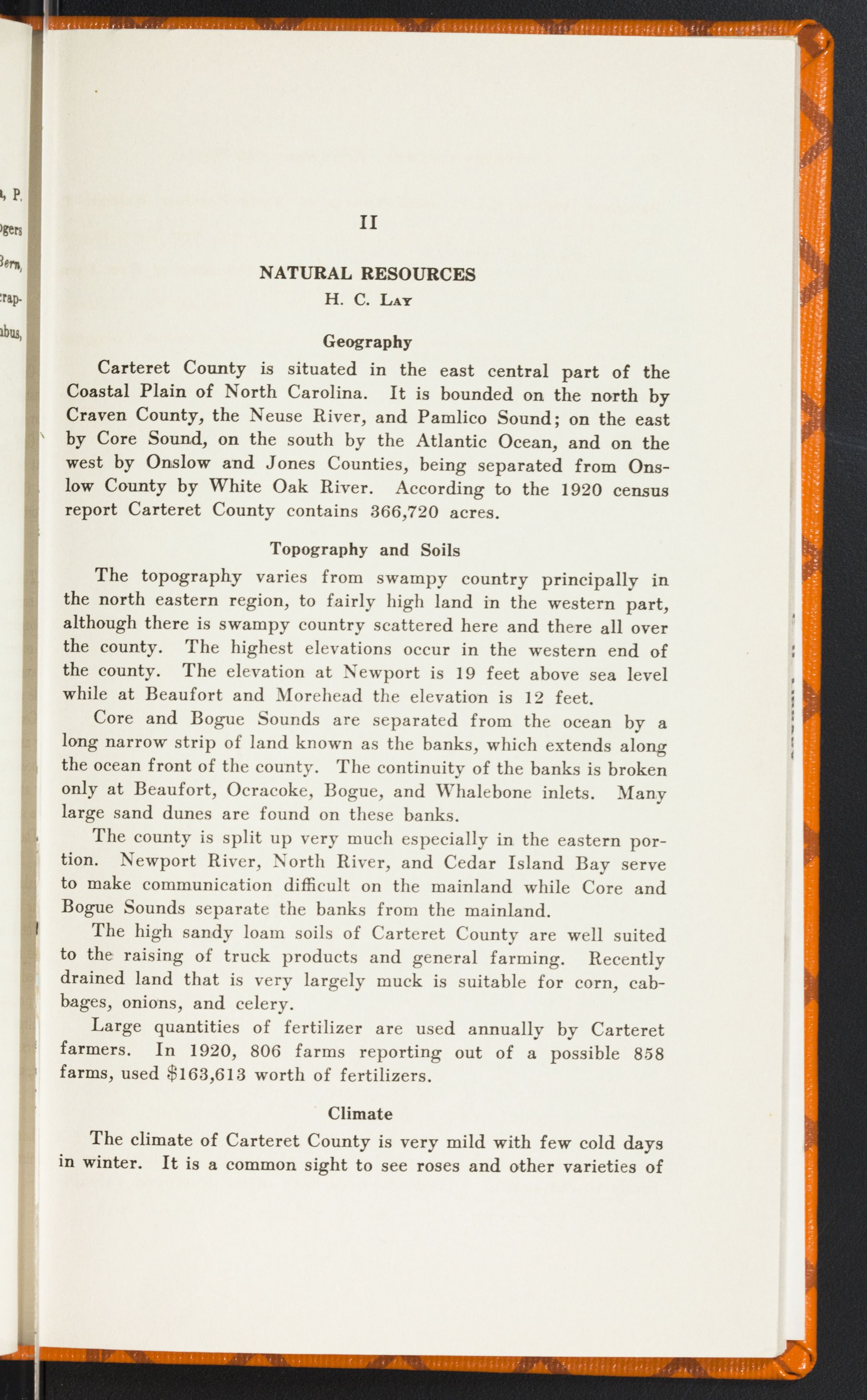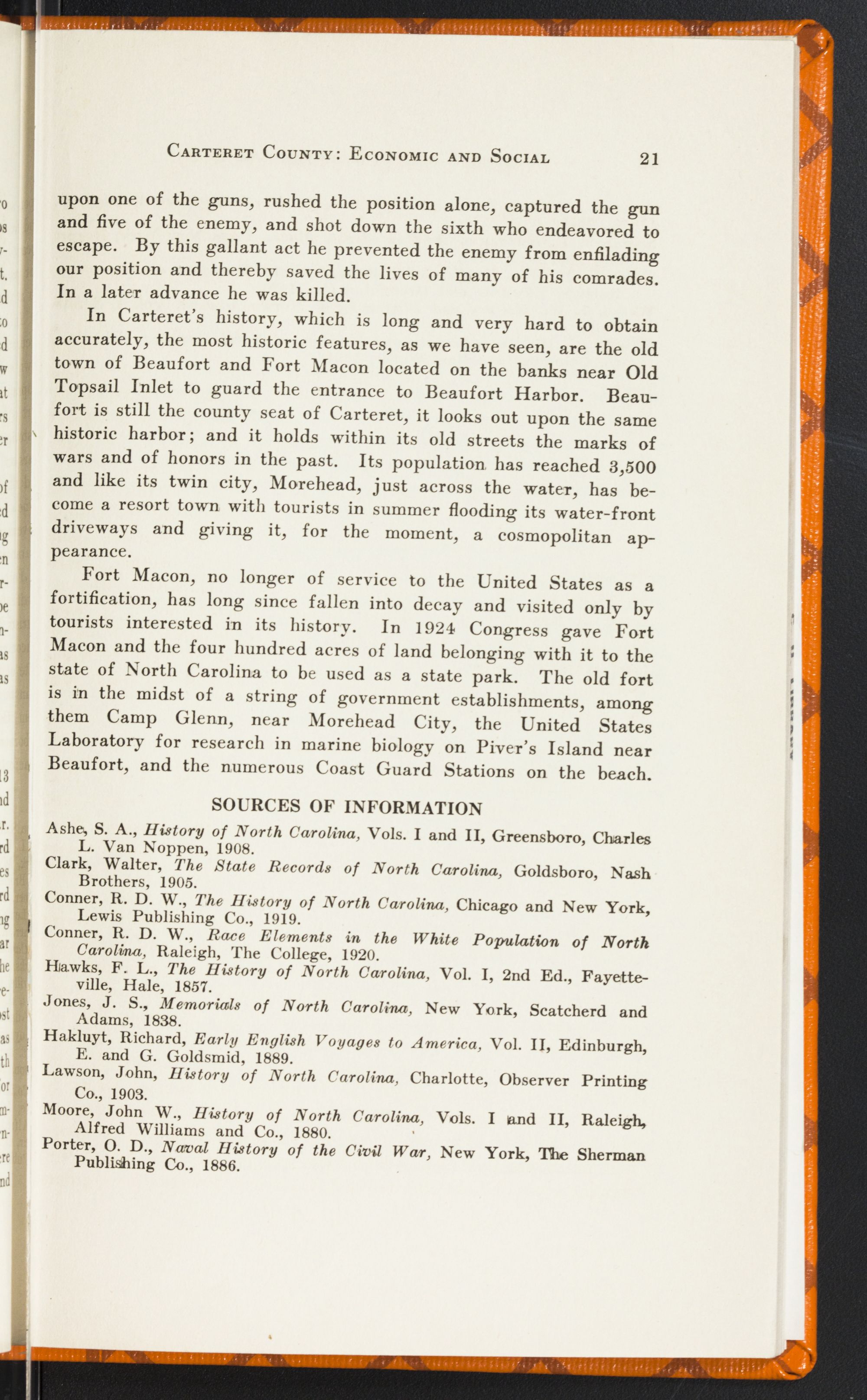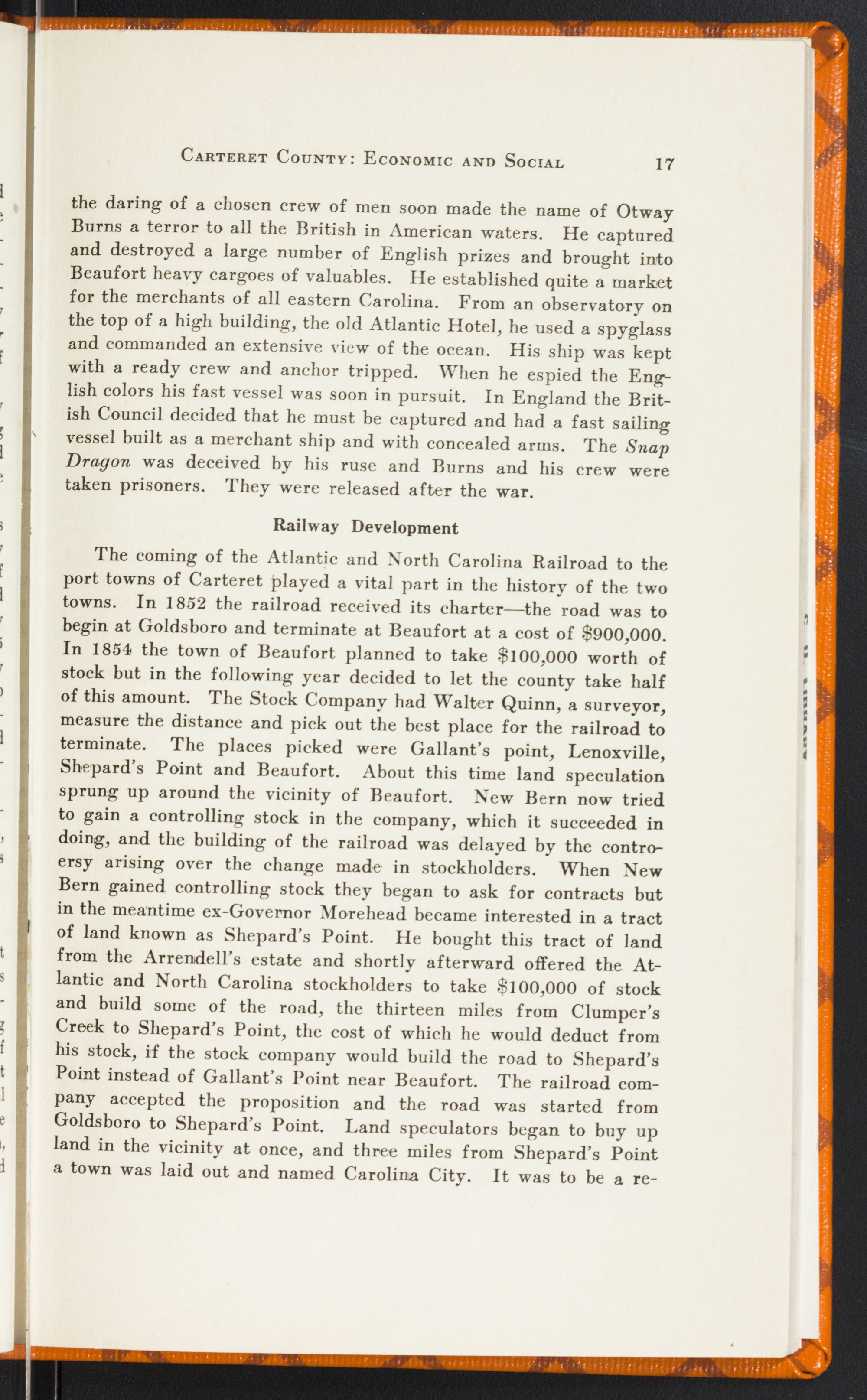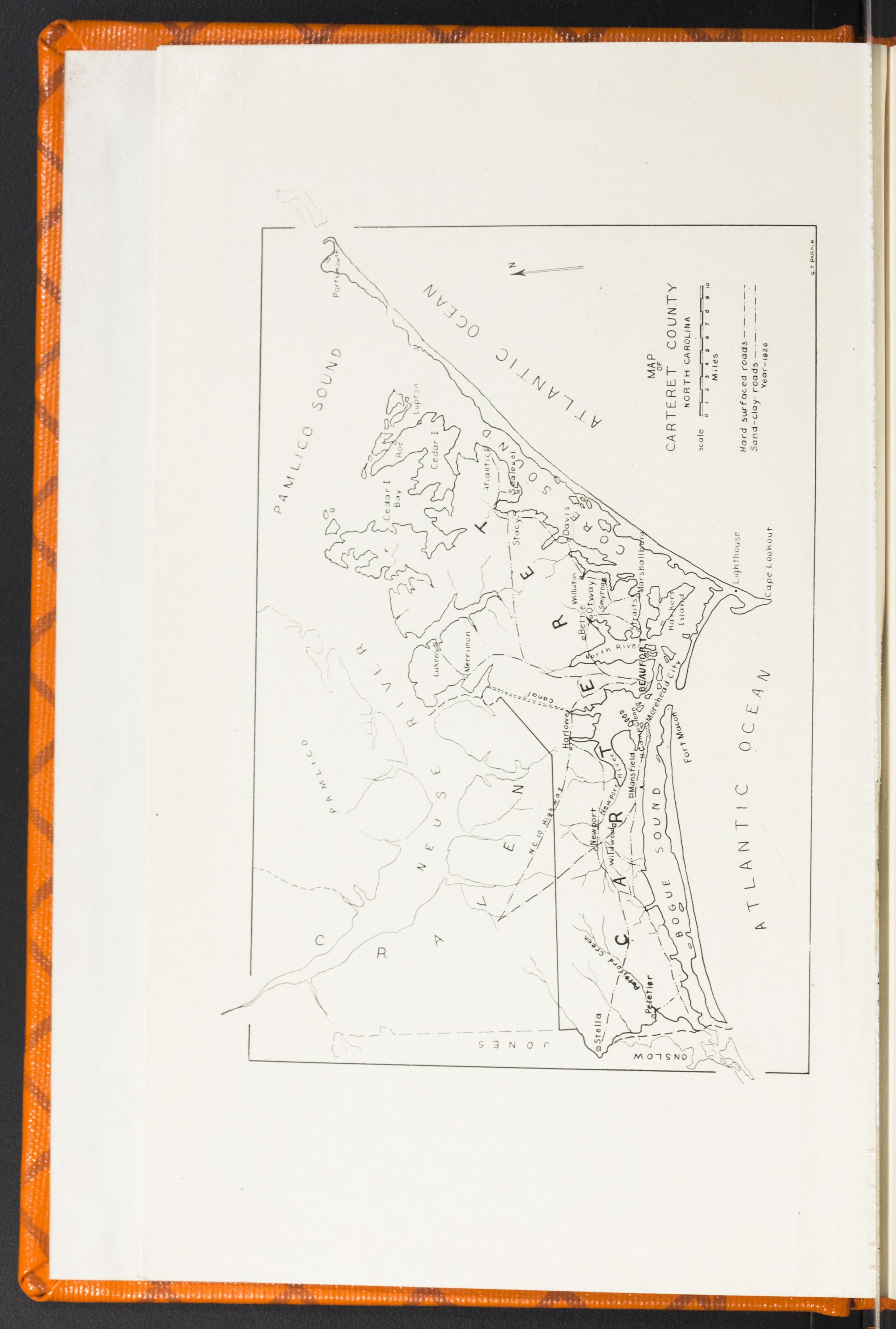 Means of CommunicationGreat progress has been made in Carteret's highways and railroads. The increased number of automobiles has naturally demanded better roads. In 1915 Carteret County had 27 automobiles and now there are 561 in the county. The total amount of miles of highway in Carteret is equal to 290 miles. Within the last two years Carteret County has constructed 50 miles of hard surfaced roads and now has contracts out for about 30 miles. Both Morehead City and Beaufort have all their principal streets paved and more under construction. As further evidence of progress and development there is now under construction a half million dollar bridge connecting Beaufort and Morehead. Recently there has been established a bus line to Beaufort and to Morehead City, and from Beaufort to Atlantic. Railroad service has increased and improved in recent years. Large shipments of fish and farm products are shipped the year round over the county's only railroad, the Norfolk Southern.