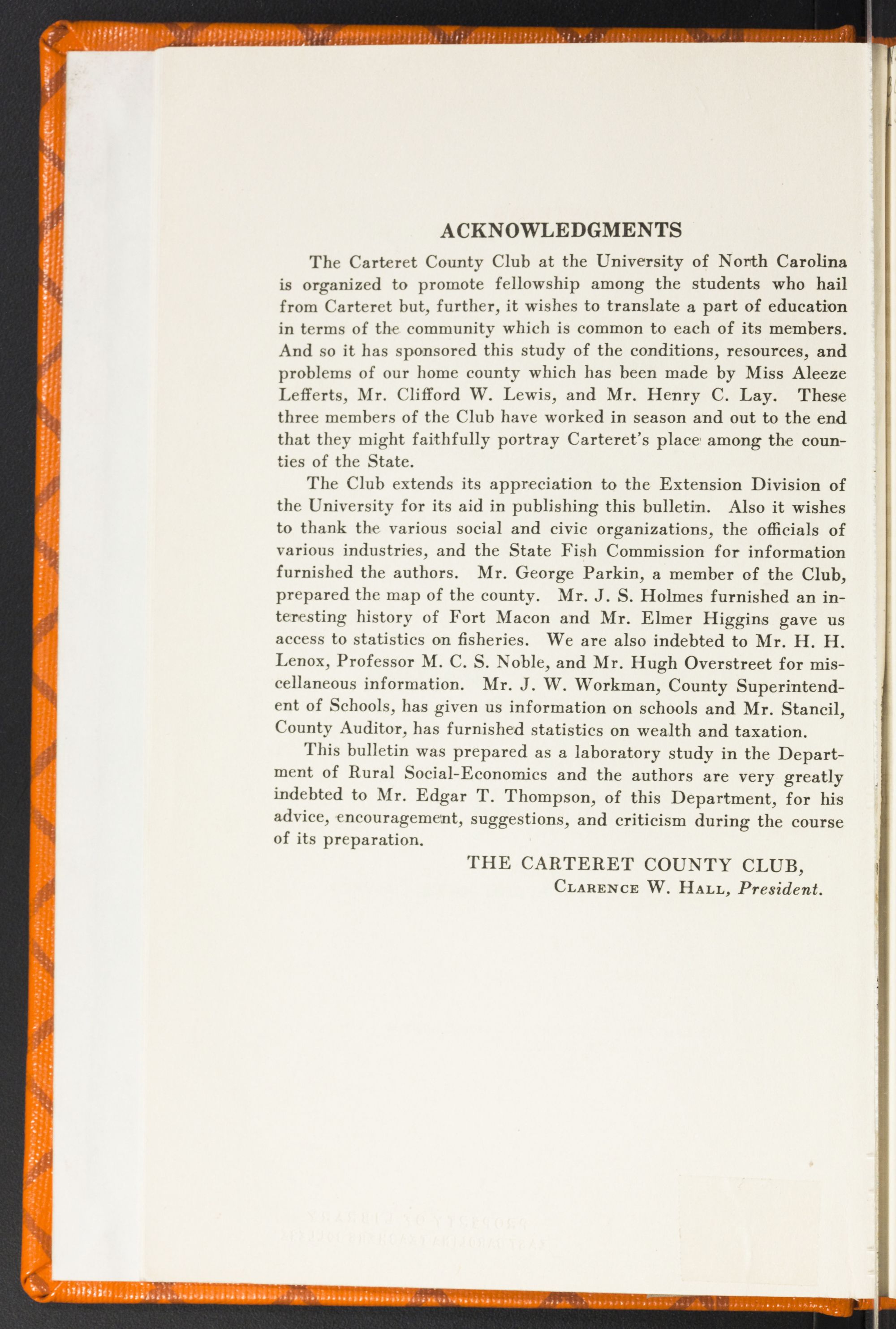‘Great is our heritage of hope, and greatThe obligation of our civic fate’.”Farm TenancyA little more than one-fifth of Carteret County farmers are landless and homeless, according to the 1920 Census report. Or exactly 20.4 percent of all our farmers, both white and colored, were tenants in that year. Tenancy is one of the major problems of the State and its eradication presents itself as a real task for our statesmen and leaders. President W. B. Bizzell, formerly of the Agricultural and Mechanical College of Texas, summarizes the social and economic effects of farm tenancy as follows: