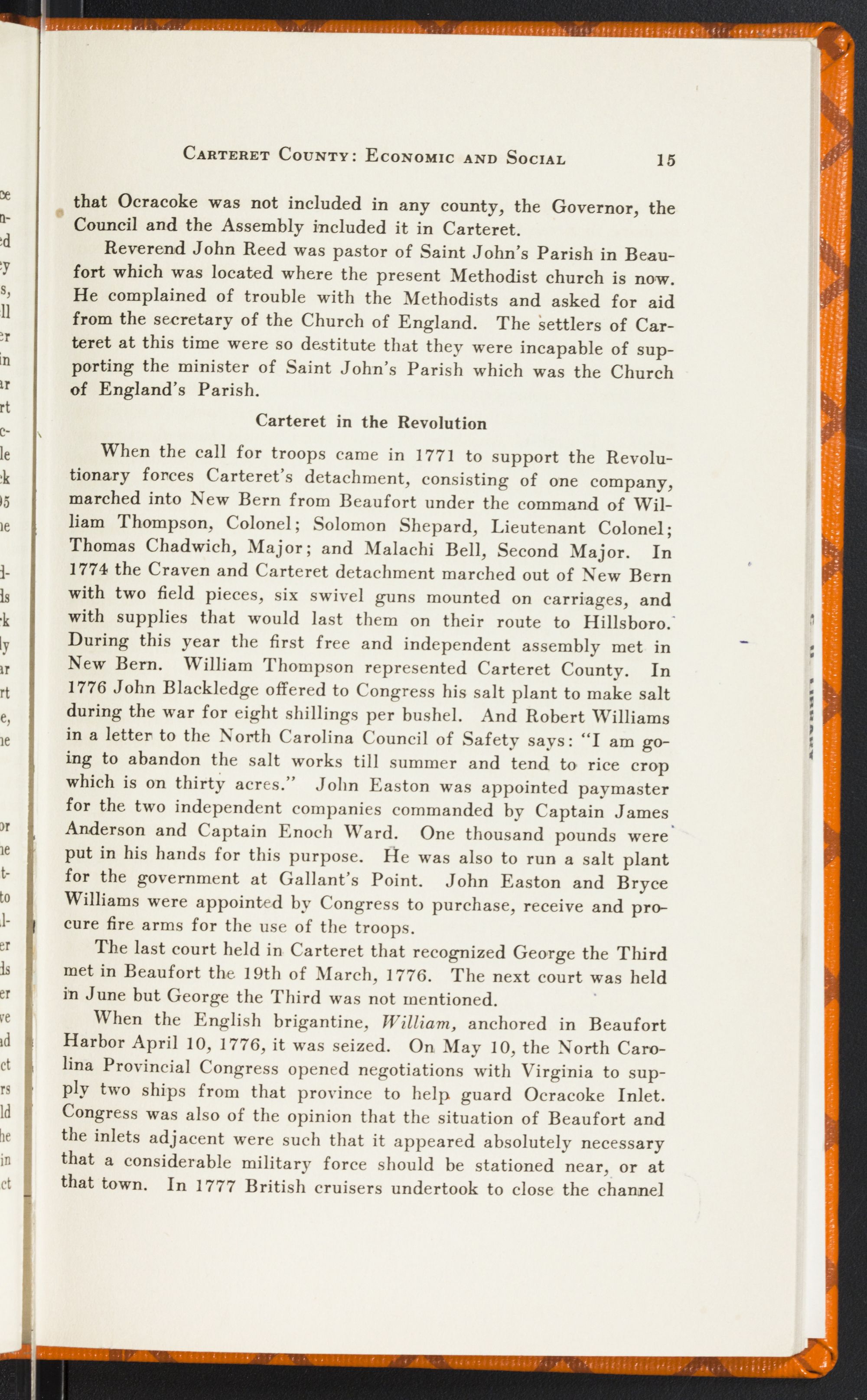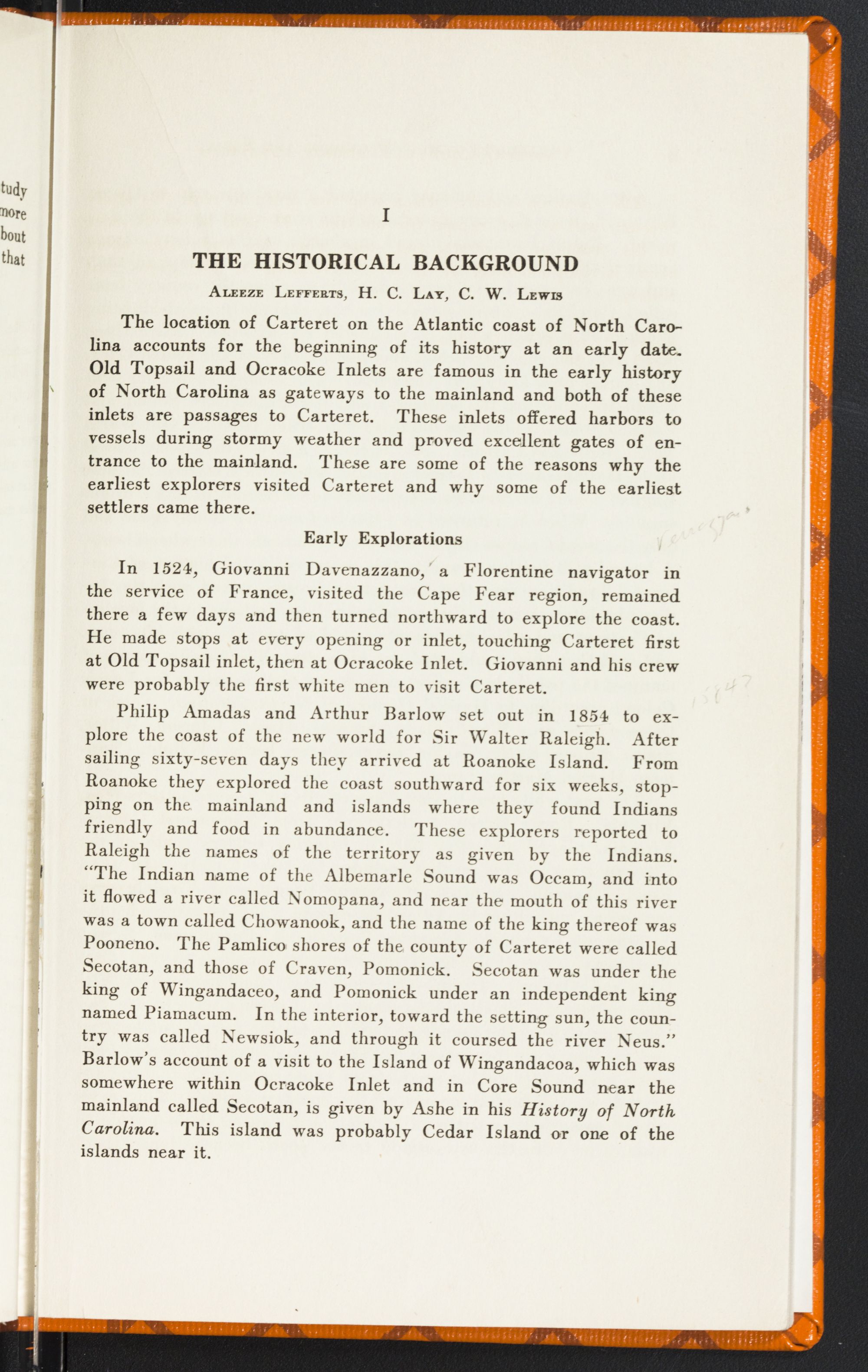 Philip Amadas and Arthur Barlow set out in 1854 to explore the coast of the new world for Sir Walter Raleigh. After sailing sixty-seven days they arrived at Roanoke Island. From Roanoke they explored the coast southward for six weeks, stopping on the mainland and islands where they found Indians friendly and food in abundance. These explorers reported to Raleigh the names of the territory as given by the Indians. “The Indian name of the Albemarle Sound was Occam, and into it flowed a river called Nomopana, and near the mouth of this river was a town called Chowanook, and the name of the king thereof was Pooneno. The Pamlico shores of the county of Carteret were called Secotan, and those of Craven, Pomonick. Secotan was under the king of Wingandaceo, and Pomonick under an independent king named Piamacum. In the interior, toward the setting sun, the country was called Newsiok, and through it coursed the river Neus.” Barlow's account of a visit to the Island of Wingandacoa, which was somewhere within Ocracoke Inlet and in Core Sound near the mainland called Secotan, is given by Ashe in his History of North Carolina. This island was probably Cedar Island or one of the islands near it.