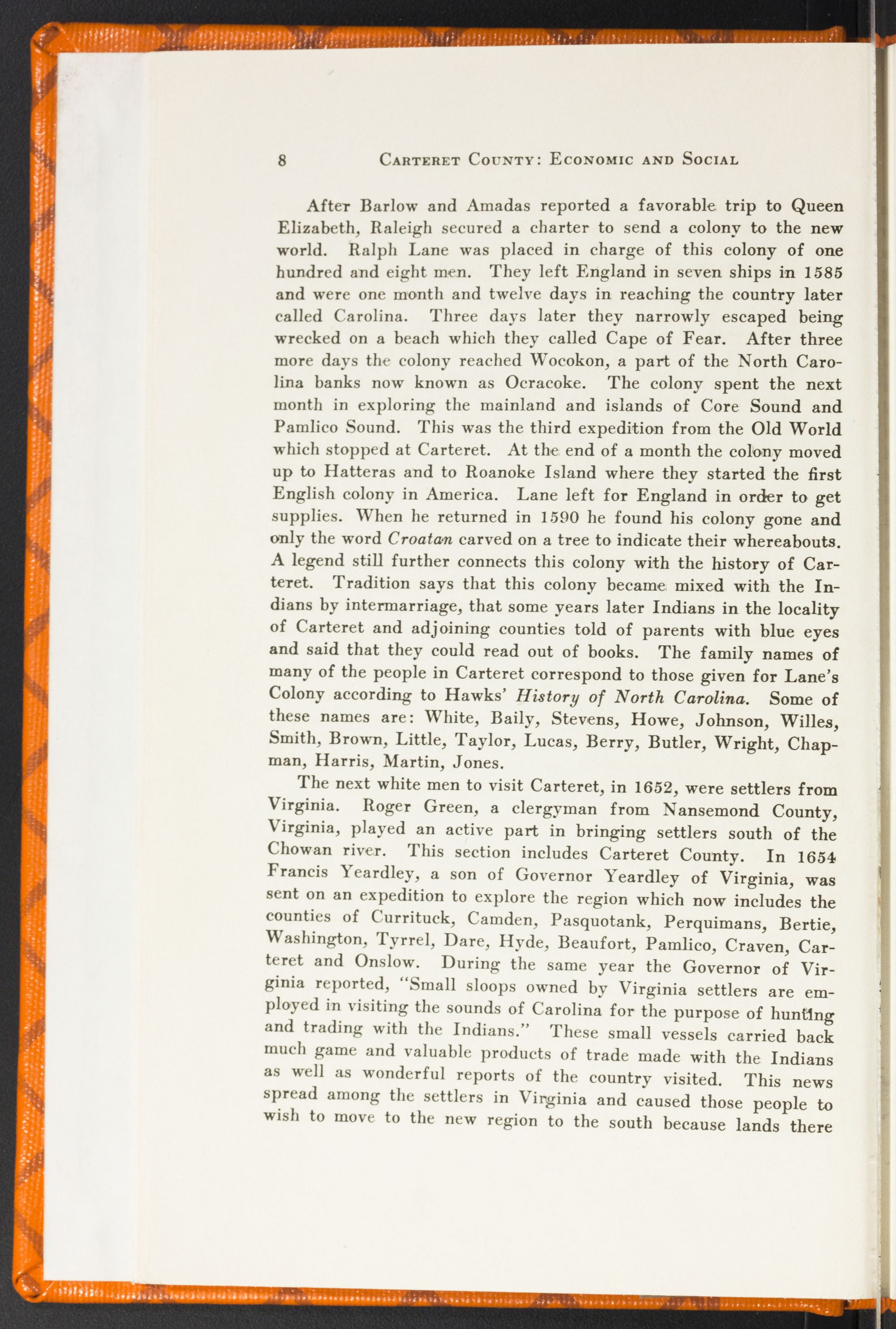After Barlow and Amadas reported a favorable trip to Queen Elizabeth, Raleigh secured a charter to send a colony to the new world. Ralph Lane was placed in charge of this colony of one hundred and eight men. They left England in seven ships in 1585 and were one month and twelve days in reaching the country later called Carolina. Three days later they narrowly escaped being wrecked on a beach which they called Cape of Fear. After three more days the colony reached Wocokon, a part of the North Carolina banks now known as Ocracoke. The colony spent the next month in exploring the mainland and islands of Core Sound and Pamlico Sound. This was the third expedition from the Old World which stopped at Carteret. At the end of a month the colony moved up to Hatteras and to Roanoke Island where they started the first English colony in America. Lane left for England in order to get supplies. When he returned in 1590 he found his colony gone and only the word Croatan carved on a tree to indicate their whereabouts. A legend still further connects this colony with the history of Carteret. Tradition says that this colony became mixed with the Indians by intermarriage, that some years later Indians in the locality of Carteret and adjoining counties told of parents with blue eyes and said that they could read out of books. The family names of many of the people in Carteret correspond to those given for Lane's Colony according to Hawks’ History of North Carolina. Some of these names are: White, Baily, Stevens, Howe, Johnson, Willes, Smith, Brown, Little, Taylor, Lucas, Berry, Butler, Wright, Chapman, Harris, Martin, Jones.