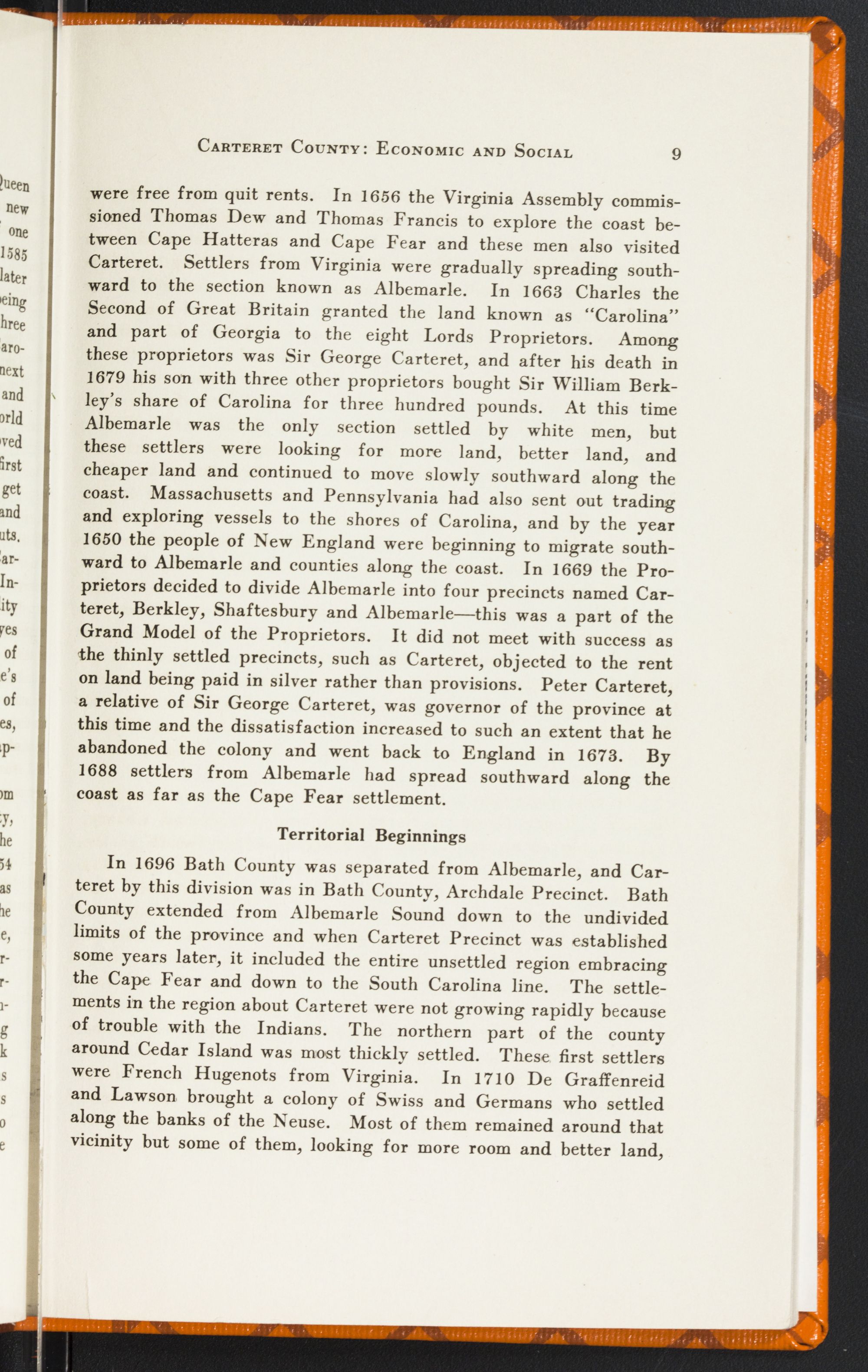 were free from quit rents. In 1656 the Virginia Assembly commissioned Thomas Dew and Thomas Francis to explore the coast between Cape Hatteras and Cape Fear and these men also visited Carteret. Settlers from Virginia were gradually spreading southward to the section known as Albemarle. In 1663 Charles the Second of Great Britain granted the land known as “Carolina” and part of Georgia to the eight Lords Proprietors. Among these proprietors was Sir George Carteret, and after his death in 1679 his son with three other proprietors bought Sir William Berkley's share of Carolina for three hundred pounds. At this time Albemarle was the only section settled by white men, but these settlers were looking for more land, better land, and cheaper land and continued to move slowly southward along the coast. Massachusetts and Pennsylvania had also sent out trading and exploring vessels to the shores of Carolina, and by the year 1650 the people of New England were beginning to migrate southward to Albemarle and counties along the coast. In 1669 the Proprietors decided to divide Albemarle into four precincts named Carteret, Berkley, Shaftesbury and Albemarle—this was a part of the Grand Model of the Proprietors. It did not meet with success as the thinly settled precincts, such as Carteret, objected to the rent on land being paid in silver rather than provisions. Peter Carteret, a relative of Sir George Carteret, was governor of the province at this time and the dissatisfaction increased to such an extent that he abandoned the colony and went back to England in 1673. By 1688 settlers from Albemarle had spread southward along the coast as far as the Cape Fear settlement.