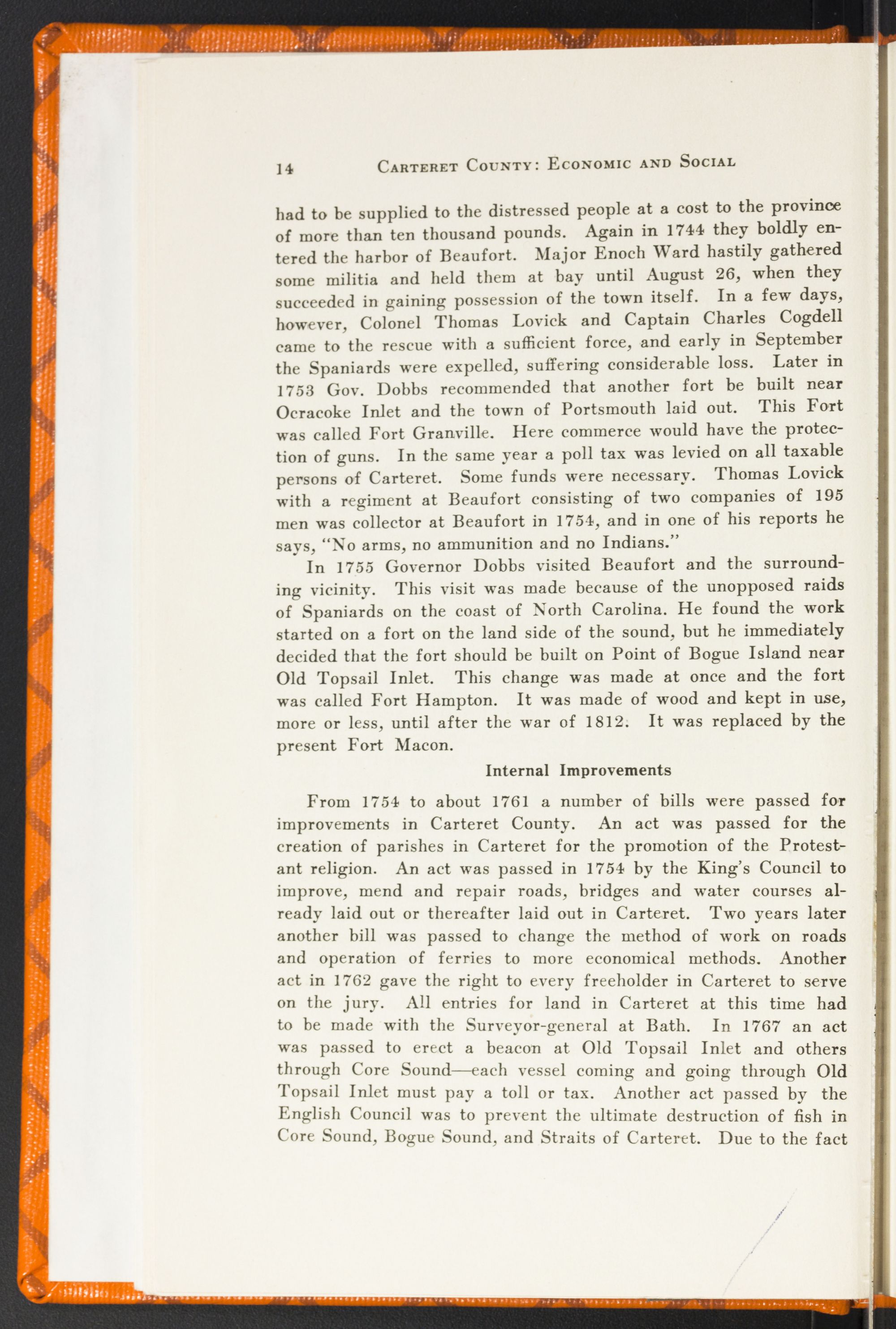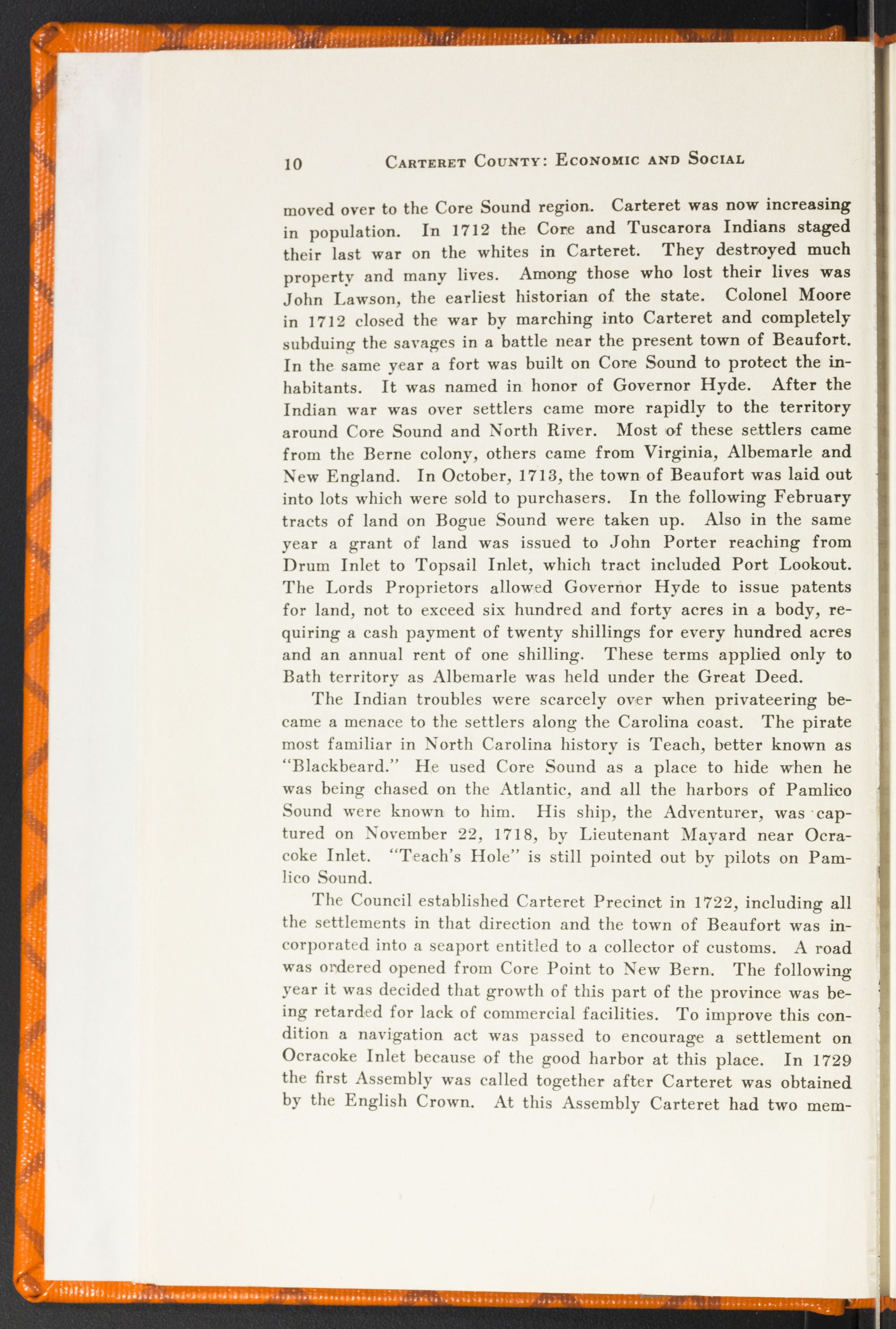 moved over to the Core Sound region. Carteret was now increasing in population. In 1712 the Core and Tuscarora Indians staged their last war on the whites in Carteret. They destroyed much property and many lives. Among those who lost their lives was John Lawson, the earliest historian of the state. Colonel Moore in 1712 closed the war by marching into Carteret and completely subduing the savages in a battle near the present town of Beaufort. In the same year a fort was built on Core Sound to protect the inhabitants. It was named in honor of Governor Hyde. After the Indian war was over settlers came more rapidly to the territory around Core Sound and North River. Most of these settlers came from the Berne colony, others came from Virginia, Albemarle and New England. In October, 1713, the town of Beaufort was laid out into lots which were sold to purchasers. In the following February tracts of land on Bogue Sound were taken up. Also in the same year a grant of land was issued to John Porter reaching from Drum Inlet to Topsail Inlet, which tract included Port Lookout. The Lords Proprietors allowed Governor Hyde to issue patents for land, not to exceed six hundred and forty acres in a body, requiring a cash payment of twenty shillings for every hundred acres and an annual rent of one shilling. These terms applied only to Bath territory as Albemarle was held under the reat Deed.