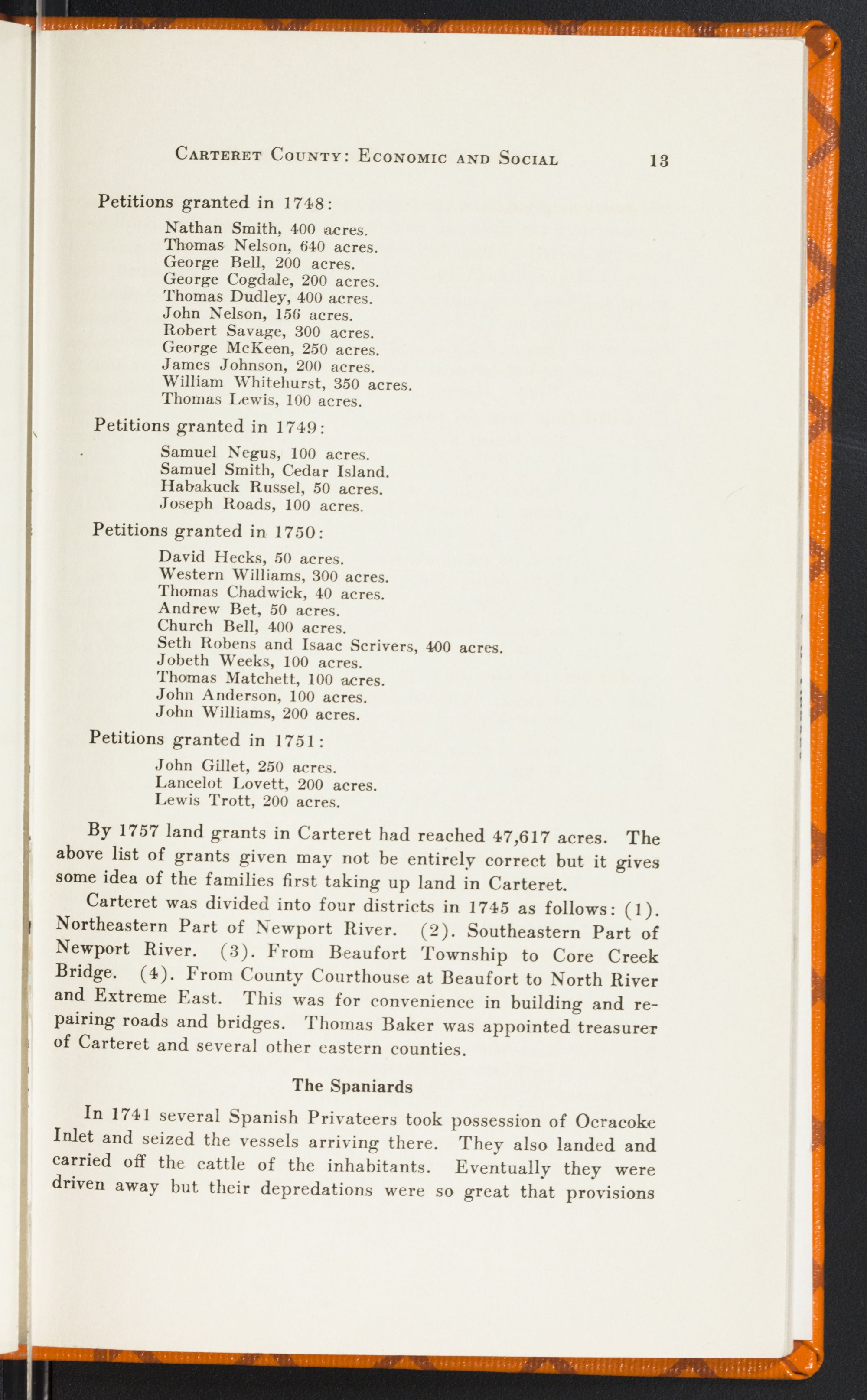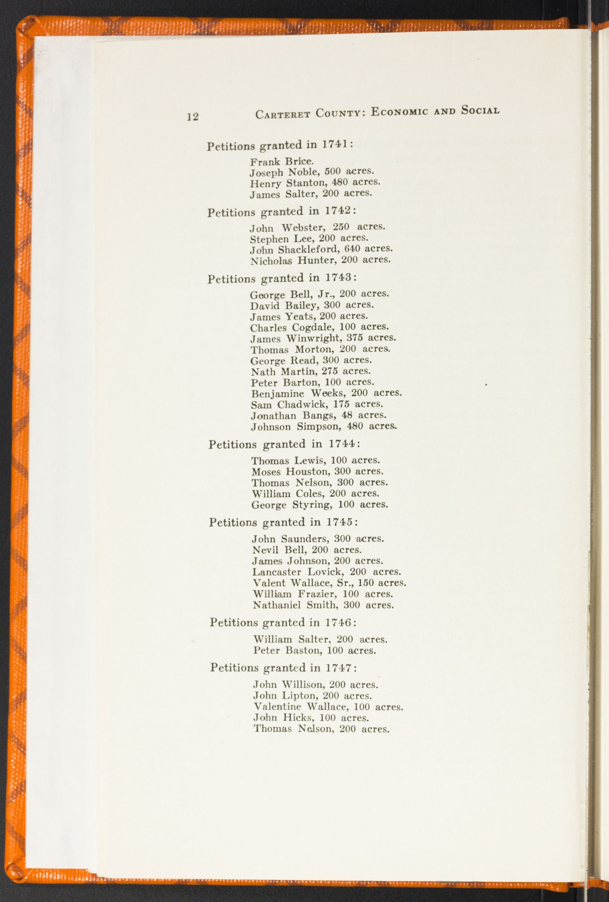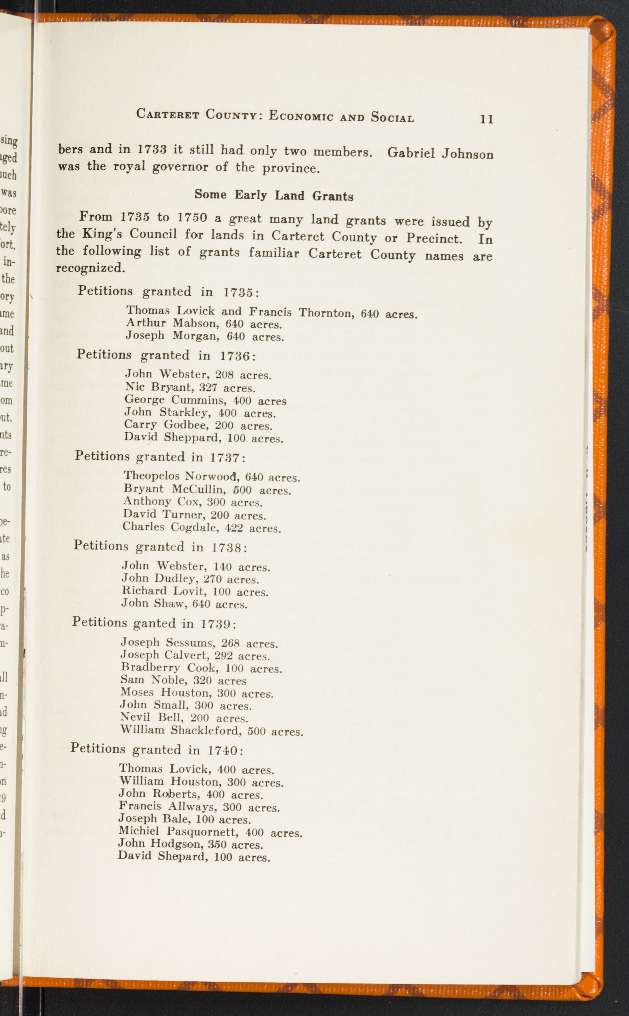 Some Early Land GrantsFrom 1735 to 1750 a great many land grants were issued by the King's Council for lands in Carteret County or Precinct. In the following list of grants familiar Carteret County names are recognized.