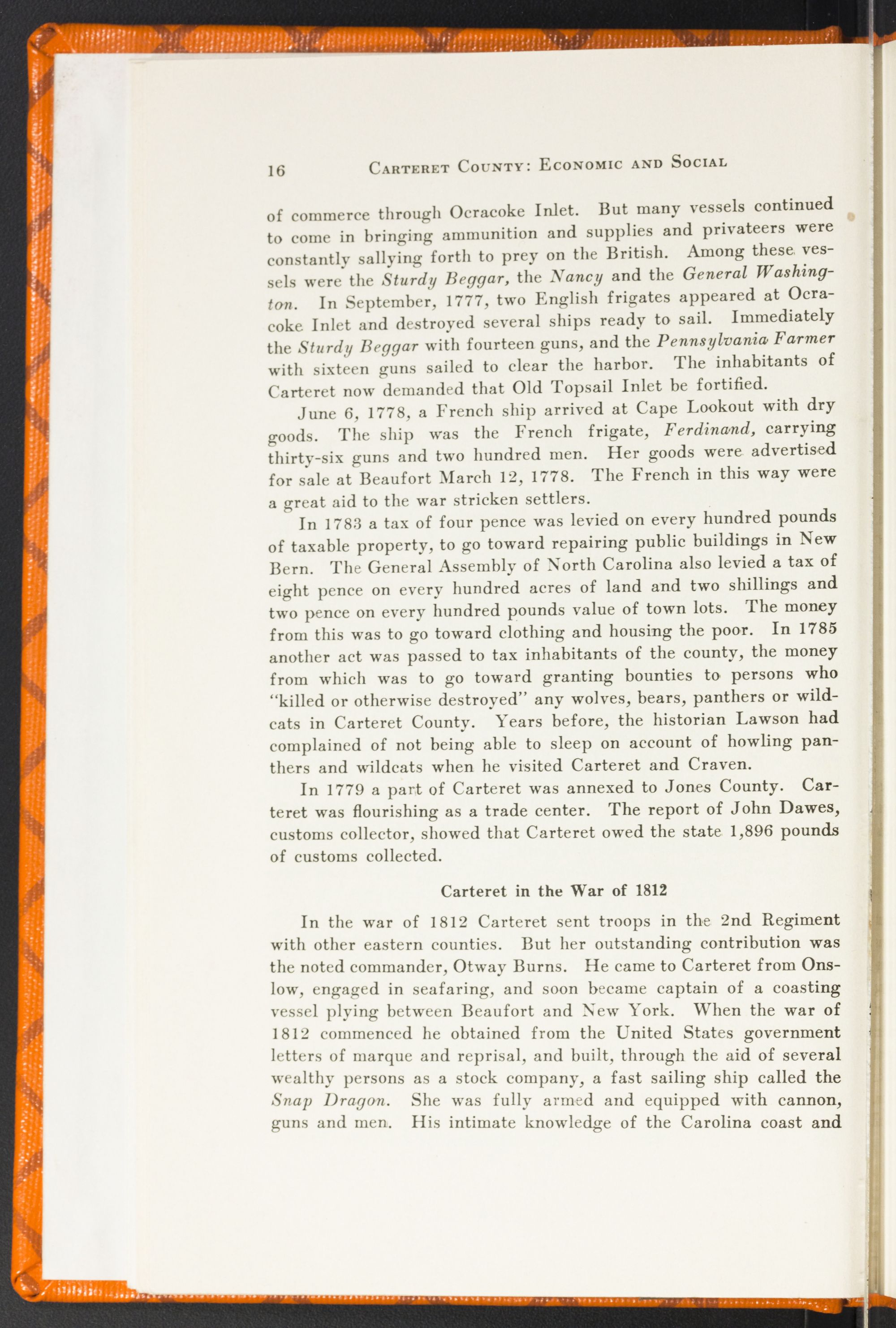 The Indian troubles were scarcely over when privateering became a menace to the settlers along the Carolina coast. The pirate most familiar in North Carolina history is Teach, better known as “Blackbeard.” He used Core Sound as a place to hide when he was being chased on the Atlantic, and all the harbors of Pamlico Sound were known to him. His ship, the Adventurer, was captured on November 22, 1718, by Lieutenant Mayard near Ocracoke Inlet. “Teach's Hole” is still pointed out by pilots on Pamlico Sound.