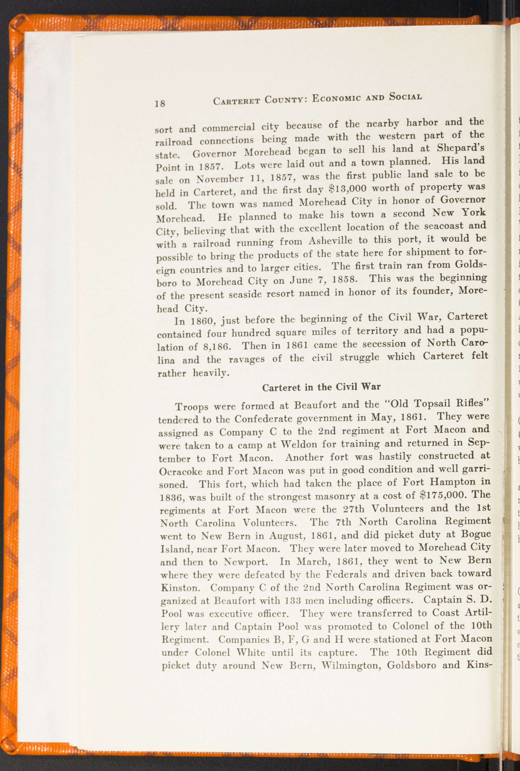 Territorial BeginningsIn 1696 Bath County was separated from Albemarle, and Carteret by this division was in Bath County, Archdale Precinct. Bath County extended from Albemarle Sound down to the undivided limits of the province and when Carteret Precinct was established some years later, it included the entire unsettled region embracing the Cape Fear and down to the South Carolina line. The settlements in the region about Carteret were not growing rapidly because of trouble with the Indians. The northern part of the county around Cedar Island was most thickly settled. These first settlers were French Hugenots from Virginia. In 1710 De Graffenreid and Lawson brought a colony of Swiss and Germans who settled along the banks of the Neuse. Most of them remained around that vicinity but some of them, looking for more room and better land,