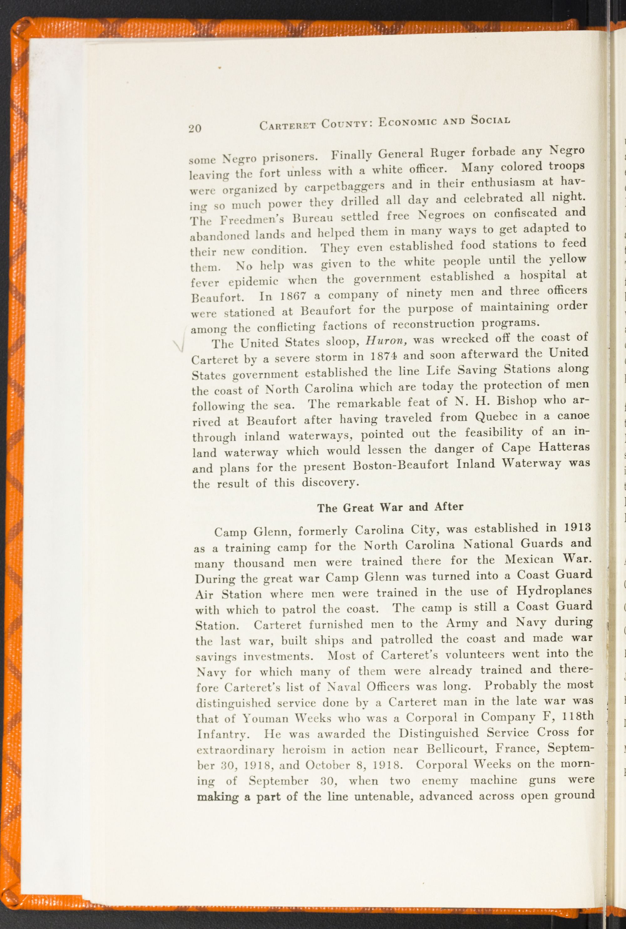 Telephones have broken down the barrier of isolation that is so dangerous to a community. The inhabitants of the outlying districts of Carteret County are no longer isolated. Communication is now carried on by automobile, boat, telephone, telegraph, and radio. There is a government radio station located at Camp Glenn.