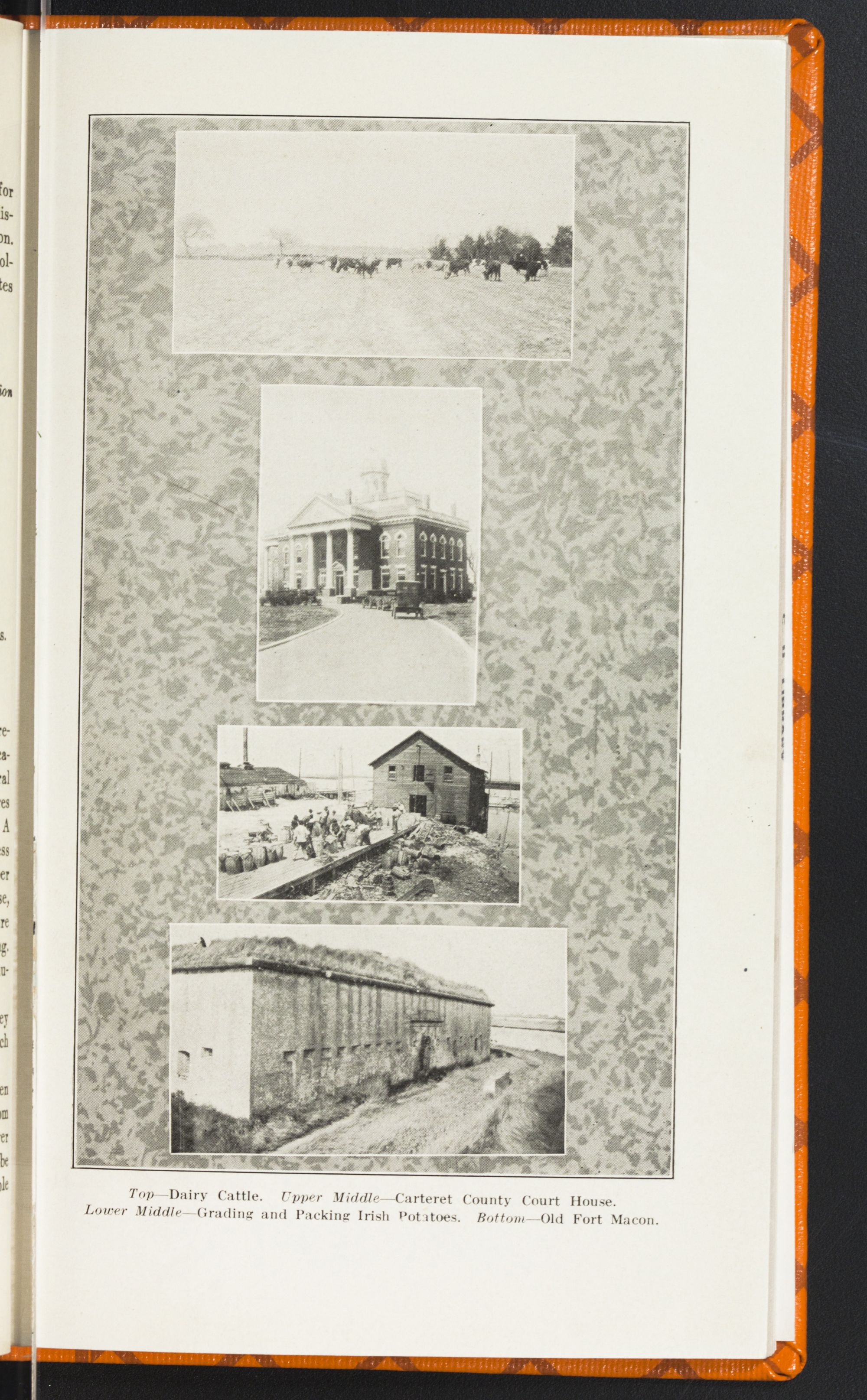 Top—Dairy Cattle. Upper Middle— Carteret County Court House. Lower Middle—Grading and Packing Irish Potatoes. Bottom—Old Fort Macon.