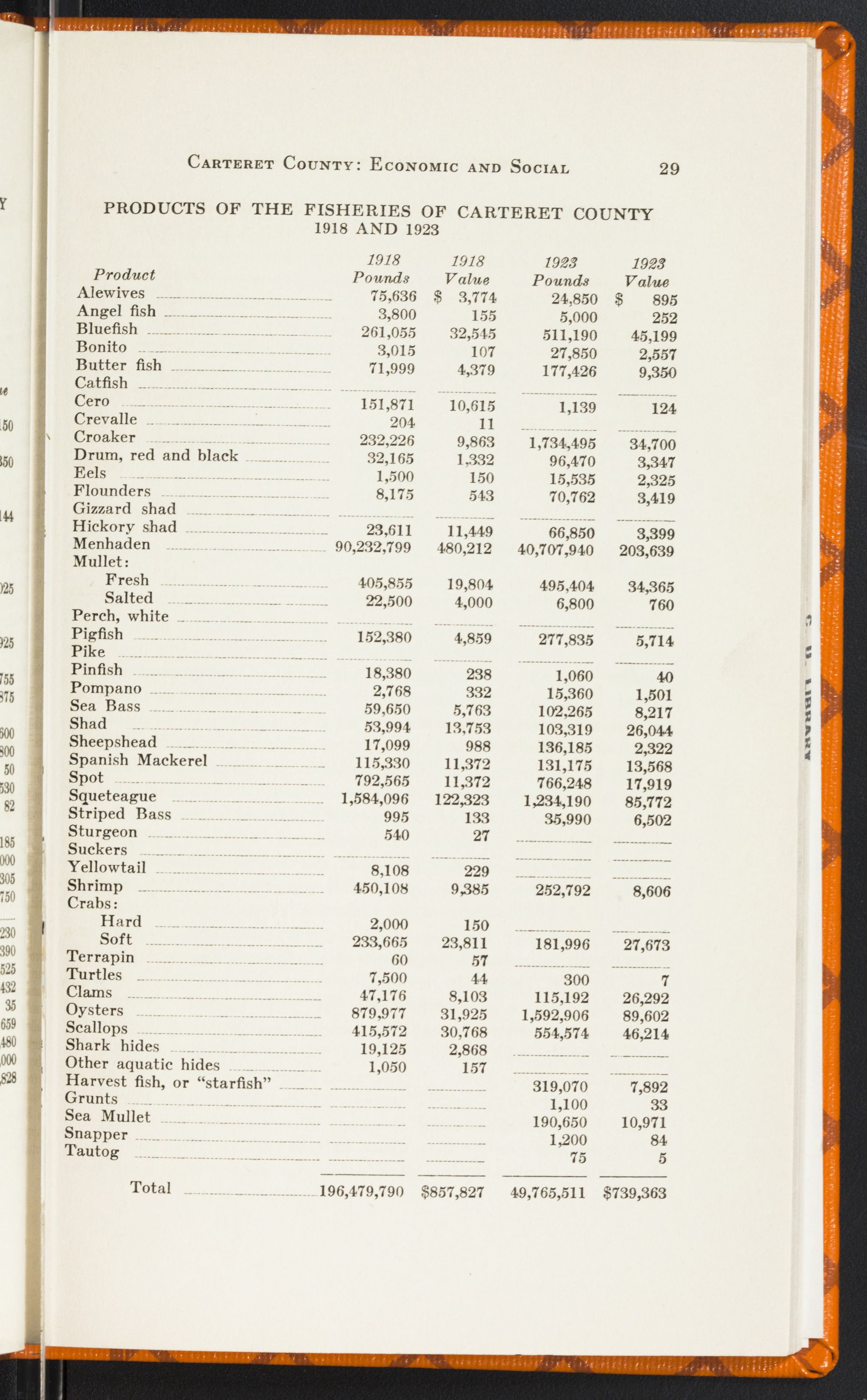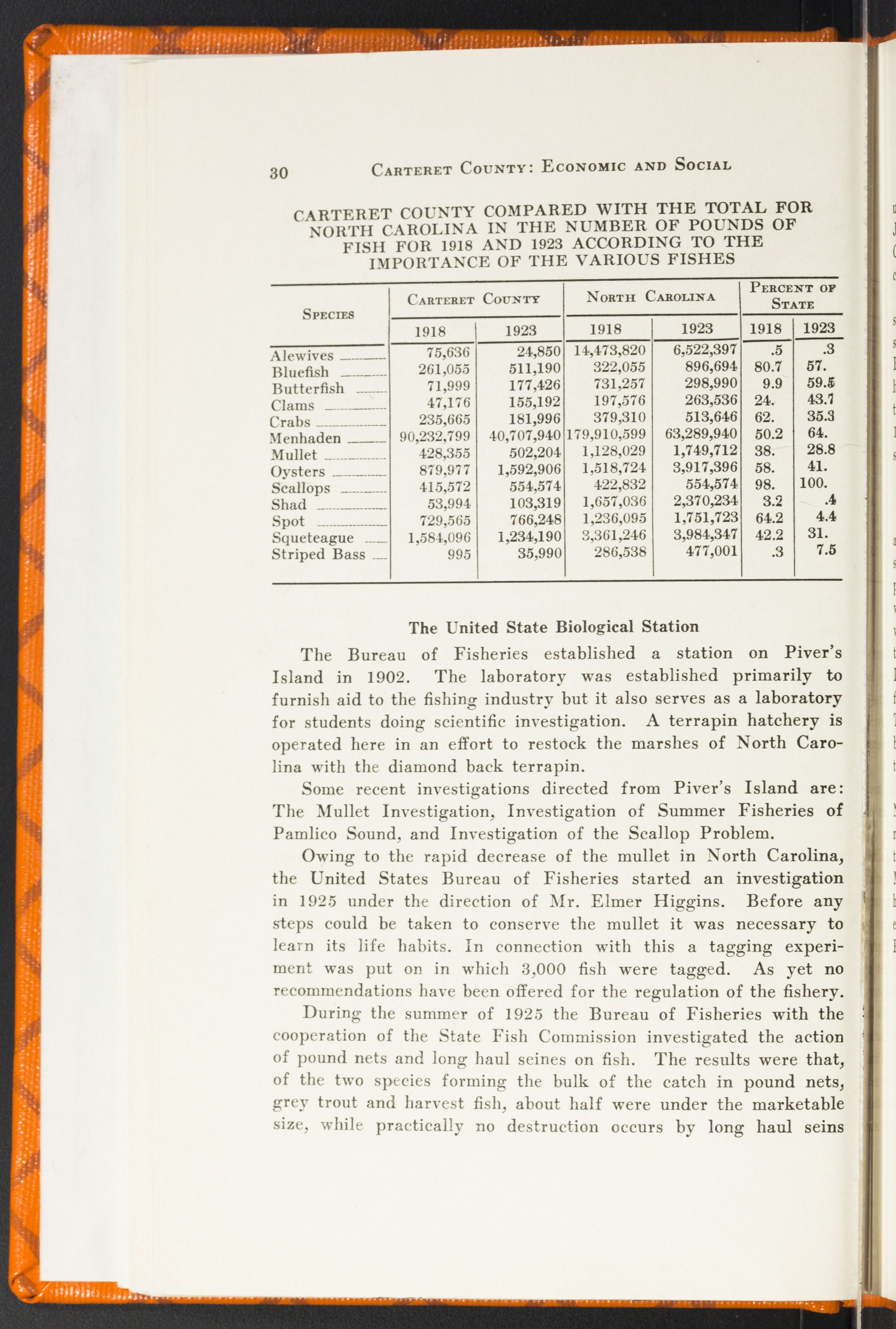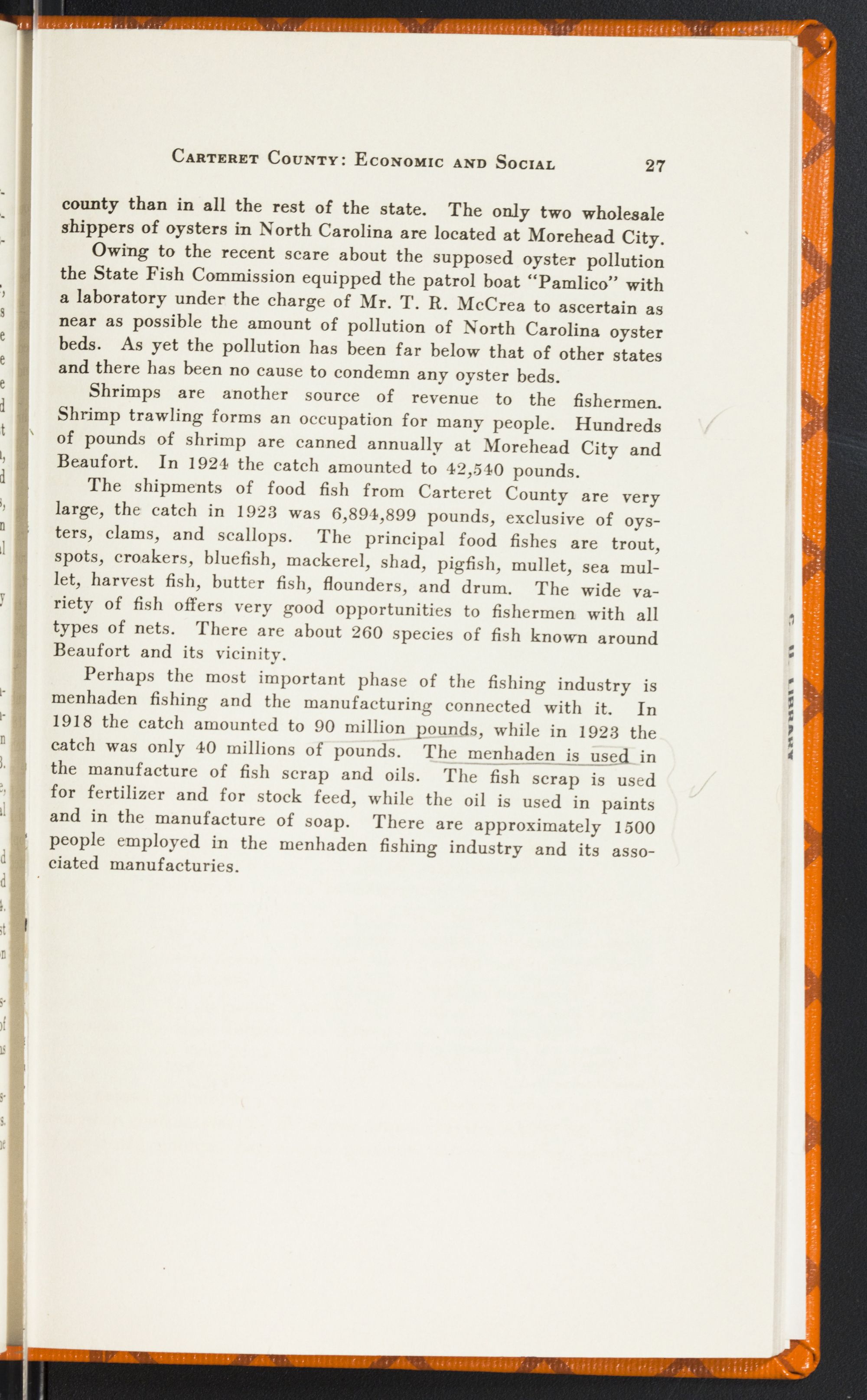 IndustriesCarteret's industries have expanded greatly in the last decade. There have been established all over the county fish factories to take care of the increased yearly catches of Menhaden. There are innumerable fish packing houses that ship fresh fish all over the eastern United States. The lumber business has grown rapidly since 1900. There have been several new mills established since then.