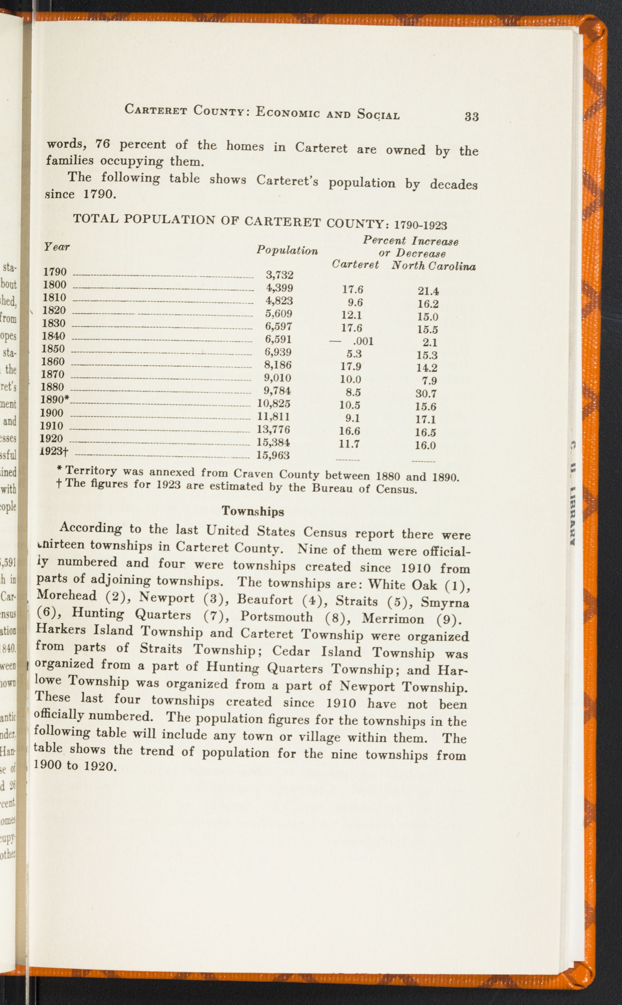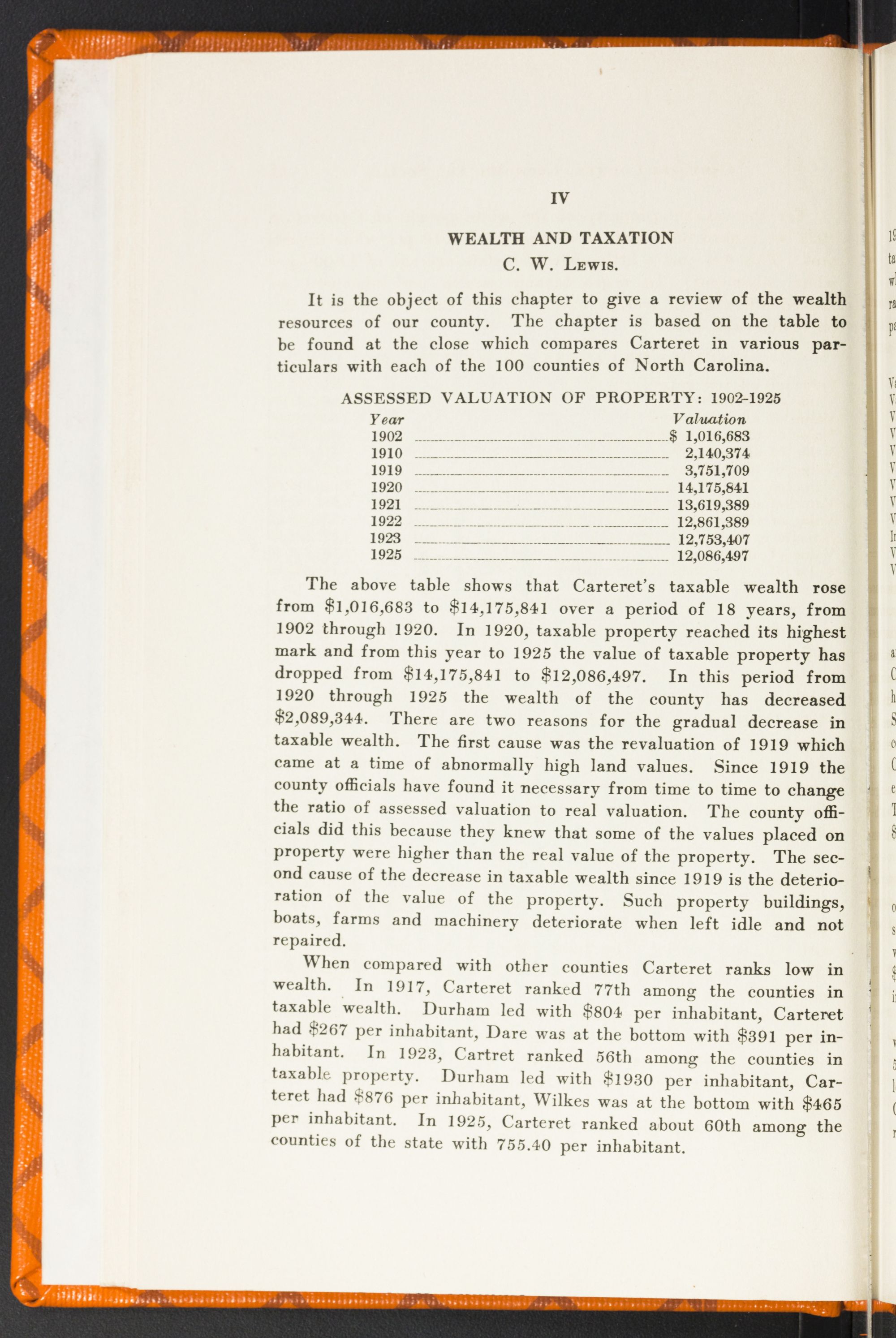 Improved County GovernmentRelatively there are few people in Carteret County who contribute anything to the support of State government. State taxes are paid by those who have productive properties sufficient to yield net incomes beyond $2,000 a year, by producing corporations, and by wage and salary earners with incomes of $1,000 if single and $2,000 if married. On the other hand, everybody pays county taxes who owns land or has more than $300 in personal effects. Carteret County in 1922 had a higher county tax burden than thirty-five other North Carolina counties with an average of $6.35 for each individual within it. Out of this, $6.15 comes from general property—farm lands, buildings and livestock, city lots and factory sites and improvements thereon, merchandise, mill products on hand, solvent credits, etc. Not one penny goes to the support of county government from inheritance, income and other special taxes. An average of sixteen cents per inhabitant is paid by Carteret County people as poll taxes in support of county government. And five cents per individual is the average derived from licenses and permits. General property bears the chief burden of county support in Carteret County, as indeed, in every other county in the State. If county taxes are an unduly heavy burden in Carteret, we are likely to find the chief causes in (1) inequities in the county tax lists, (2) uncollected taxes, (3) fees and fines uncollected or unreported, and (4) primitive methods of bookkeeping and reporting to the public in annual statements.
