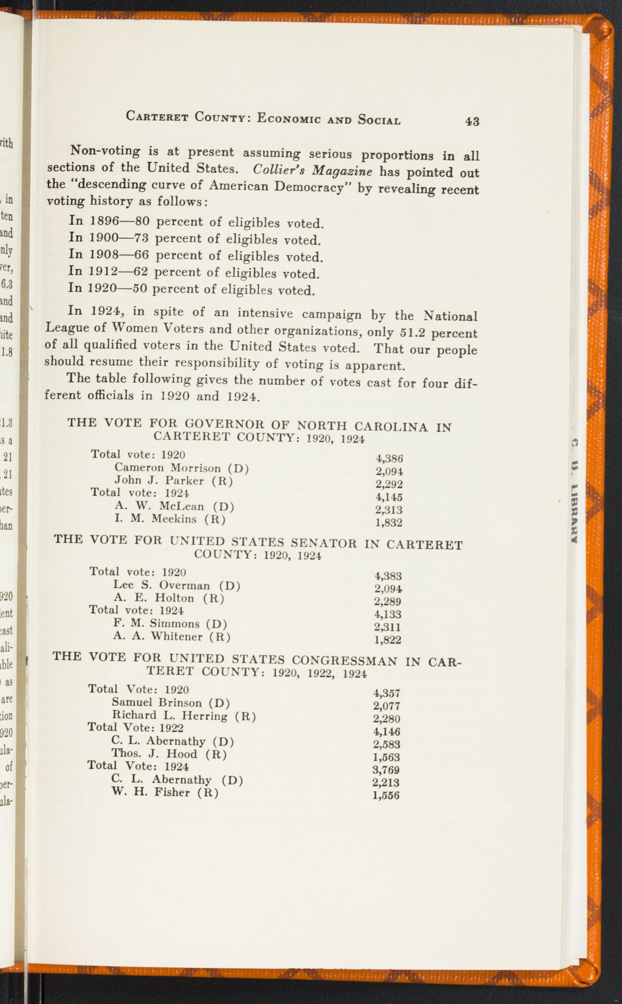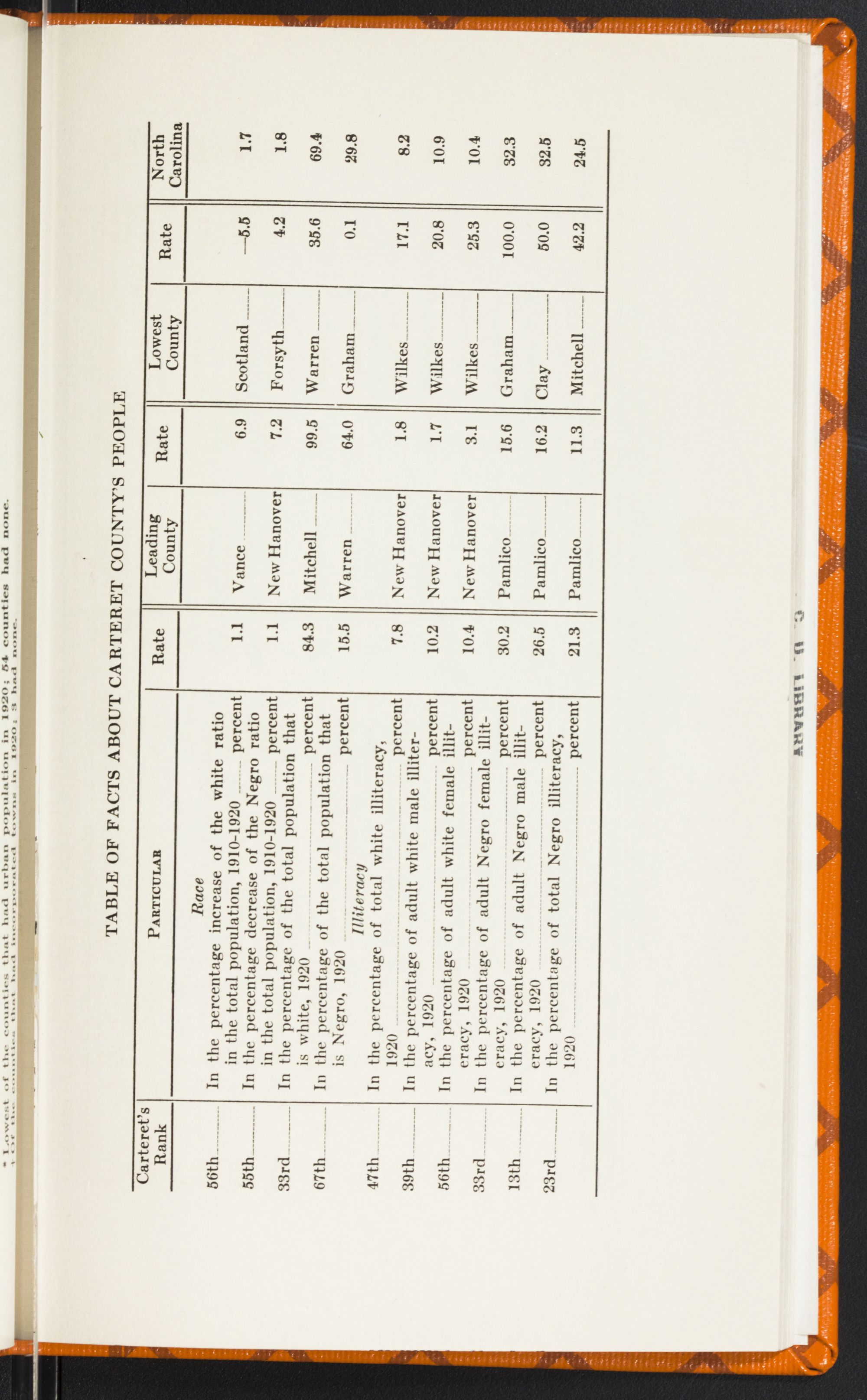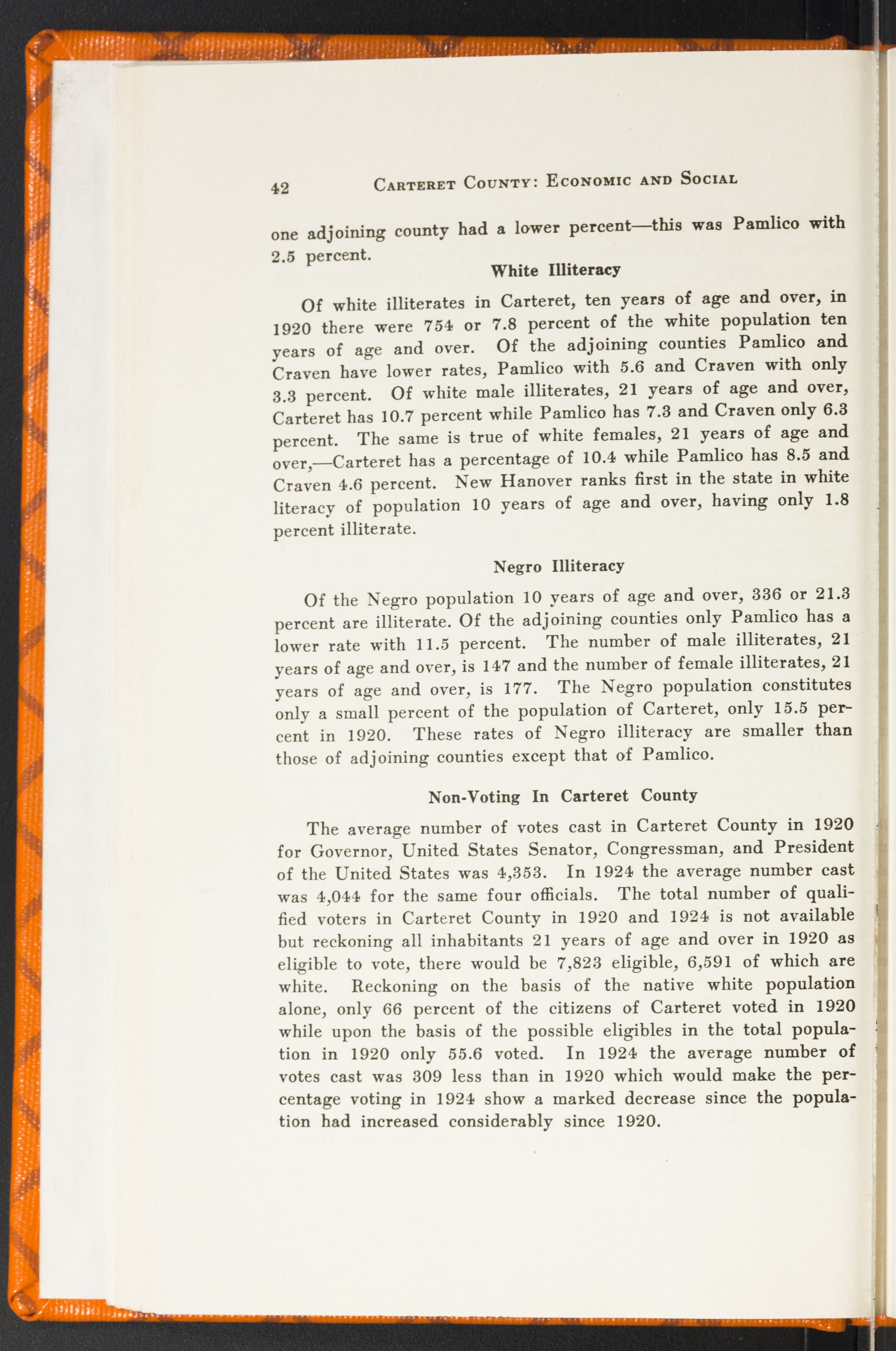 In North Carolina there were 44,000 illiterate white women in 1920—almost enough to fill a city the size of Charlotte. There were 344 of them in Carteret County. Or, in other words, we ranked 56th among the counties of the State in adult white female illiteracy with 10.4 percent of our total number unable to read or write their names—voters, now, who cannot make out a ballot! And 10.2 percent of our white men were in the same condition. But what shall we say of our negro illiterates—21.3 percent of the race in Carteret County? Is it possible for Carteret County whites to reach their highest and best development alongside of an illiterate, unsanitary, immoral negro race? For these things are bred by ignorance.