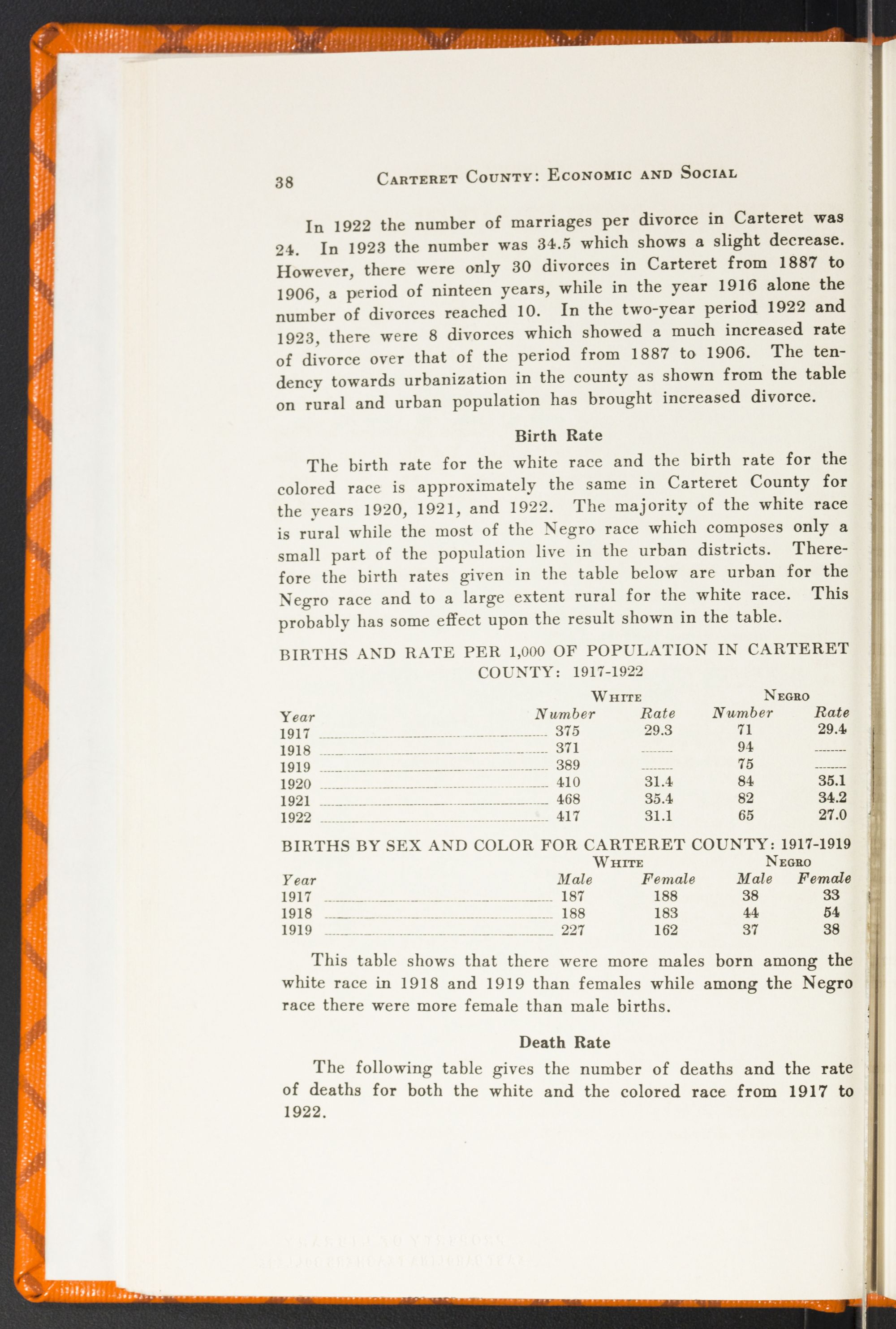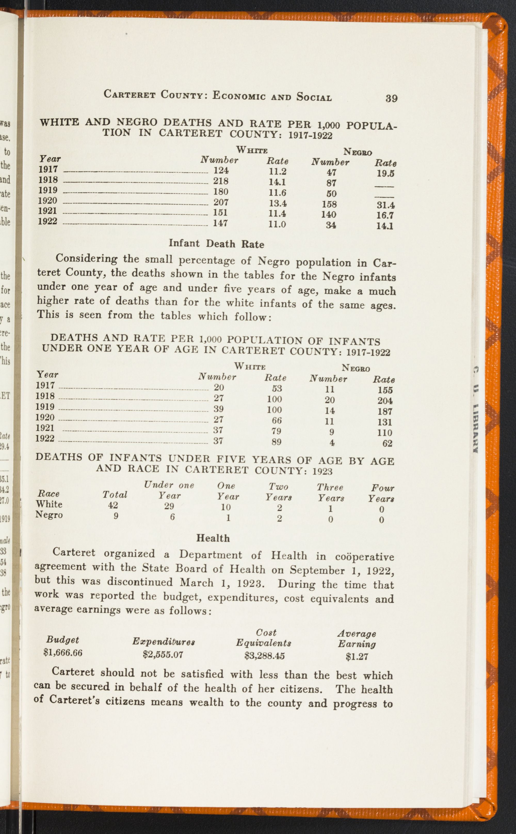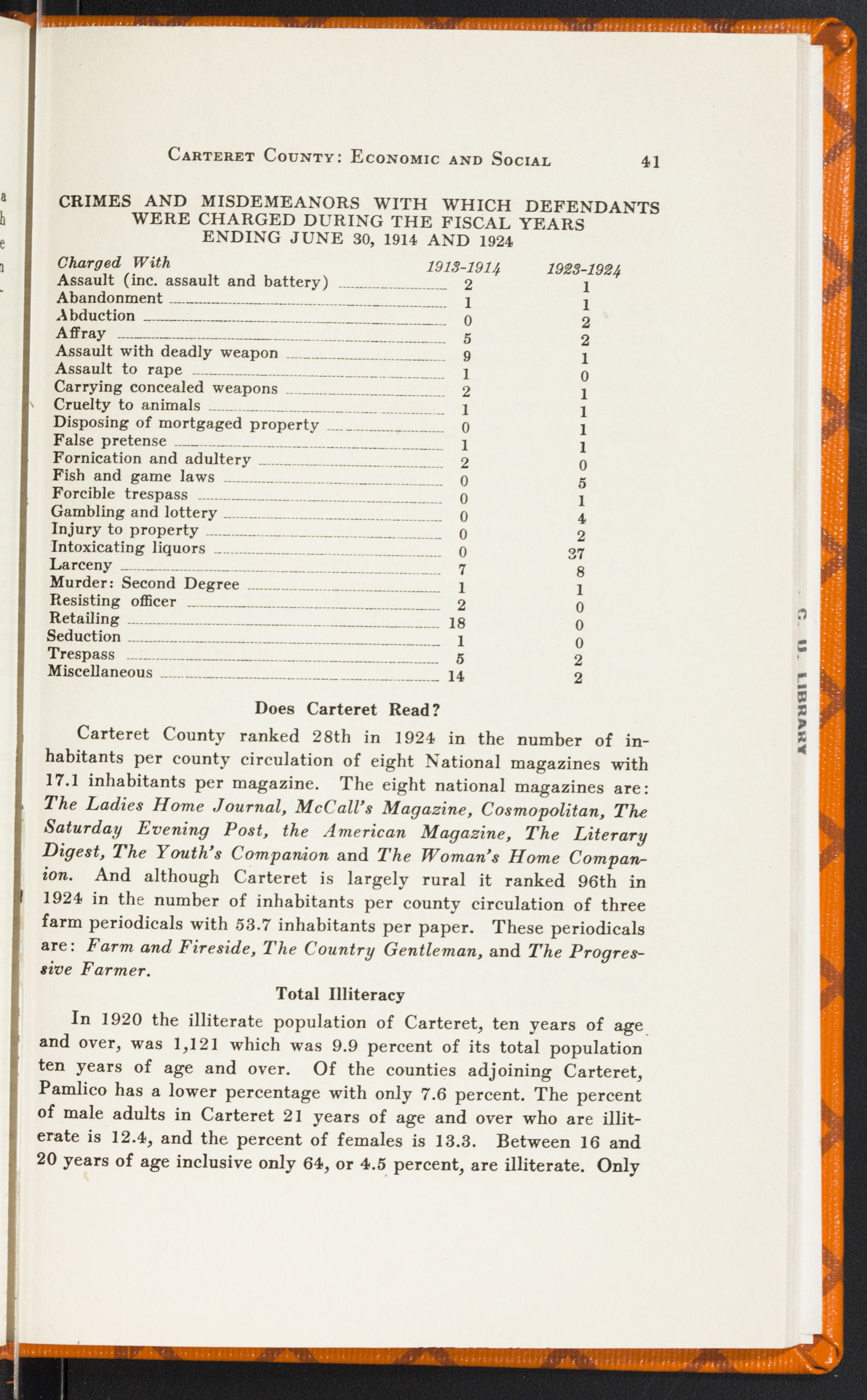 In North Carolina there were 44,000 illiterate white women in 1920—almost enough to fill a city the size of Charlotte. There were 344 of them in Carteret County. Or, in other words, we ranked 56th among the counties of the State in adult white female illiteracy with 10.4 percent of our total number unable to read or write their names—voters, now, who cannot make out a ballot! And 10.2 percent of our white men were in the same condition. But what shall we say of our negro illiterates—21.3 percent of the race in Carteret County? Is it possible for Carteret County whites to reach their highest and best development alongside of an illiterate, unsanitary, immoral negro race? For these things are bred by ignorance.