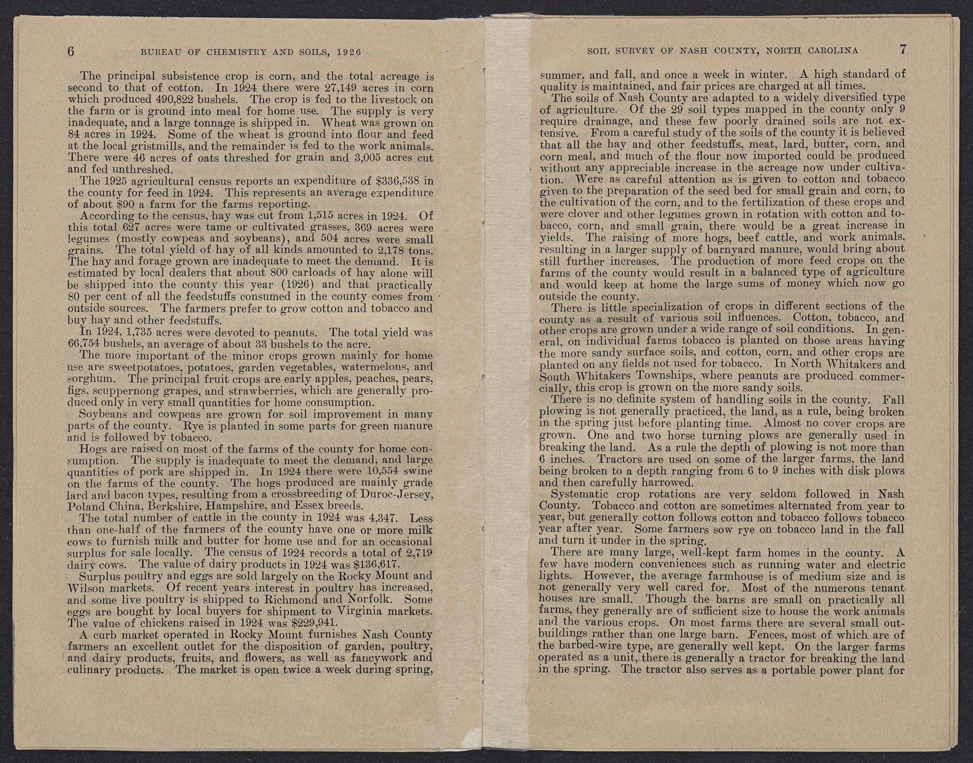 The system of agriculture now prevailing in Nash County is largely that common to the central part of eastern North Carolina. Cotton and tobacco are the principal cash crops. The agricultural and commercial standing of the county is based mainly on the prospective cotton and tobacco crops, and the prosperity of the county varies to a large extent with the price of these two crops. Cotton is still considered the staple farm product and is planted on all farms. According to the census, there were 63,532 acres planted to cotton in 1924, when the yield was 42,905 bales, or an average of 0.67 bale to the acre. This is a considerably higher average yield than that of the Cotton Belt.