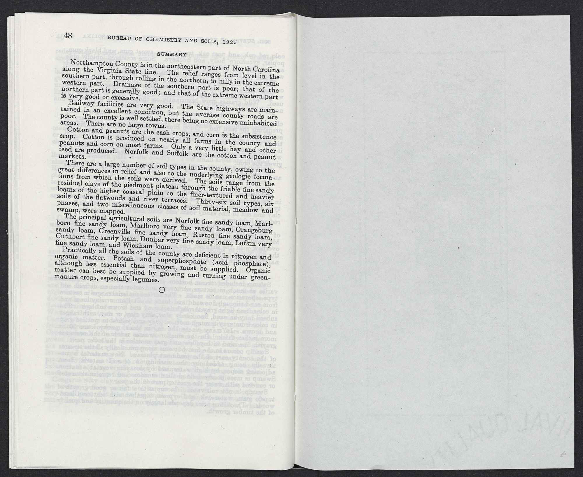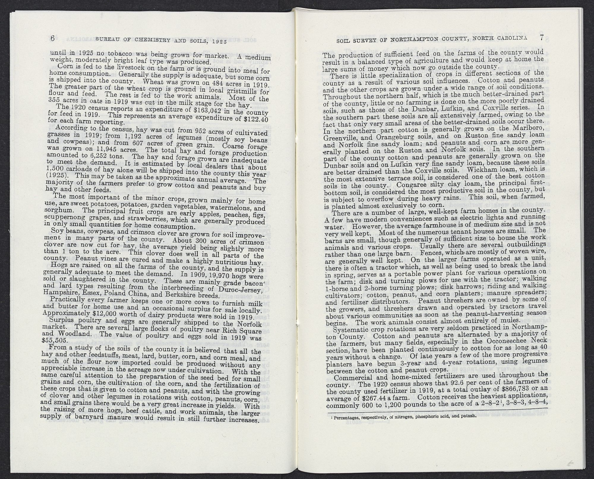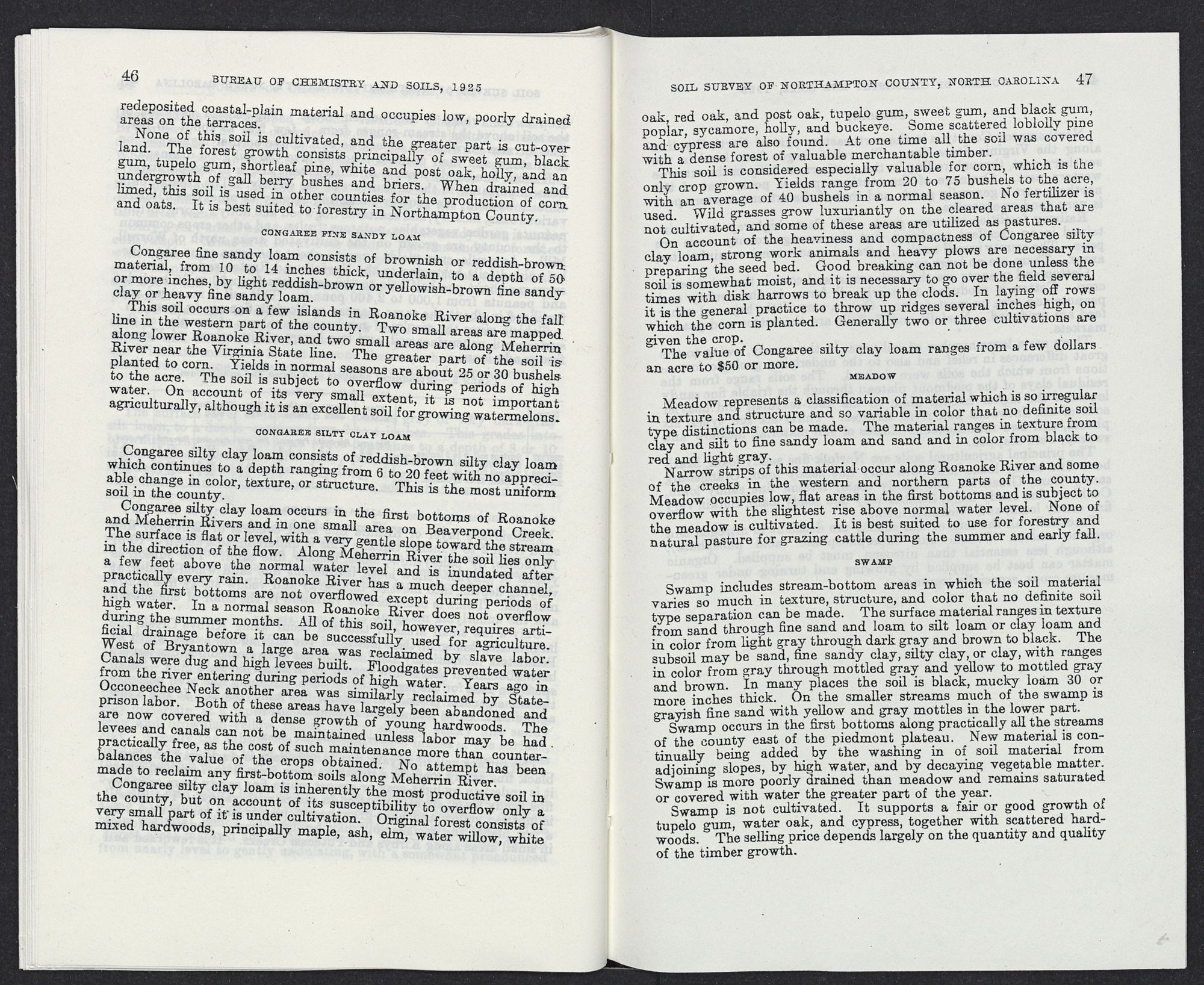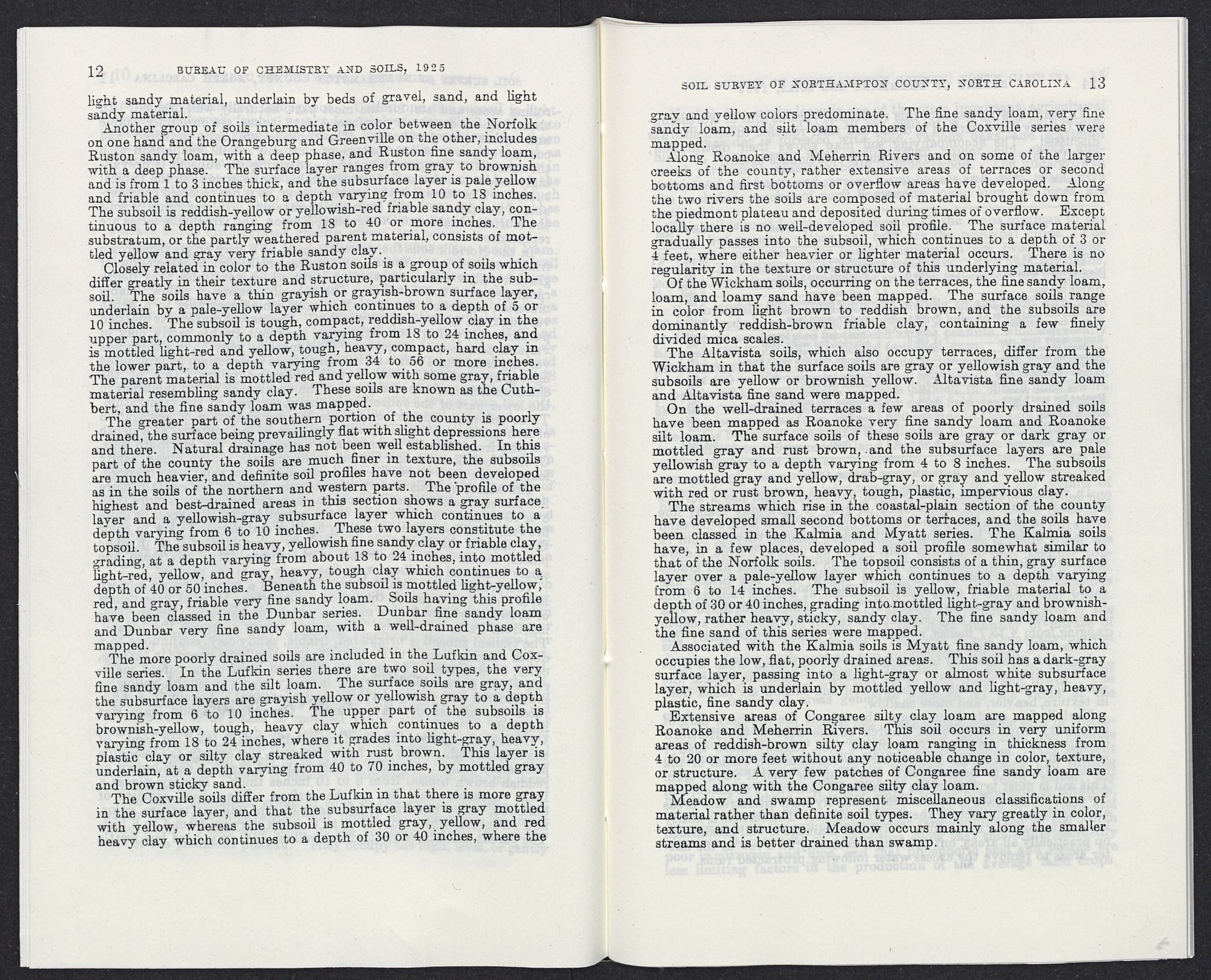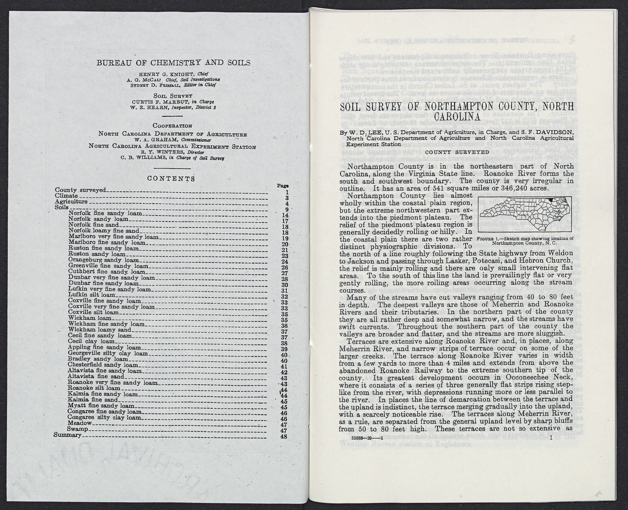 Number 9 Series 1925 UNITED STATES DEPARTMENT OF AGRICULTUREBUREAU OF CHEMISTRY AND SOILS In Cooperation with the North Carolina Department of Agricultureand the North Carolina Agricultural Experiment StationSOIL SURVEYOFNORTHAMPTON COUNTYNORTH CAROLINABYW. D. LEE, U. S. Department of Agriculture, in Charge and S. F. DAVIDSON, North Carolina Department of Agriculture and North Carolina Agricultural Experiment Station Beginning with the 1923 Series, Soil Survey Reports will be issued separately. These reports of the individual areas will be sent to libraries as soon as they are available and should be filed, preserved, and ultimately bound to take the place of the bound volumes of the Field Operations which have previously been supplied by the department. The reports for each year will be consecutively numbered, the last report for a particular year bearing the conspicuous notice: “This number is the final and last Soil Survey Report for the Year 192-.” United States Department of Agriculture 1862 Agriculture is the Foundation of Manufacture and Commerce 1889