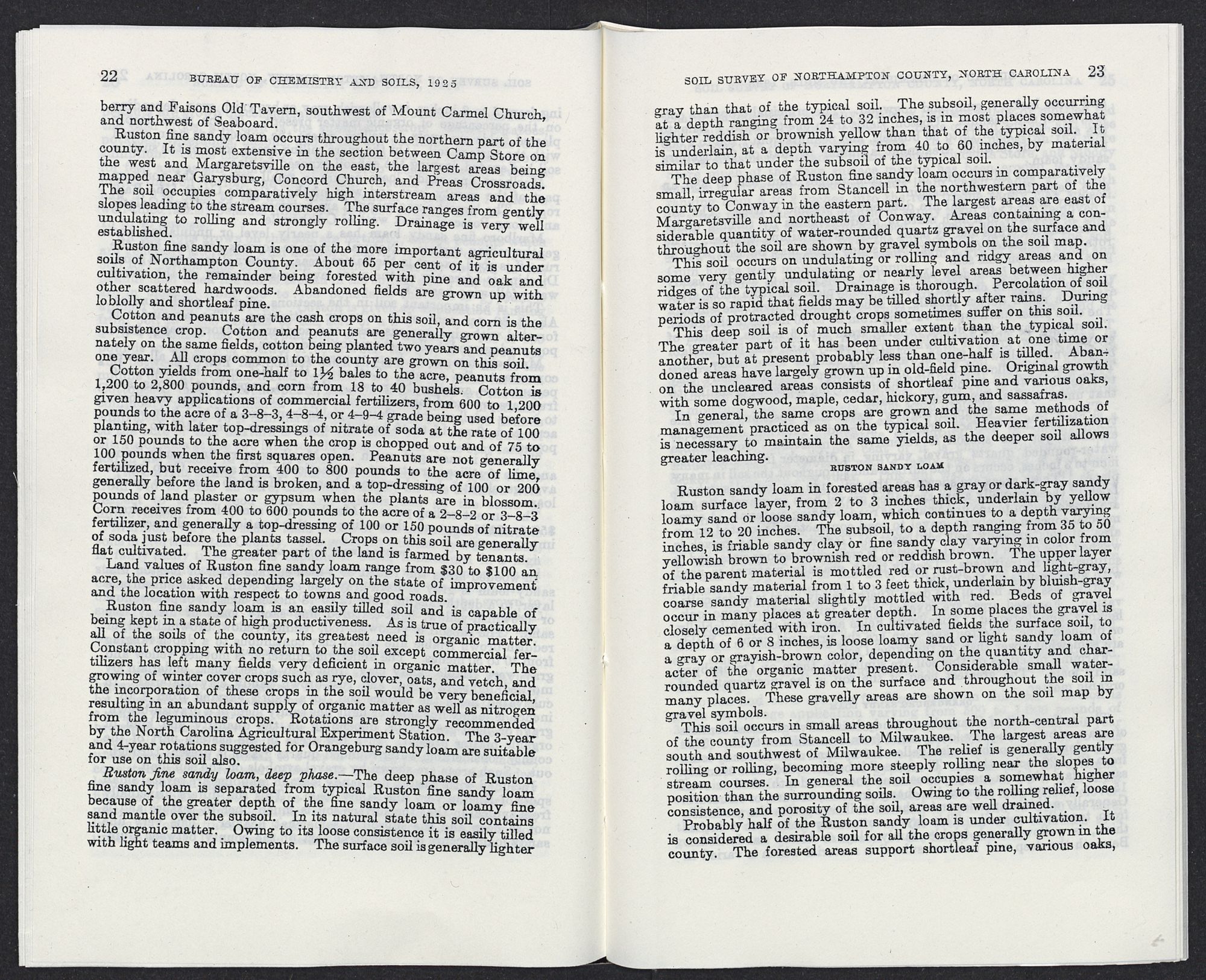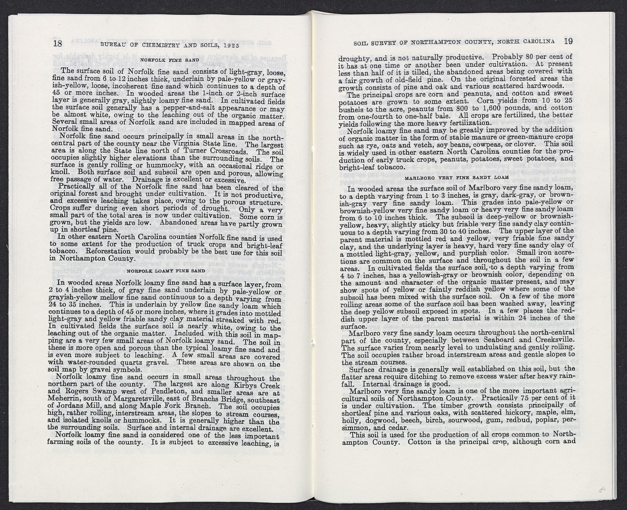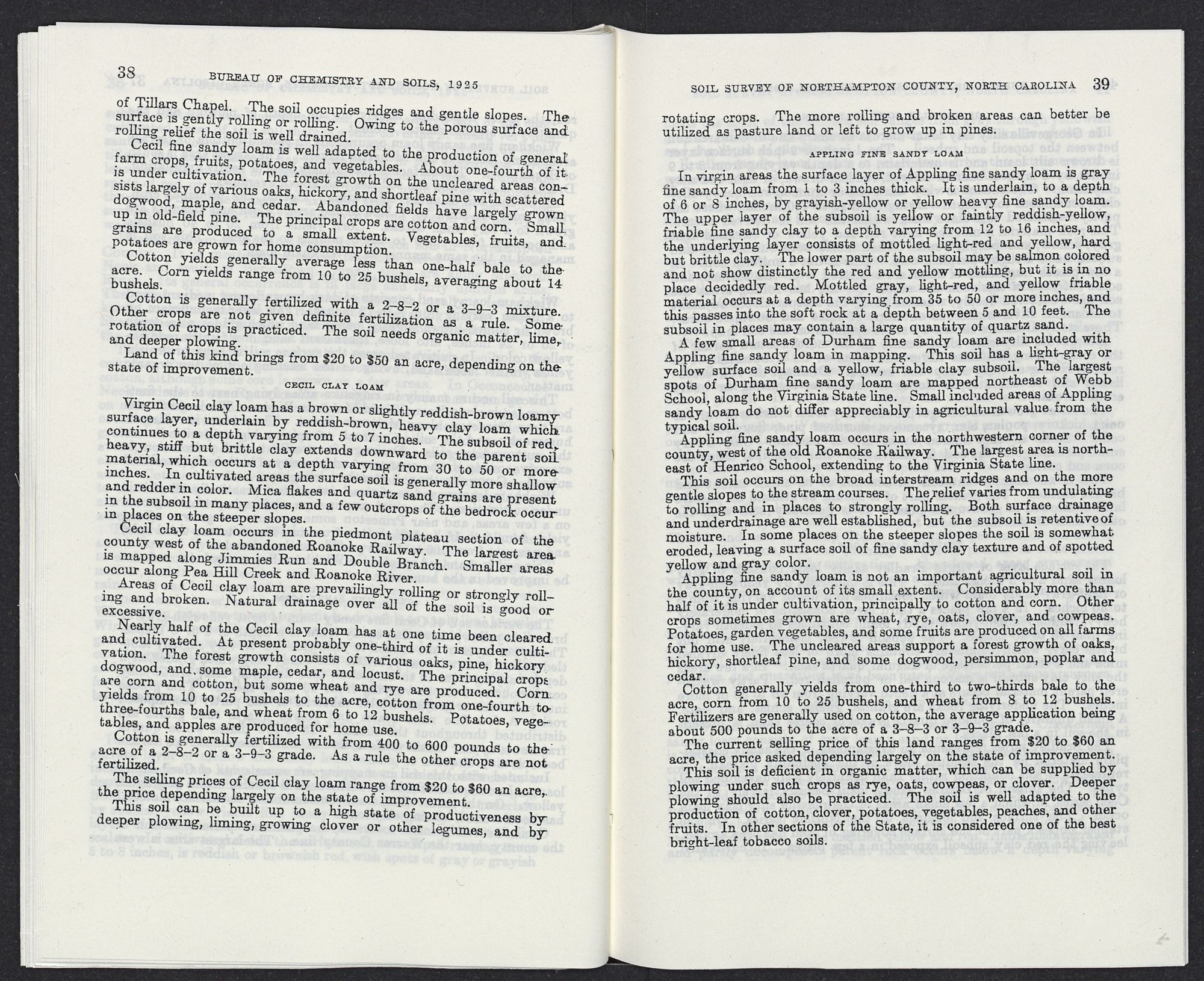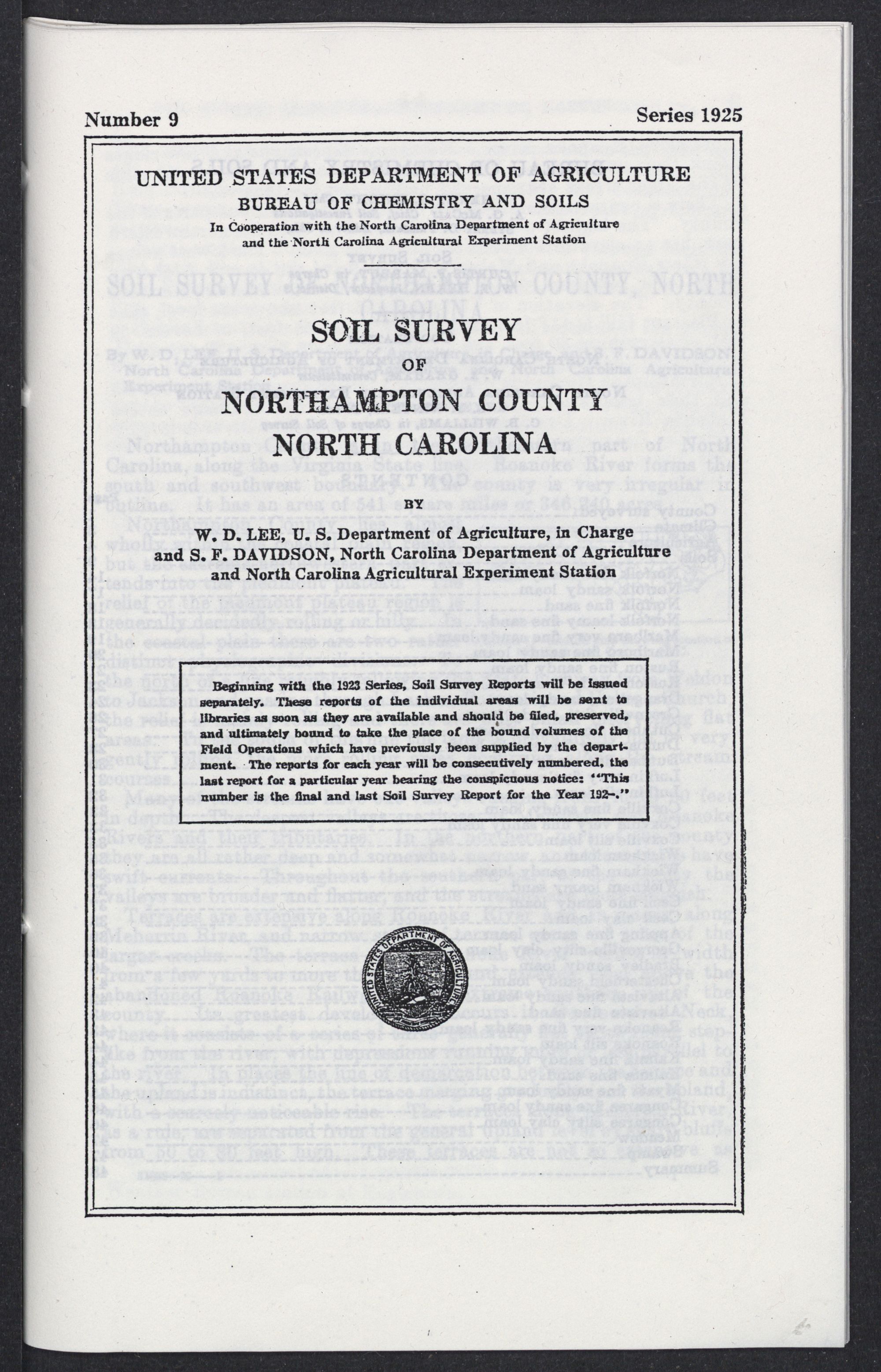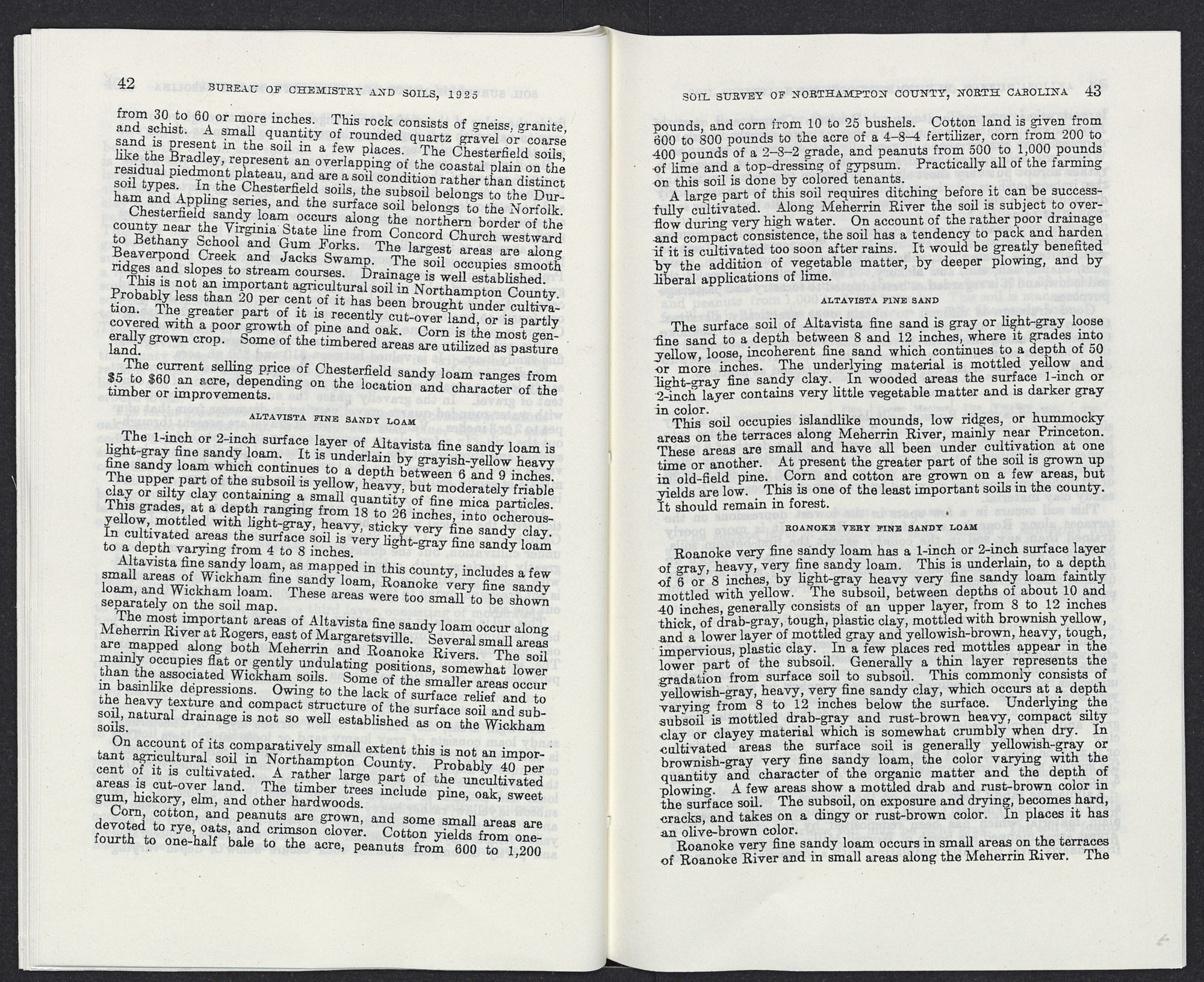 Number 9 Series 1925 UNITED STATES DEPARTMENT OF AGRICULTUREBUREAU OF CHEMISTRY AND SOILS In Cooperation with the North Carolina Department of Agricultureand the North Carolina Agricultural Experiment StationSOIL SURVEYOFNORTHAMPTON COUNTYNORTH CAROLINABYW. D. LEE, U. S. Department of Agriculture, in Charge and S. F. DAVIDSON, North Carolina Department of Agriculture and North Carolina Agricultural Experiment Station Beginning with the 1923 Series, Soil Survey Reports will be issued separately. These reports of the individual areas will be sent to libraries as soon as they are available and should be filed, preserved, and ultimately bound to take the place of the bound volumes of the Field Operations which have previously been supplied by the department. The reports for each year will be consecutively numbered, the last report for a particular year bearing the conspicuous notice: “This number is the final and last Soil Survey Report for the Year 192-.” United States Department of Agriculture 1862 Agriculture is the Foundation of Manufacture and Commerce 1889