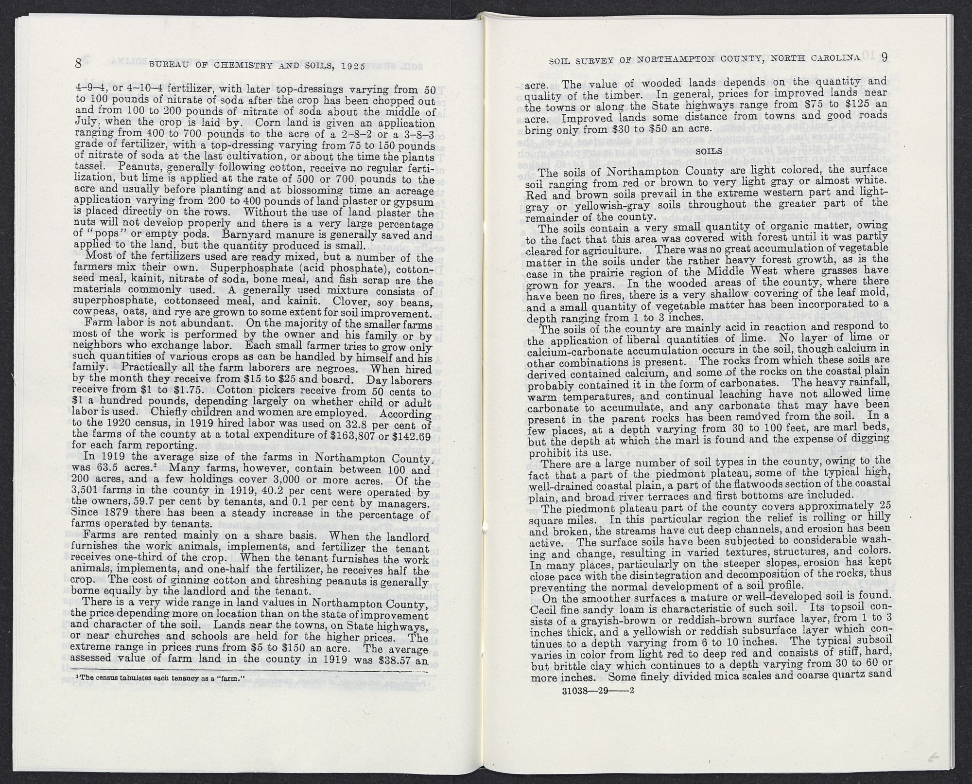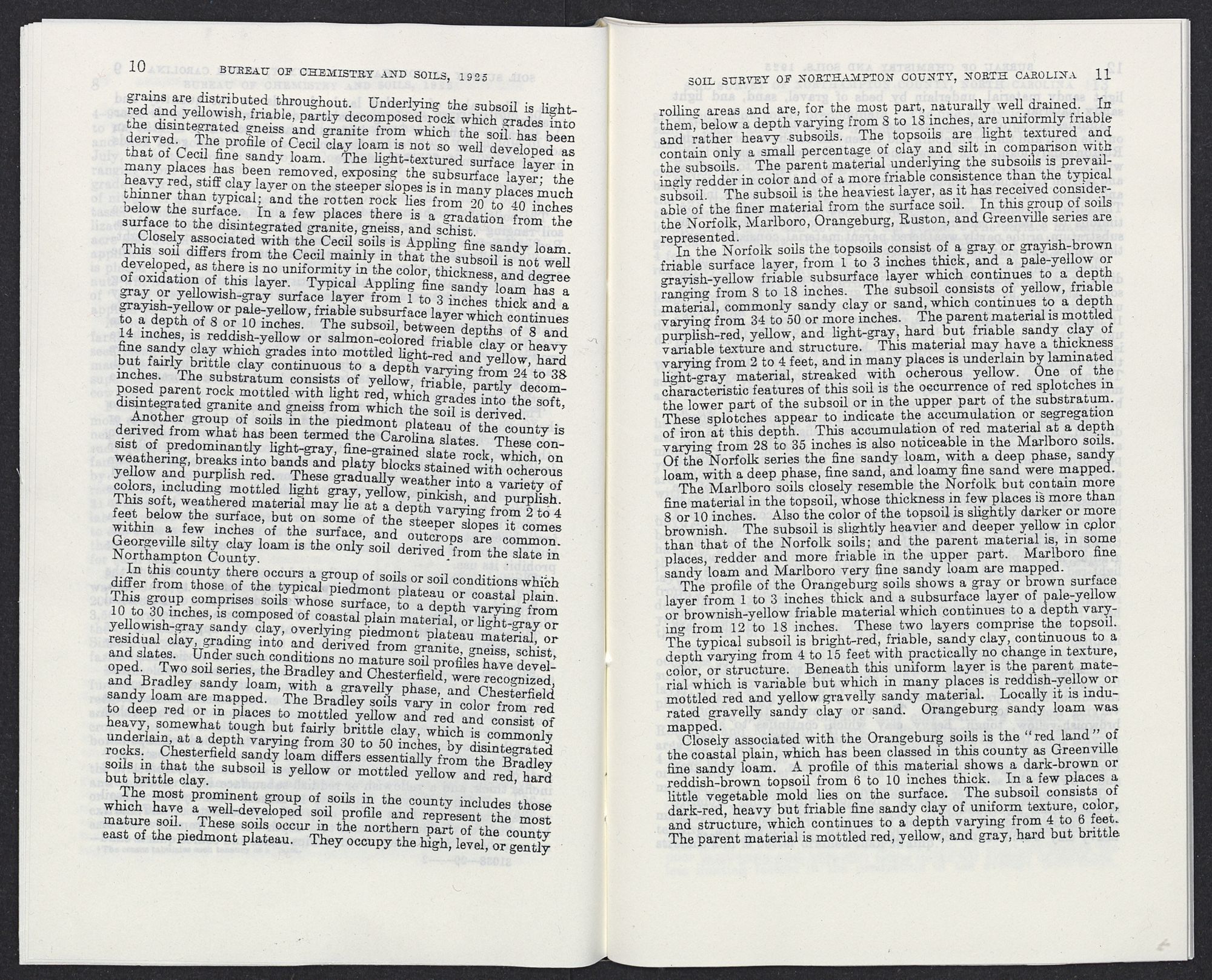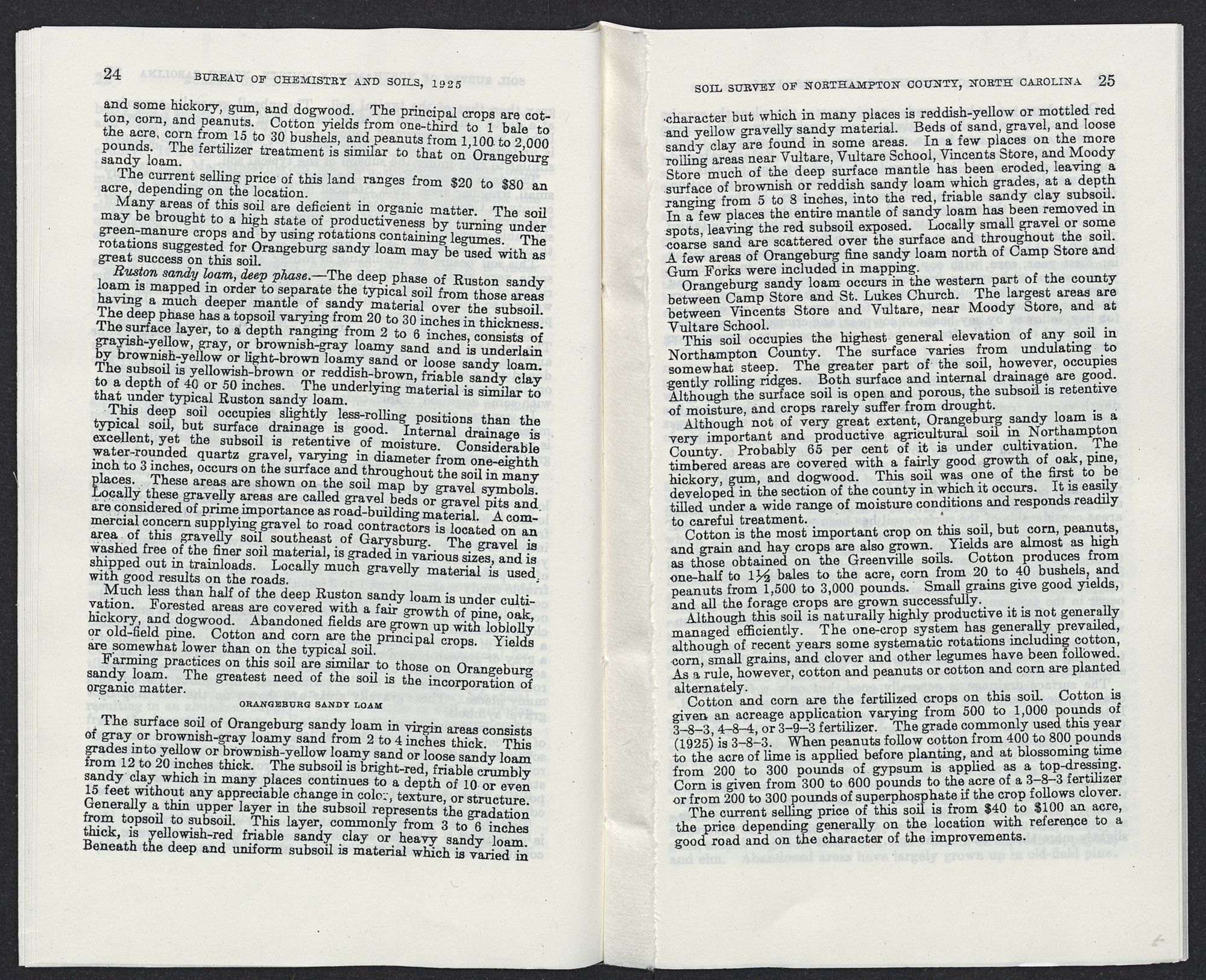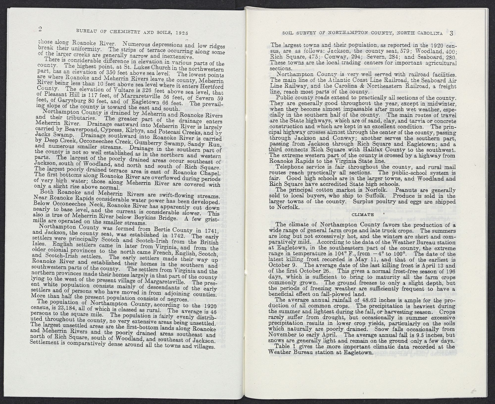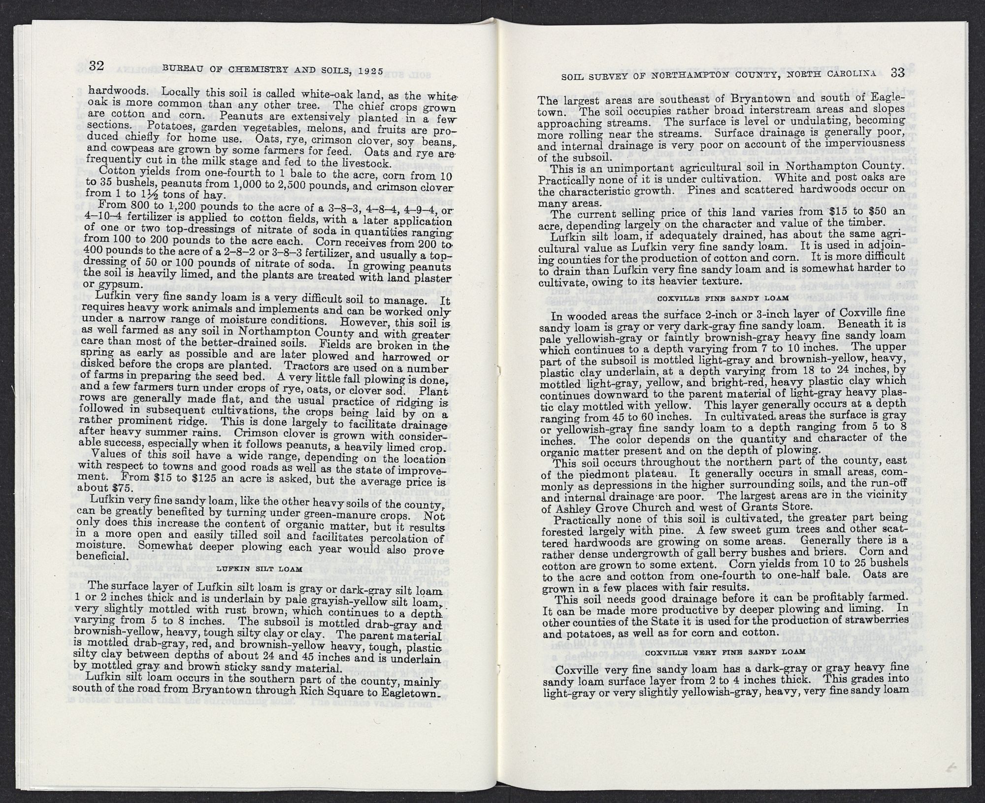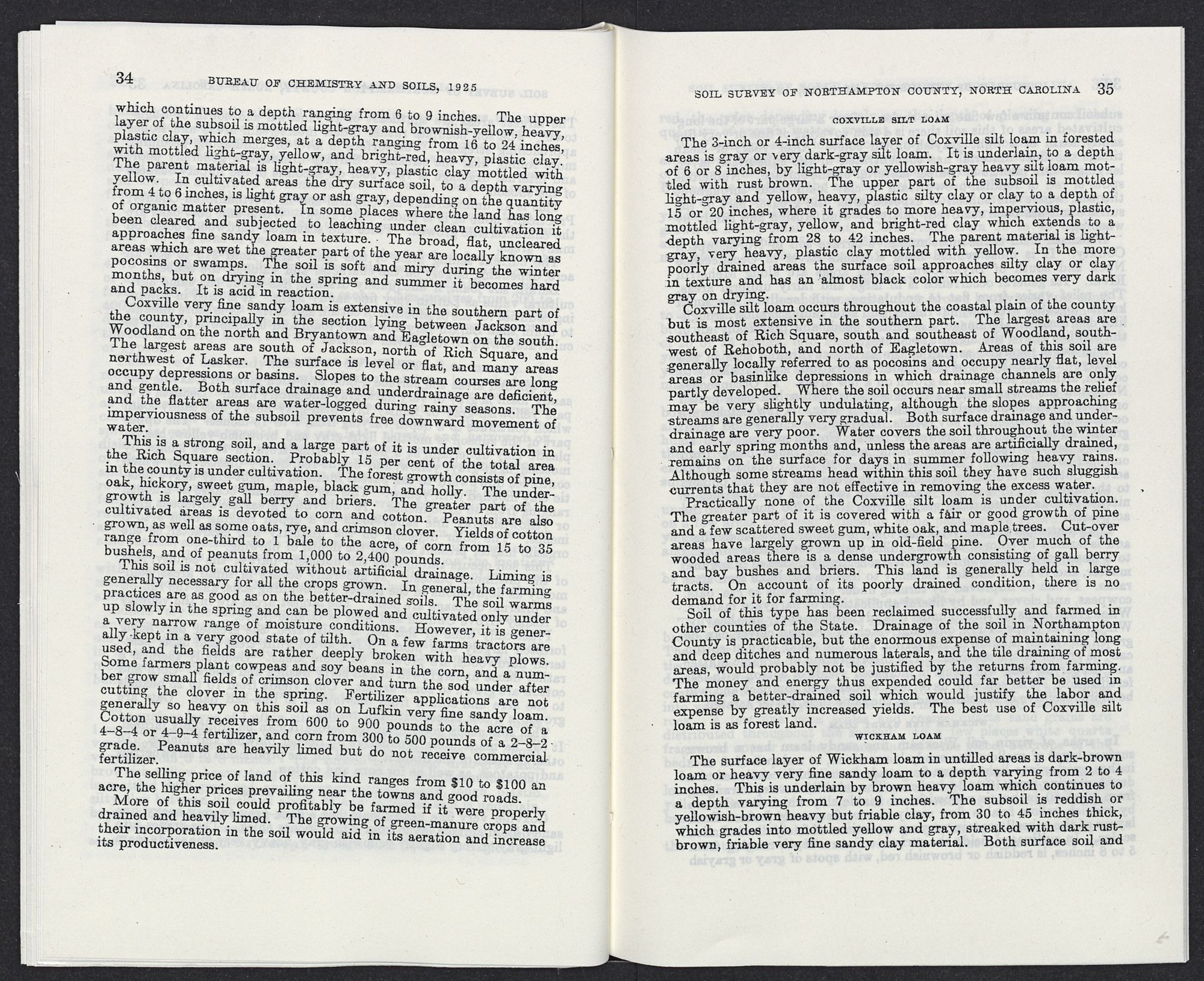 Number 9 Series 1925 UNITED STATES DEPARTMENT OF AGRICULTUREBUREAU OF CHEMISTRY AND SOILS In Cooperation with the North Carolina Department of Agricultureand the North Carolina Agricultural Experiment StationSOIL SURVEYOFNORTHAMPTON COUNTYNORTH CAROLINABYW. D. LEE, U. S. Department of Agriculture, in Charge and S. F. DAVIDSON, North Carolina Department of Agriculture and North Carolina Agricultural Experiment Station Beginning with the 1923 Series, Soil Survey Reports will be issued separately. These reports of the individual areas will be sent to libraries as soon as they are available and should be filed, preserved, and ultimately bound to take the place of the bound volumes of the Field Operations which have previously been supplied by the department. The reports for each year will be consecutively numbered, the last report for a particular year bearing the conspicuous notice: “This number is the final and last Soil Survey Report for the Year 192-.” United States Department of Agriculture 1862 Agriculture is the Foundation of Manufacture and Commerce 1889