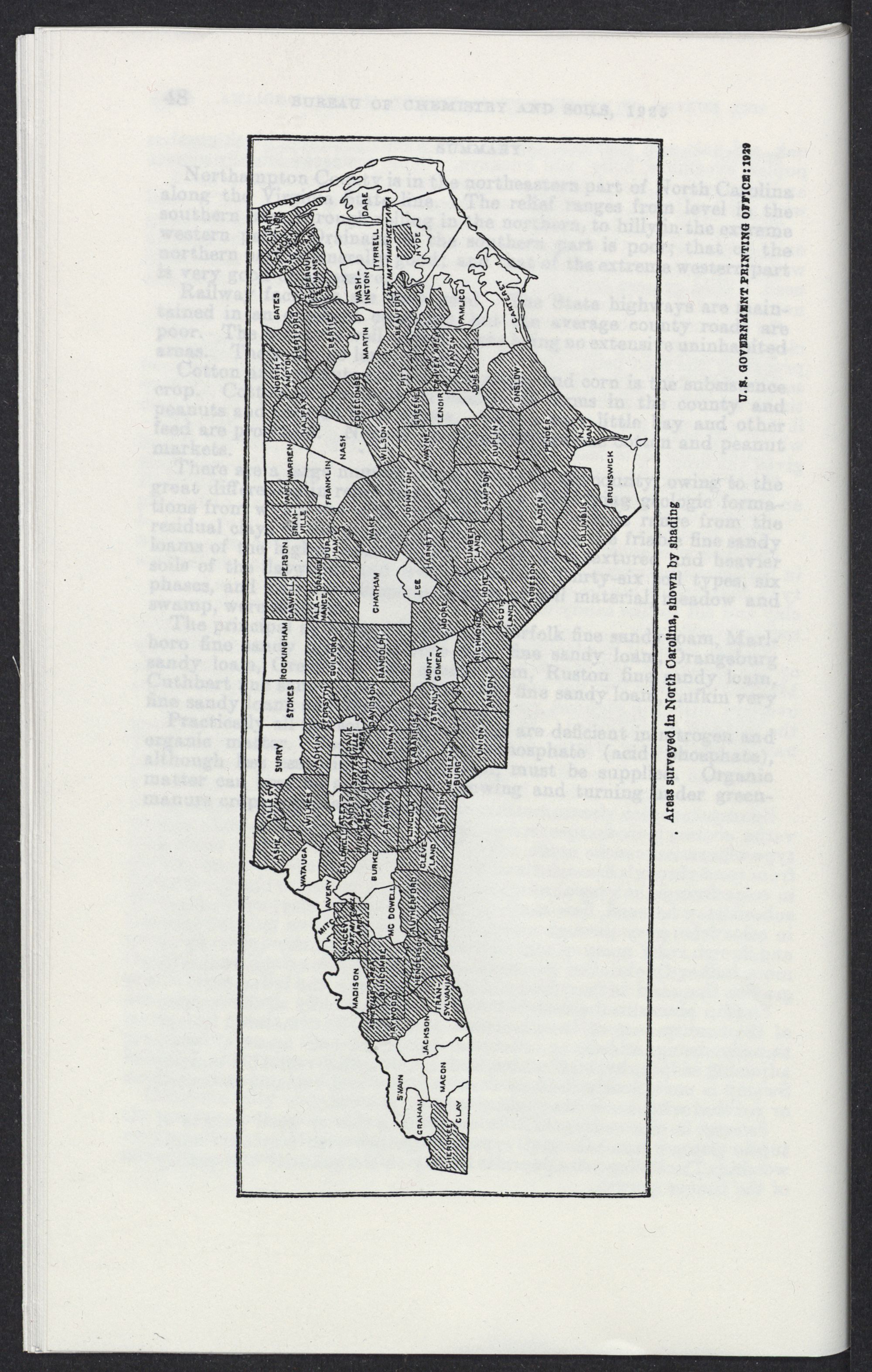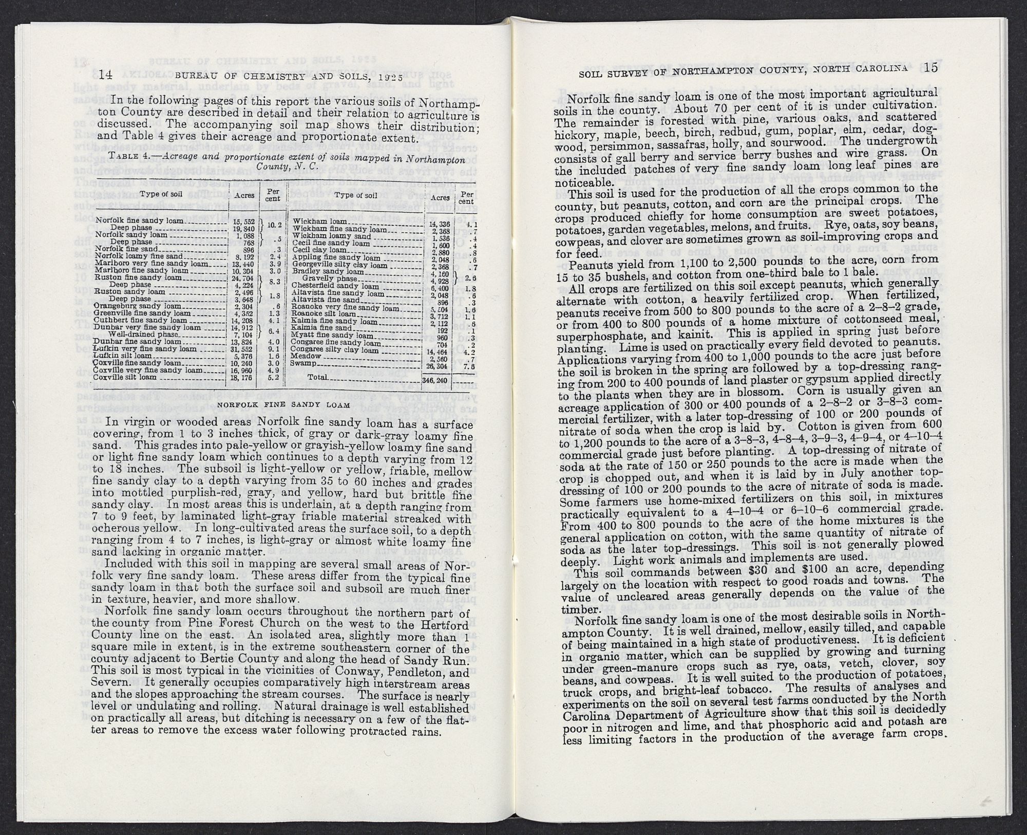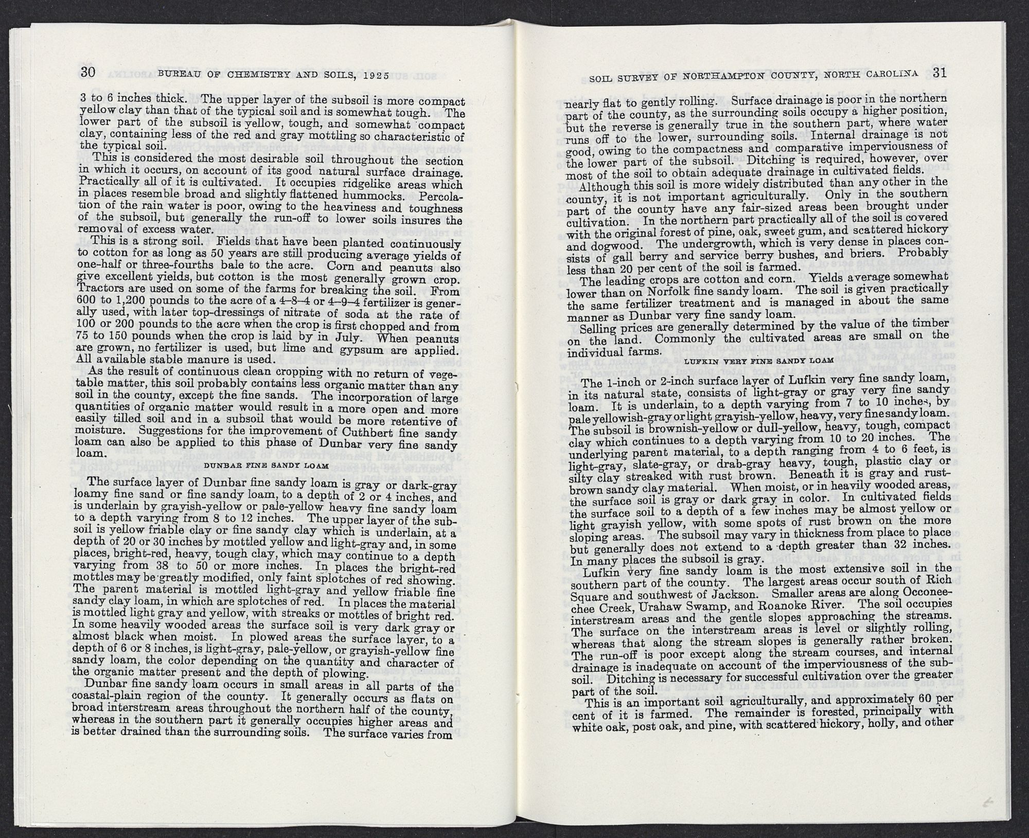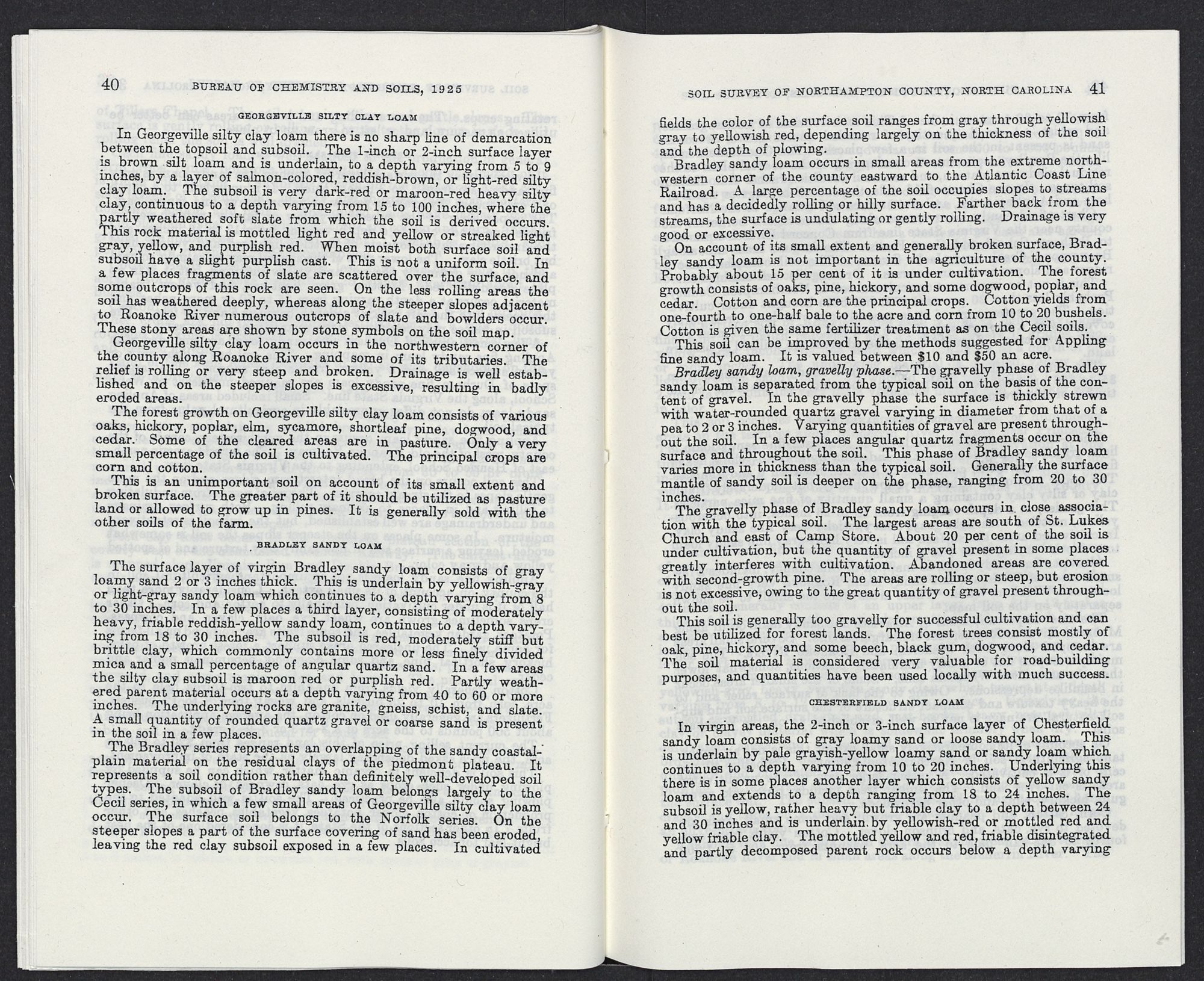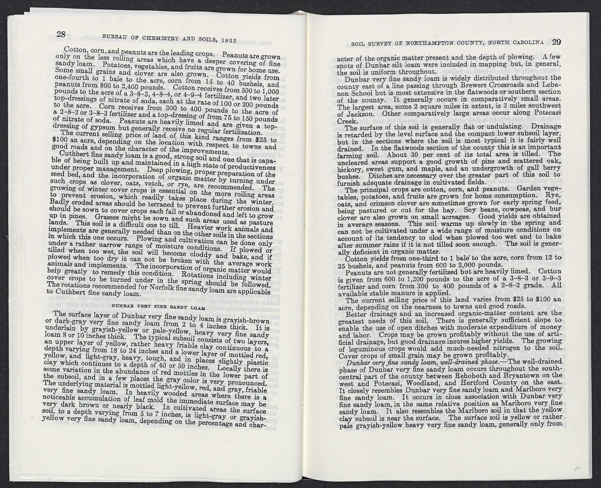 Number 9 Series 1925 UNITED STATES DEPARTMENT OF AGRICULTUREBUREAU OF CHEMISTRY AND SOILS In Cooperation with the North Carolina Department of Agricultureand the North Carolina Agricultural Experiment StationSOIL SURVEYOFNORTHAMPTON COUNTYNORTH CAROLINABYW. D. LEE, U. S. Department of Agriculture, in Charge and S. F. DAVIDSON, North Carolina Department of Agriculture and North Carolina Agricultural Experiment Station Beginning with the 1923 Series, Soil Survey Reports will be issued separately. These reports of the individual areas will be sent to libraries as soon as they are available and should be filed, preserved, and ultimately bound to take the place of the bound volumes of the Field Operations which have previously been supplied by the department. The reports for each year will be consecutively numbered, the last report for a particular year bearing the conspicuous notice: “This number is the final and last Soil Survey Report for the Year 192-.” United States Department of Agriculture 1862 Agriculture is the Foundation of Manufacture and Commerce 1889