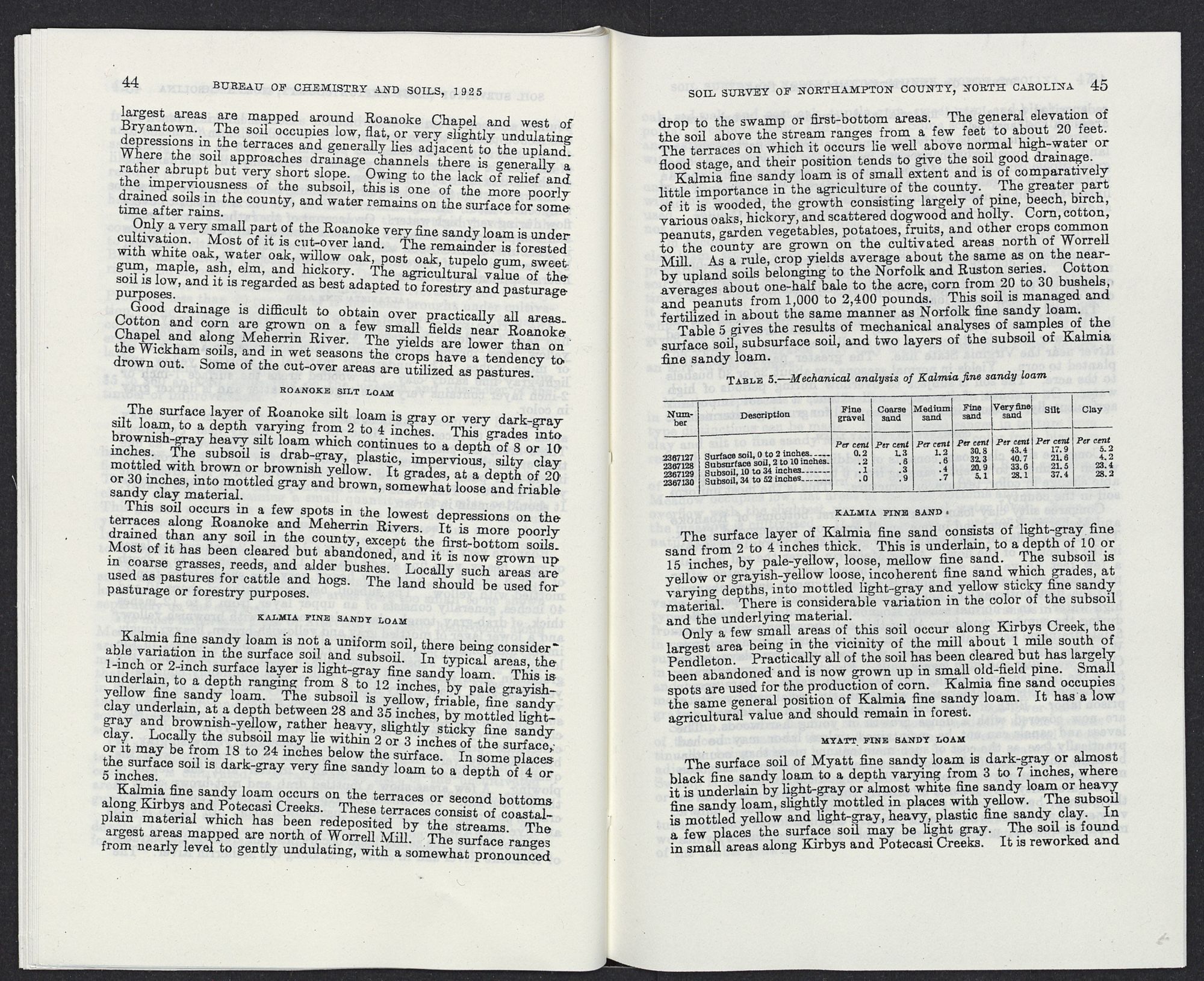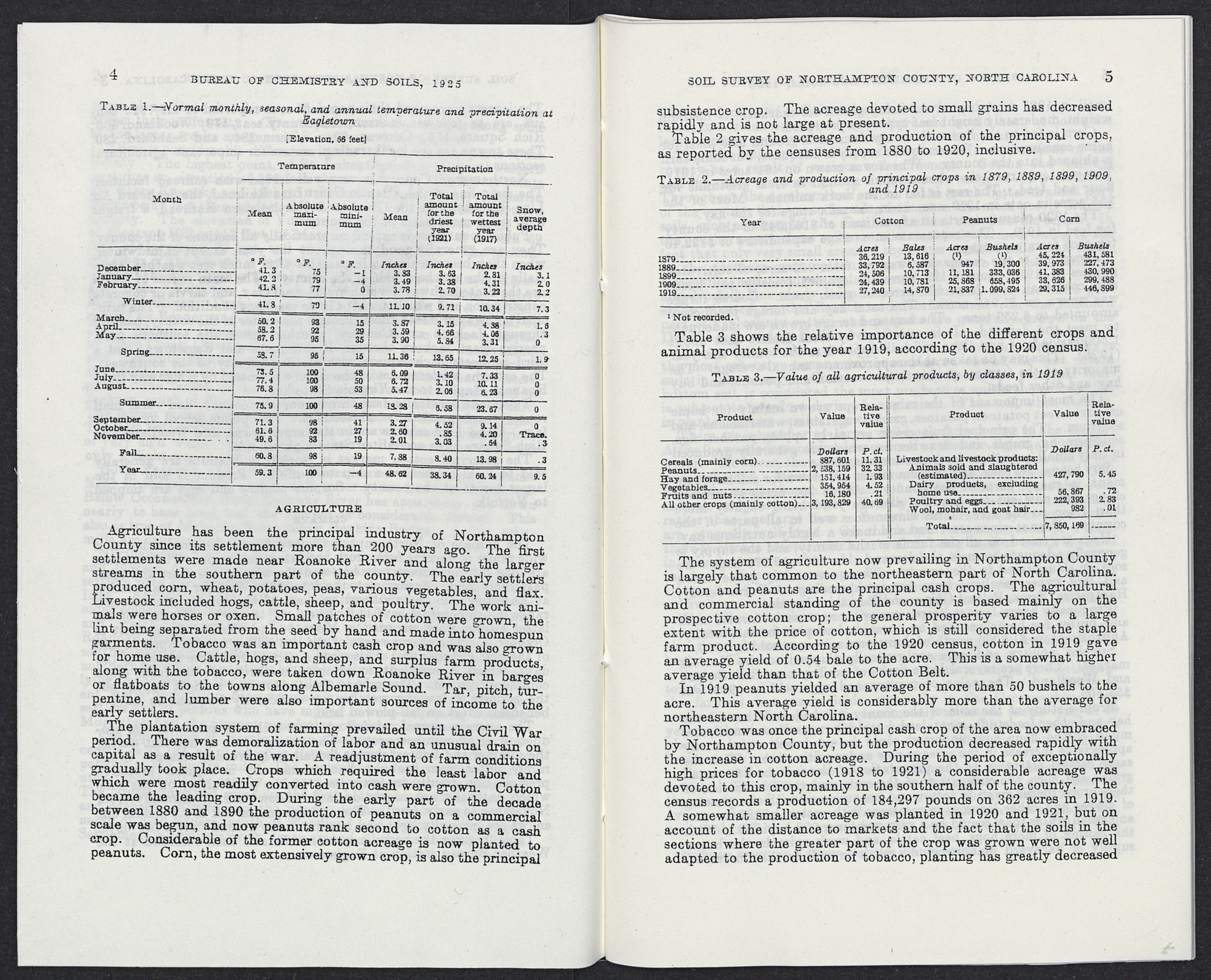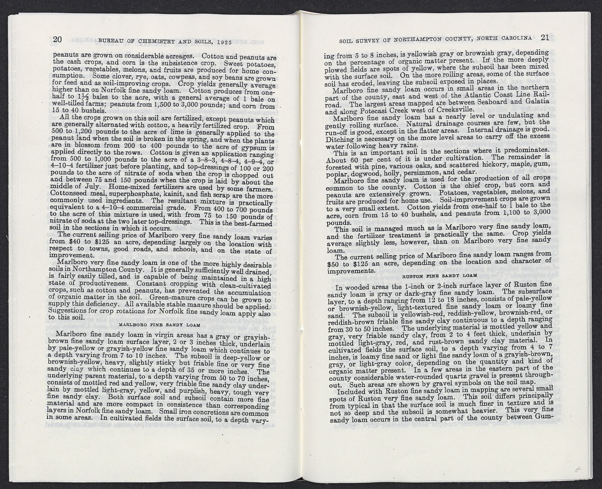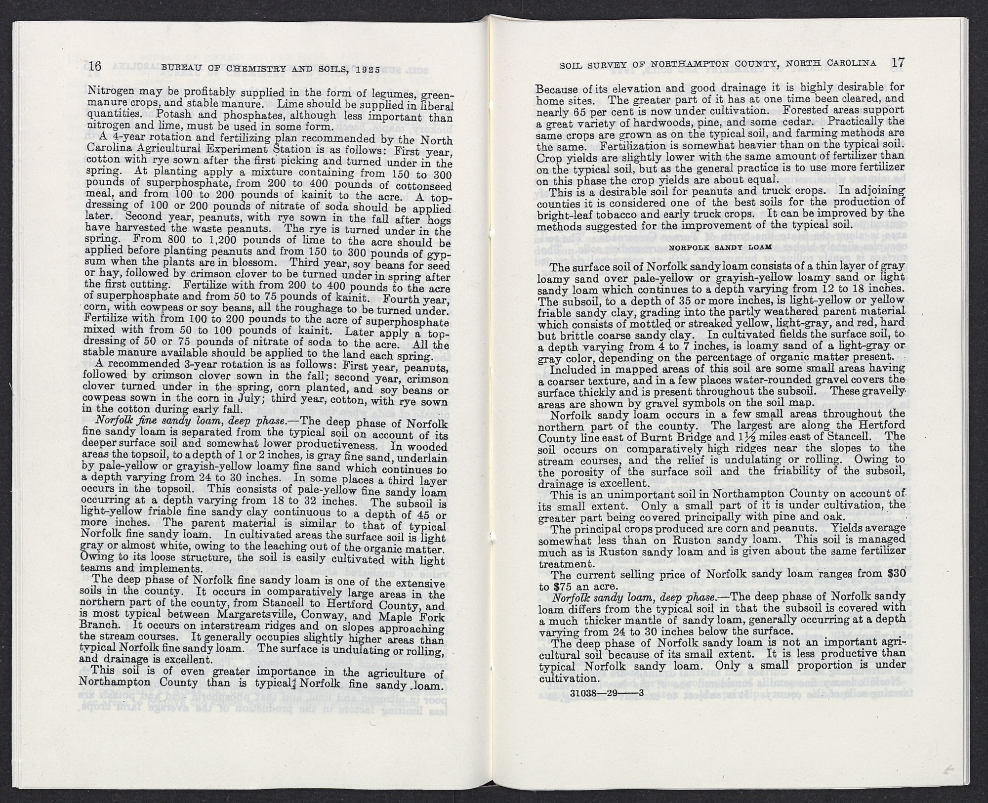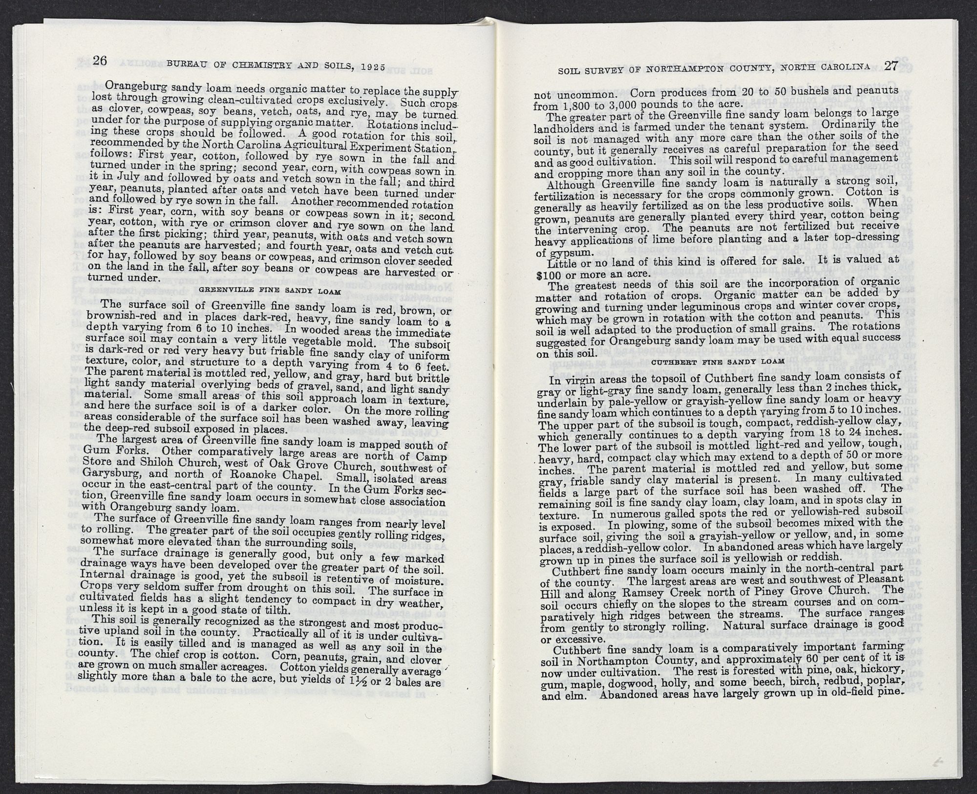 Number 9 Series 1925 UNITED STATES DEPARTMENT OF AGRICULTUREBUREAU OF CHEMISTRY AND SOILS In Cooperation with the North Carolina Department of Agricultureand the North Carolina Agricultural Experiment StationSOIL SURVEYOFNORTHAMPTON COUNTYNORTH CAROLINABYW. D. LEE, U. S. Department of Agriculture, in Charge and S. F. DAVIDSON, North Carolina Department of Agriculture and North Carolina Agricultural Experiment Station Beginning with the 1923 Series, Soil Survey Reports will be issued separately. These reports of the individual areas will be sent to libraries as soon as they are available and should be filed, preserved, and ultimately bound to take the place of the bound volumes of the Field Operations which have previously been supplied by the department. The reports for each year will be consecutively numbered, the last report for a particular year bearing the conspicuous notice: “This number is the final and last Soil Survey Report for the Year 192-.” United States Department of Agriculture 1862 Agriculture is the Foundation of Manufacture and Commerce 1889
