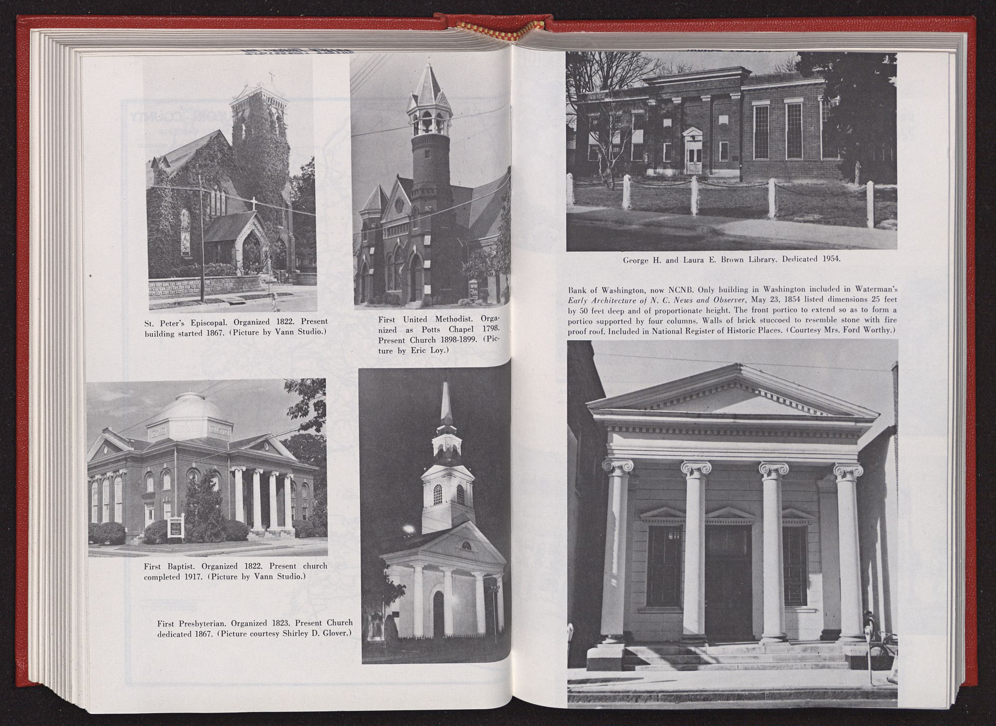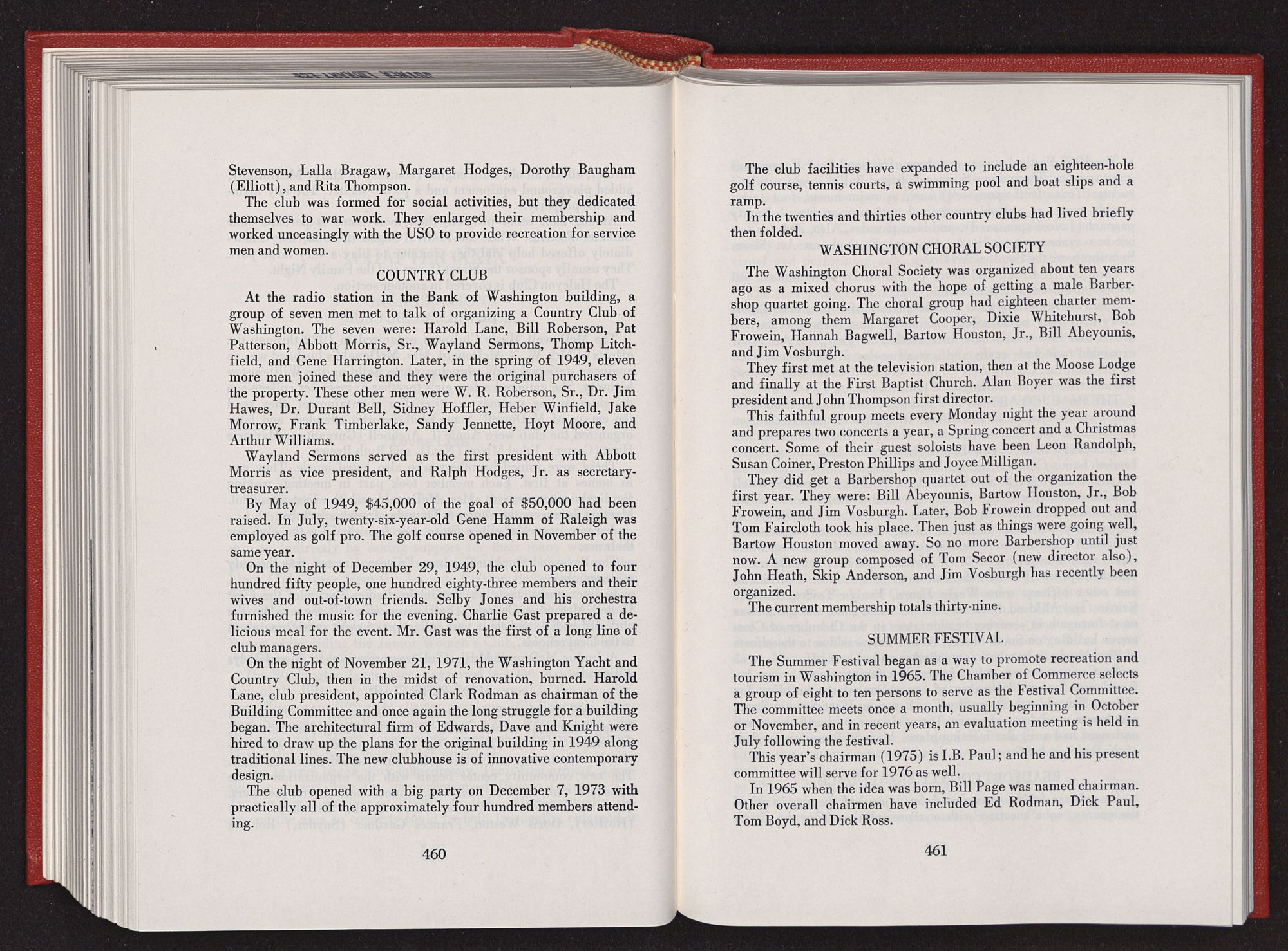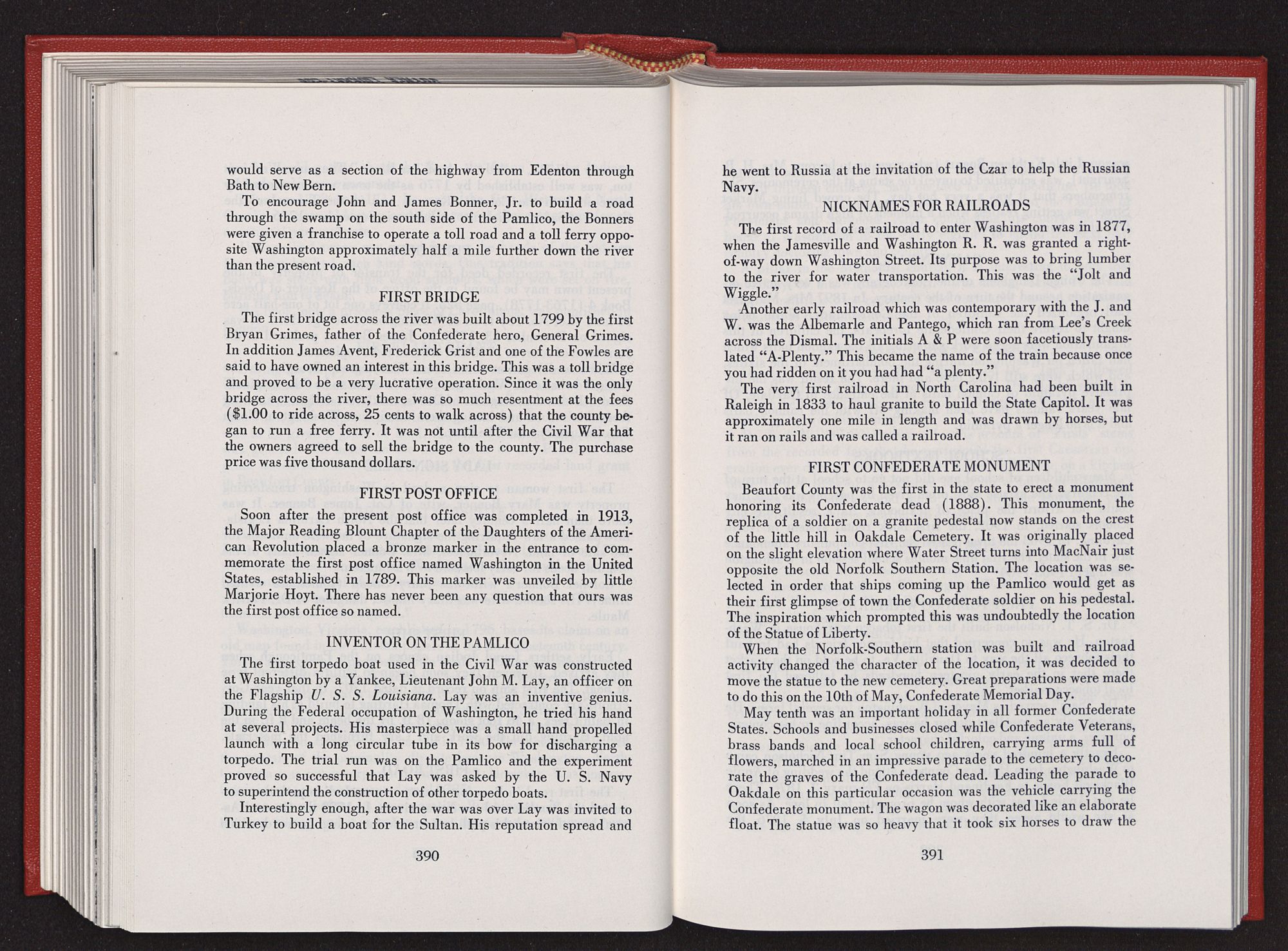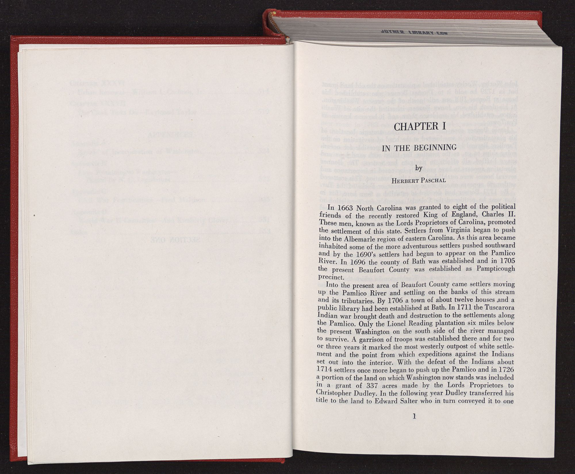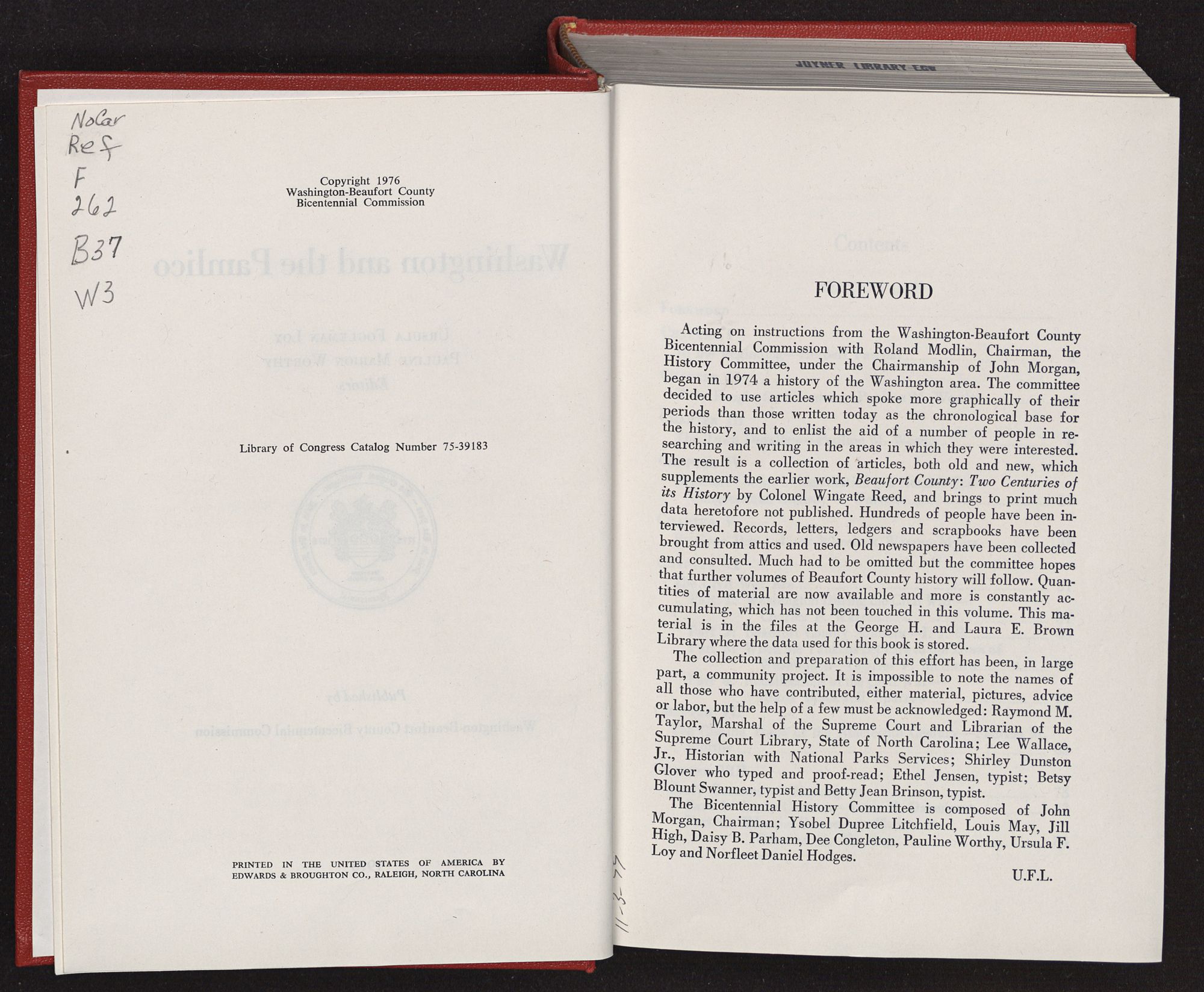 FOREWORDActing on instructions from the Washington-Beaufort County Bicentennial Commission with Roland Modlin, Chairman, the History Committee, under the Chairmanship of John Morgan, began in 1974 a history of the Washington area. The committee decided to use articles which spoke more graphically of their periods than those written today as the chronological base for the history, and to enlist the aid of a number of people in researching and writing in the areas in which they were interested. The result is a collection of articles, both old and new, which supplements the earlier work, Beaufort County: Two Centuries of its History by Colonel Wingate Reed, and brings to print much data heretofore not published. Hundreds of people have been interviewed. Records, letters, ledgers and scrapbooks have been brought from attics and used. Old newspapers have been collected and consulted. Much had to be omitted but the committee hopes that further volumes of Beaufort County history will follow. Quantities of material are now available and more is constantly accumulating, which has not been touched in this volume. This material is in the files at the George H. and Laura E. Brown Library where the data used for this book is stored.