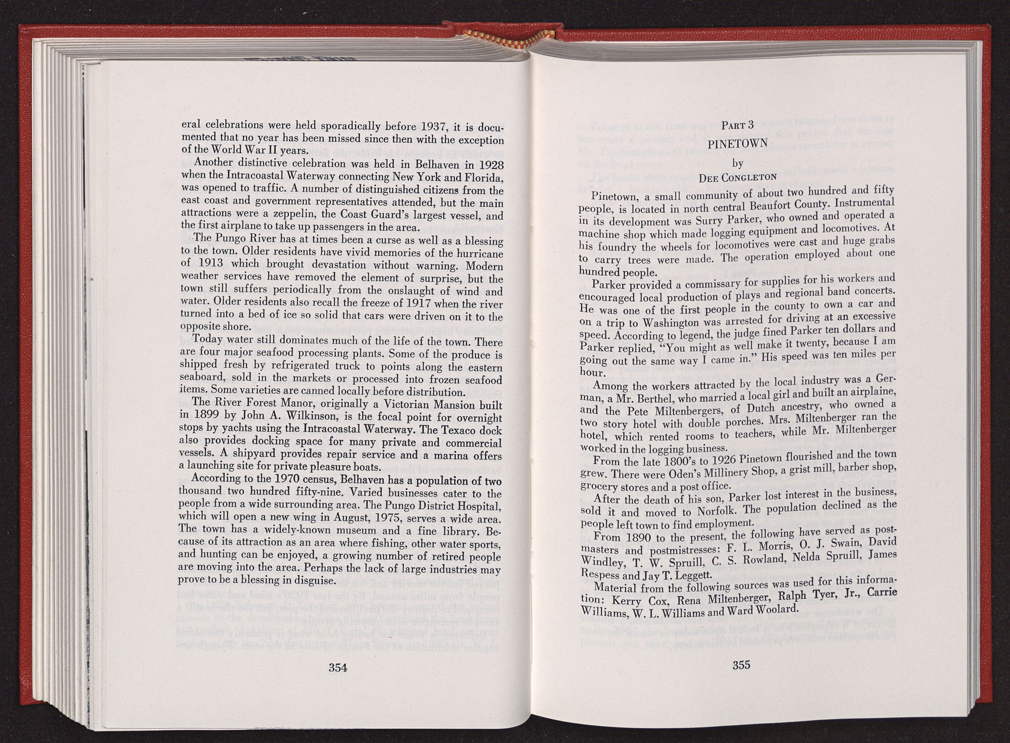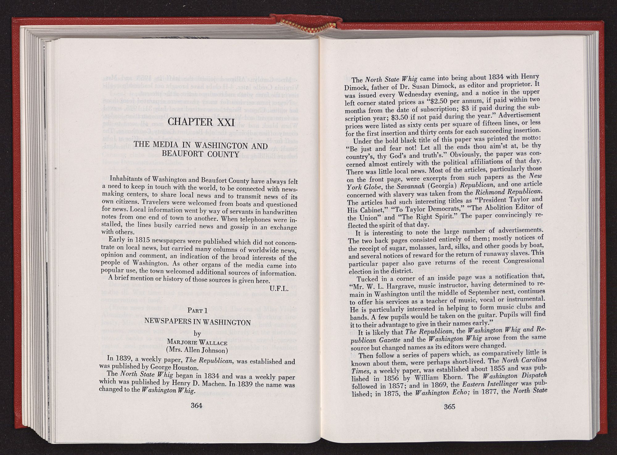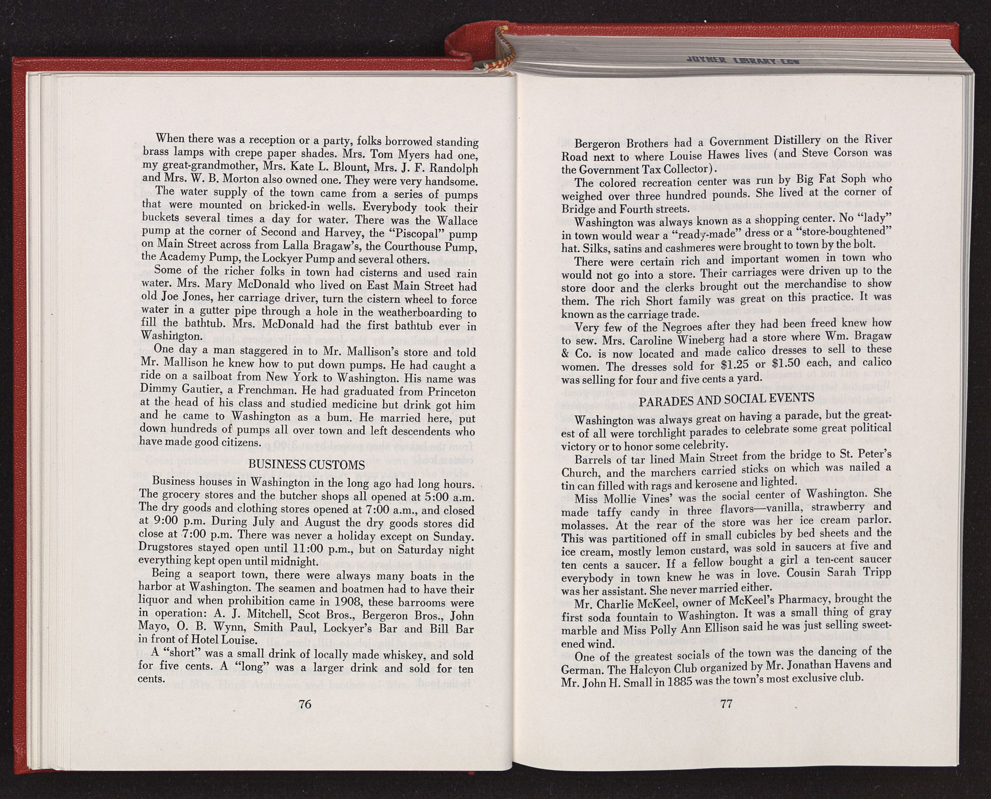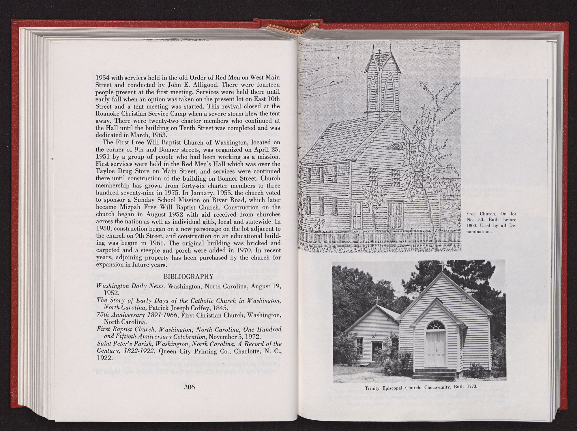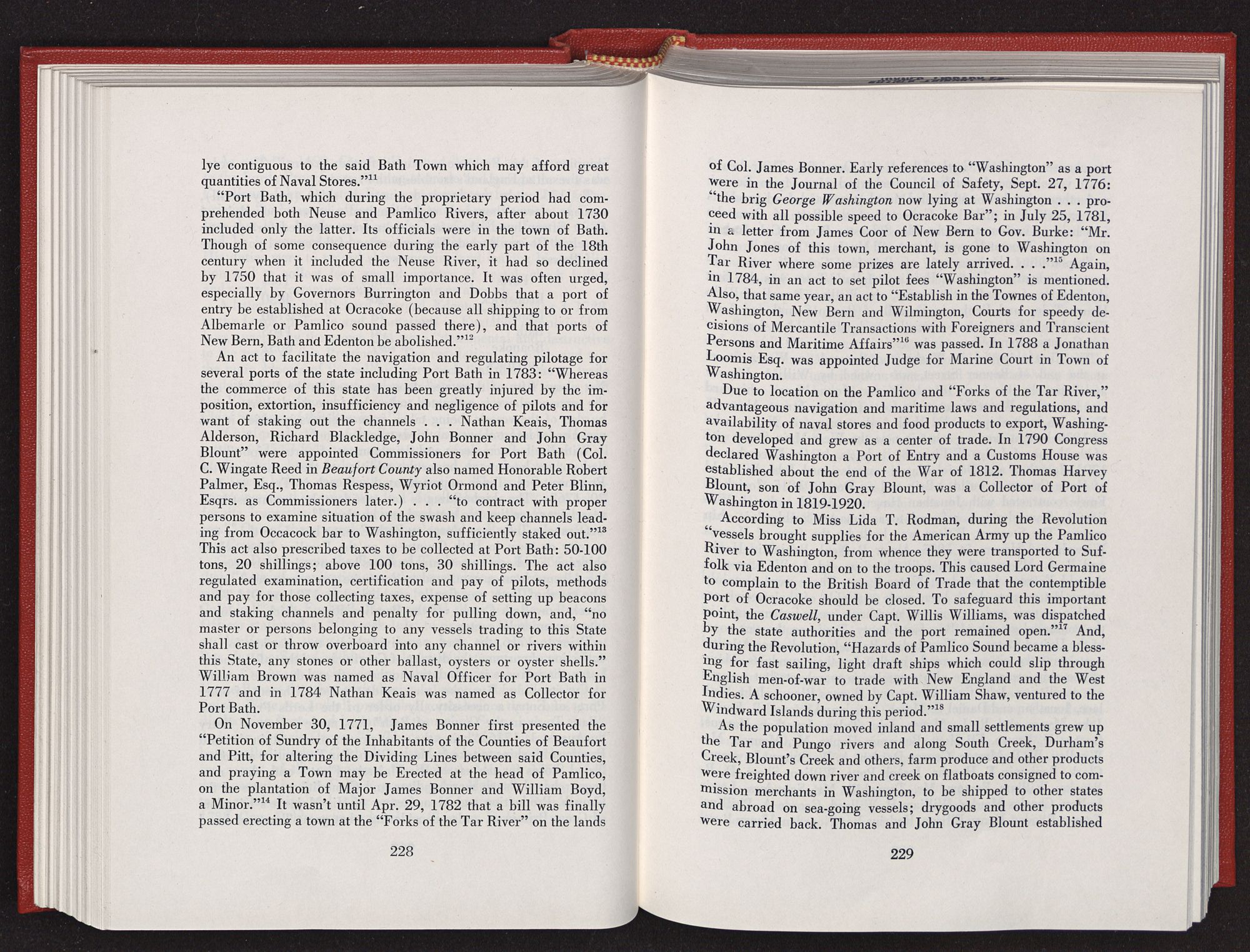 FOREWORDActing on instructions from the Washington-Beaufort County Bicentennial Commission with Roland Modlin, Chairman, the History Committee, under the Chairmanship of John Morgan, began in 1974 a history of the Washington area. The committee decided to use articles which spoke more graphically of their periods than those written today as the chronological base for the history, and to enlist the aid of a number of people in researching and writing in the areas in which they were interested. The result is a collection of articles, both old and new, which supplements the earlier work, Beaufort County: Two Centuries of its History by Colonel Wingate Reed, and brings to print much data heretofore not published. Hundreds of people have been interviewed. Records, letters, ledgers and scrapbooks have been brought from attics and used. Old newspapers have been collected and consulted. Much had to be omitted but the committee hopes that further volumes of Beaufort County history will follow. Quantities of material are now available and more is constantly accumulating, which has not been touched in this volume. This material is in the files at the George H. and Laura E. Brown Library where the data used for this book is stored.