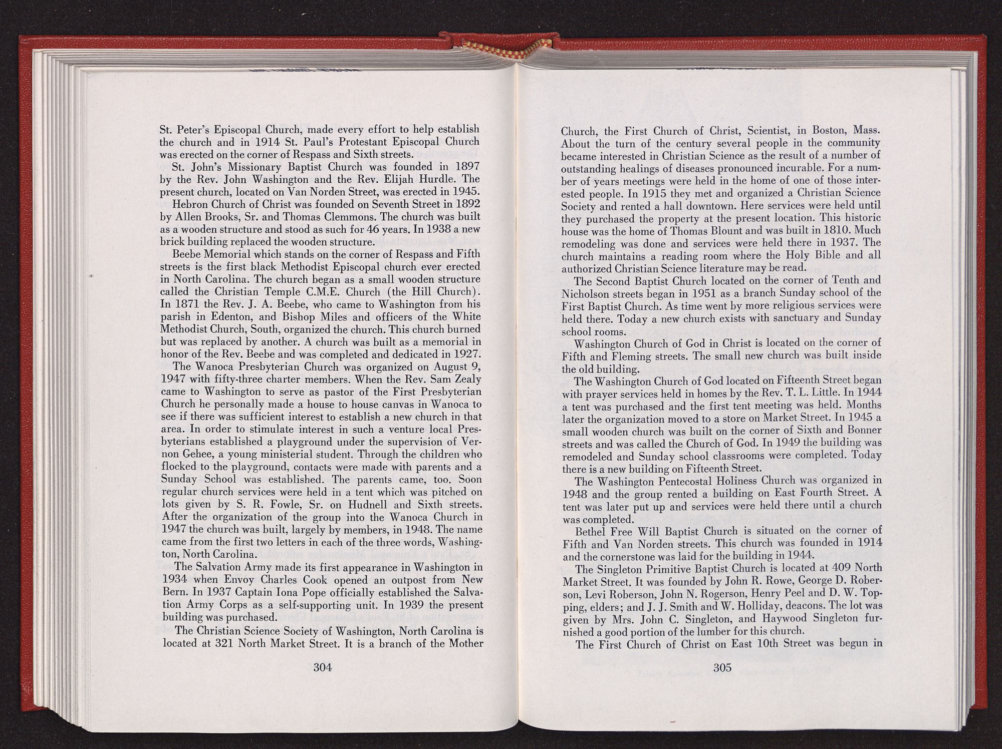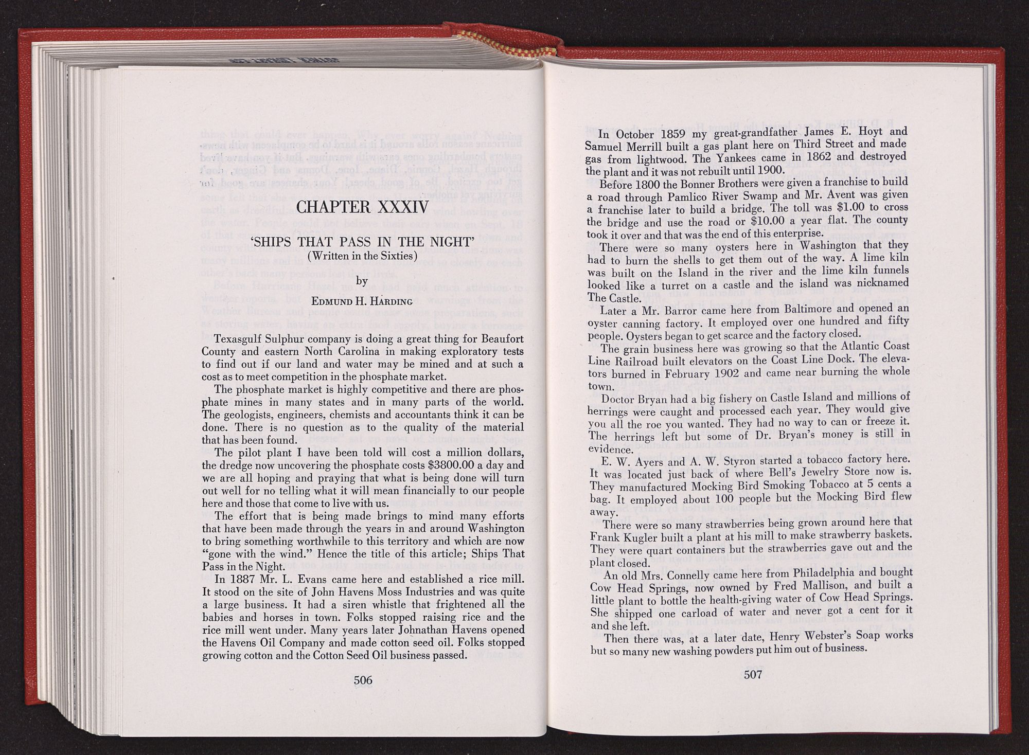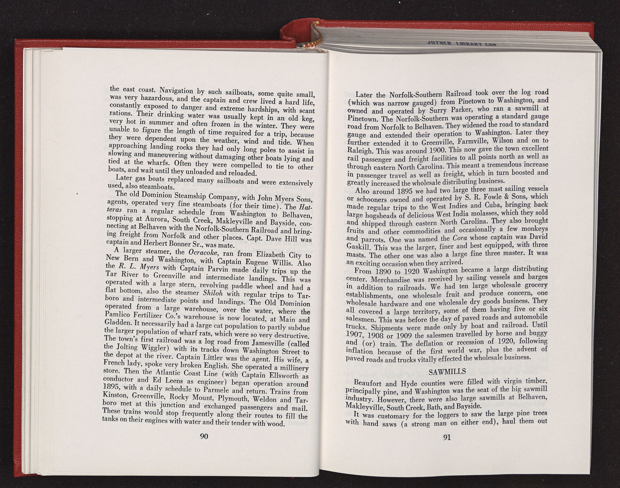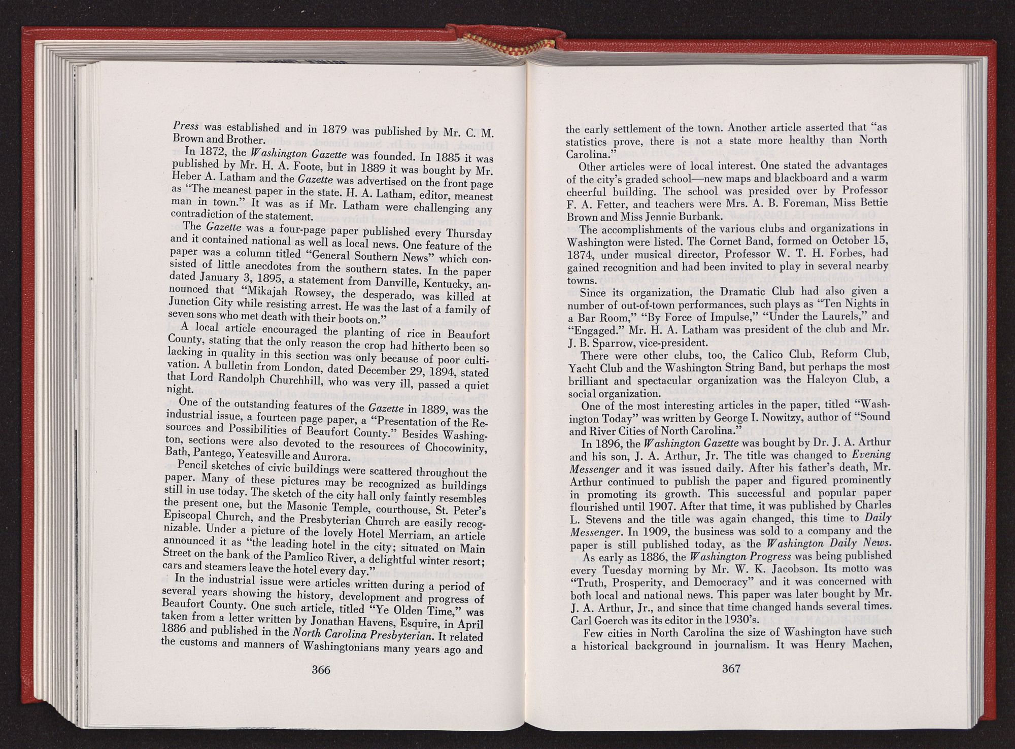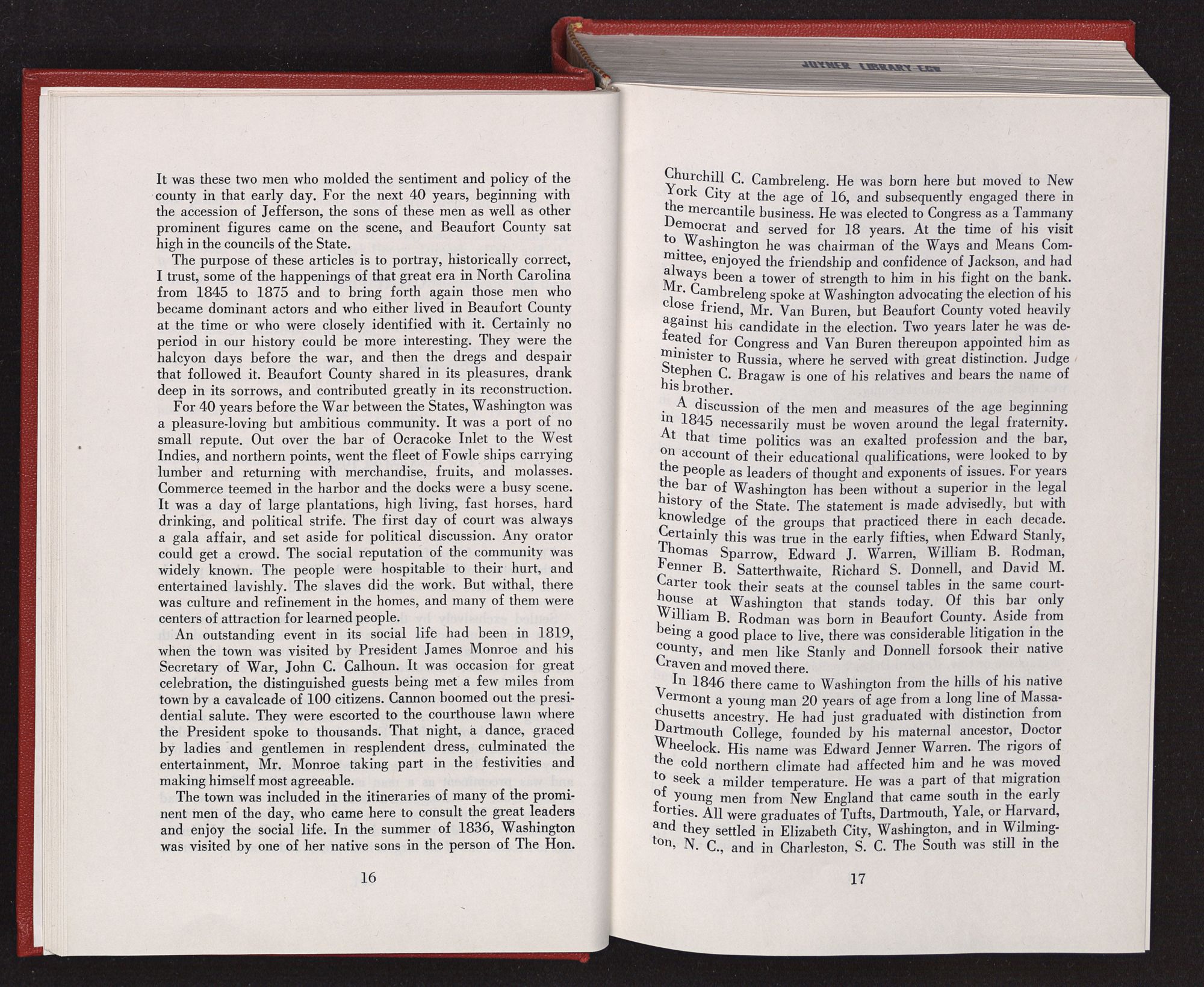 FOREWORDActing on instructions from the Washington-Beaufort County Bicentennial Commission with Roland Modlin, Chairman, the History Committee, under the Chairmanship of John Morgan, began in 1974 a history of the Washington area. The committee decided to use articles which spoke more graphically of their periods than those written today as the chronological base for the history, and to enlist the aid of a number of people in researching and writing in the areas in which they were interested. The result is a collection of articles, both old and new, which supplements the earlier work, Beaufort County: Two Centuries of its History by Colonel Wingate Reed, and brings to print much data heretofore not published. Hundreds of people have been interviewed. Records, letters, ledgers and scrapbooks have been brought from attics and used. Old newspapers have been collected and consulted. Much had to be omitted but the committee hopes that further volumes of Beaufort County history will follow. Quantities of material are now available and more is constantly accumulating, which has not been touched in this volume. This material is in the files at the George H. and Laura E. Brown Library where the data used for this book is stored.