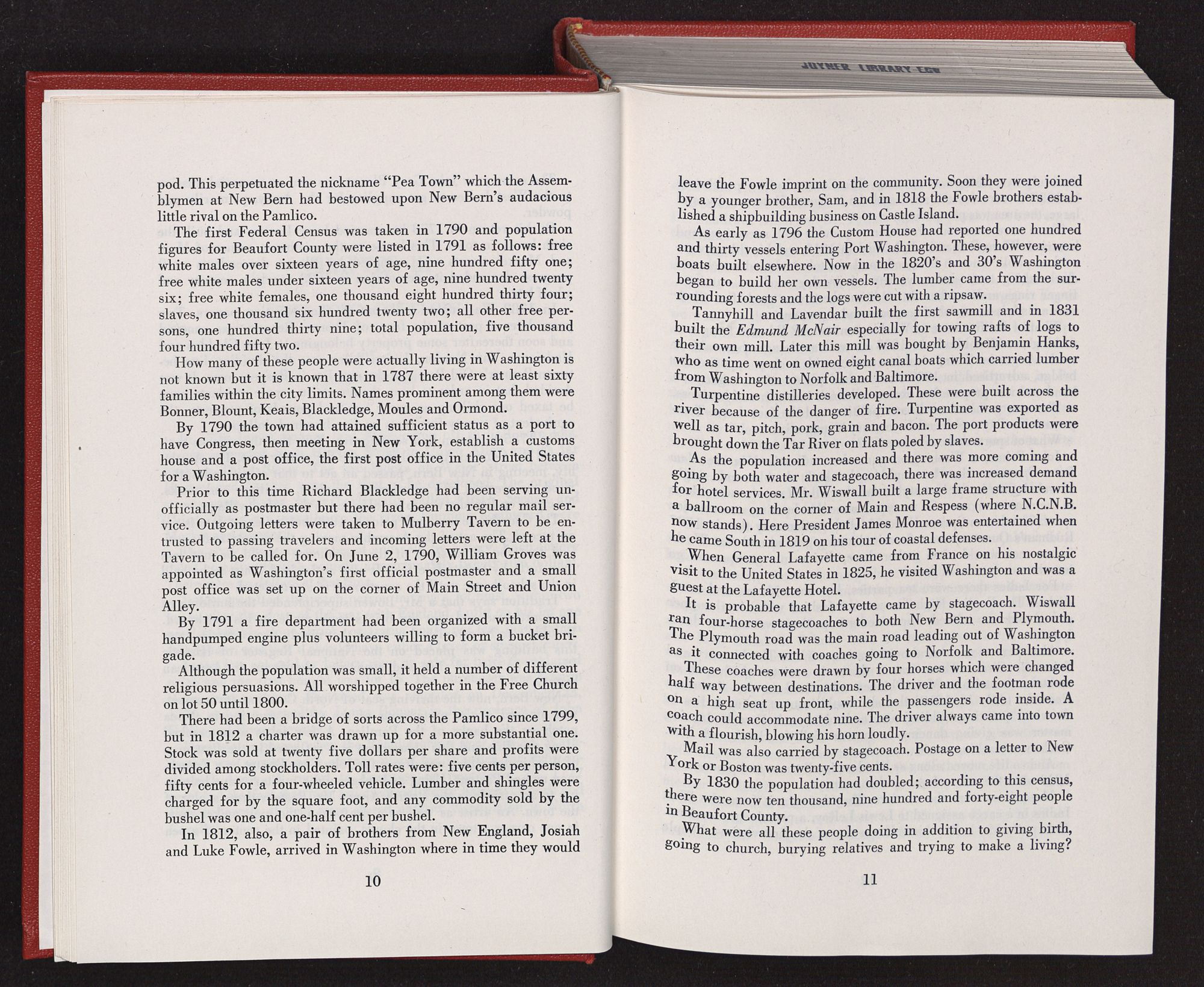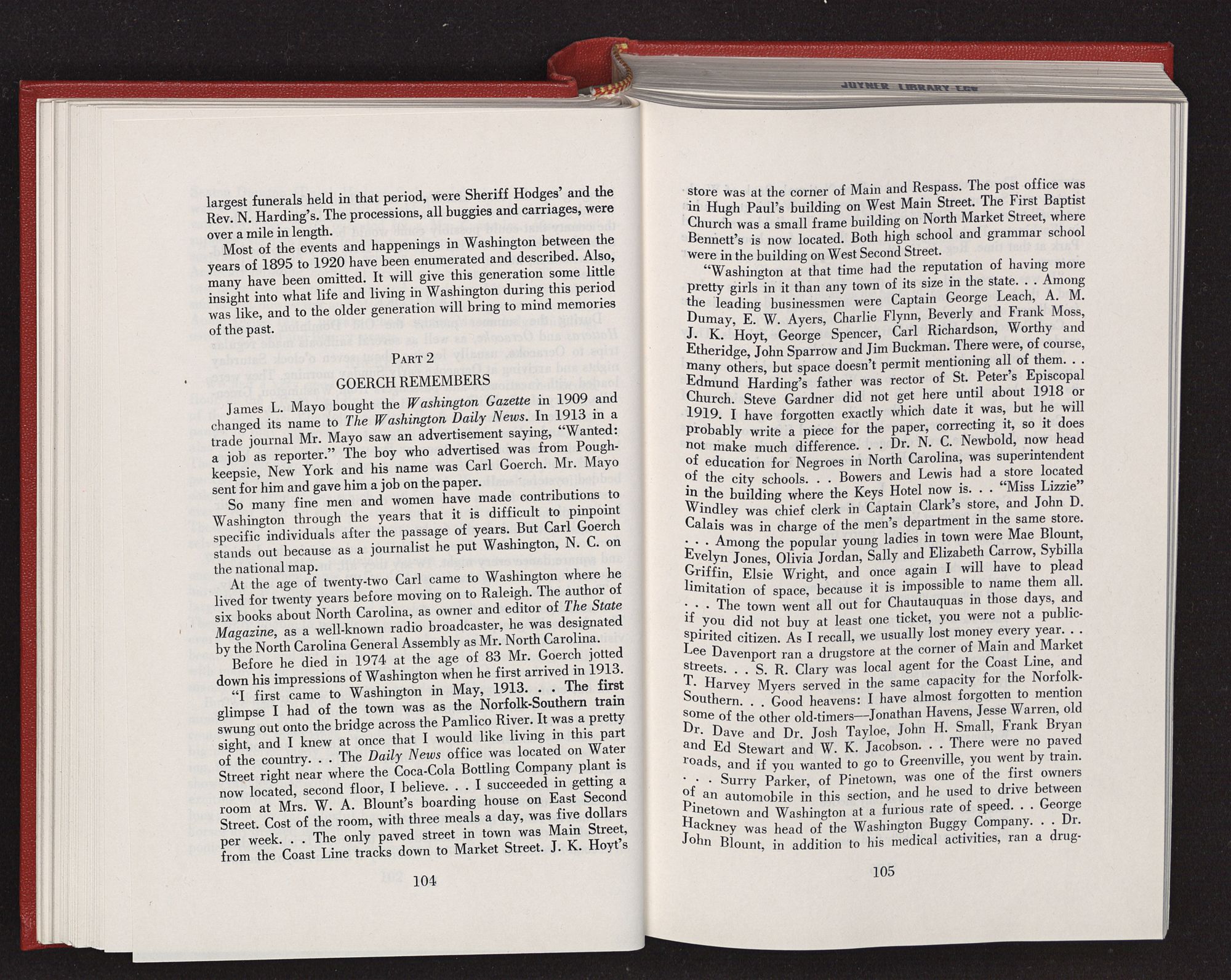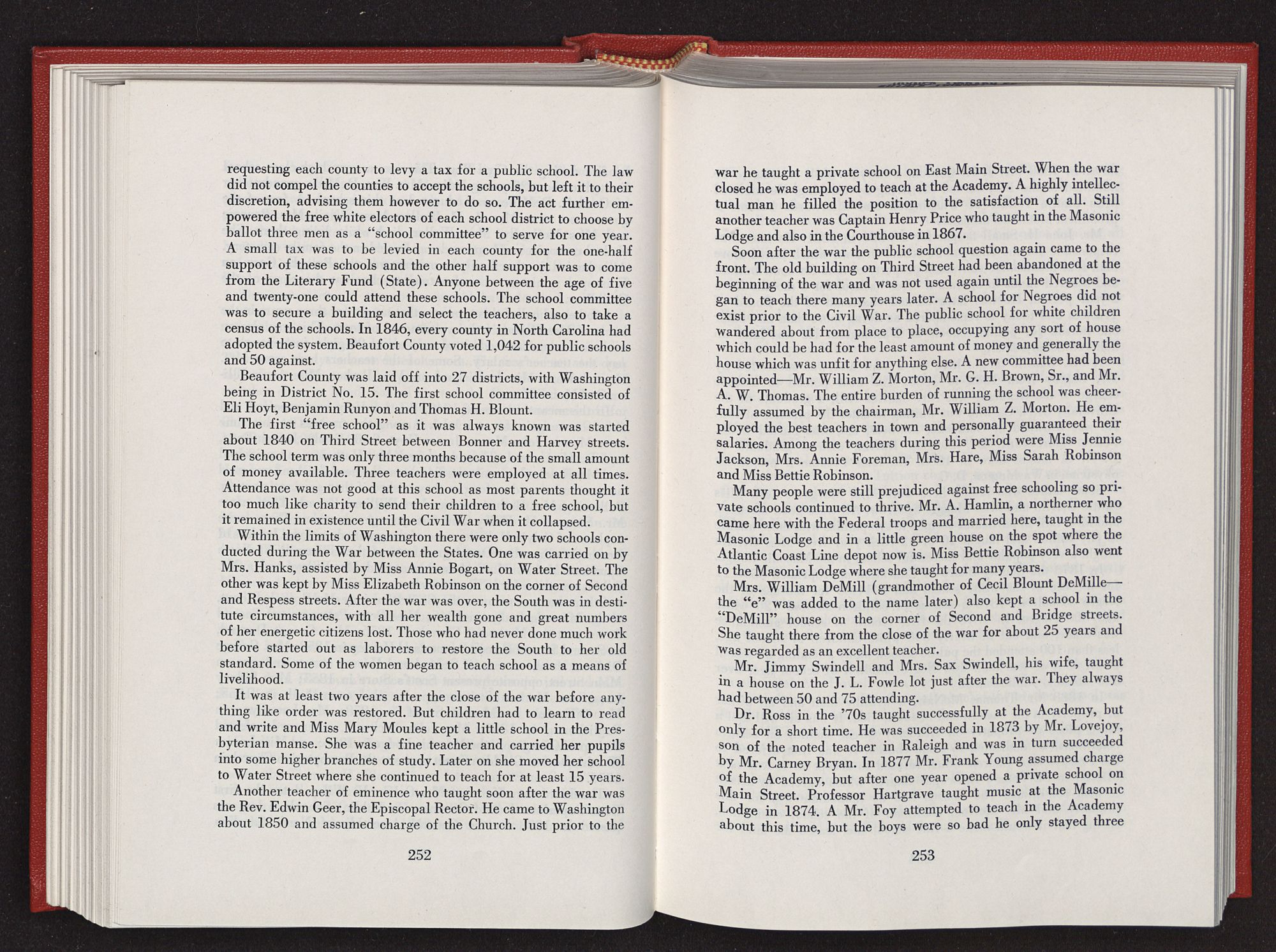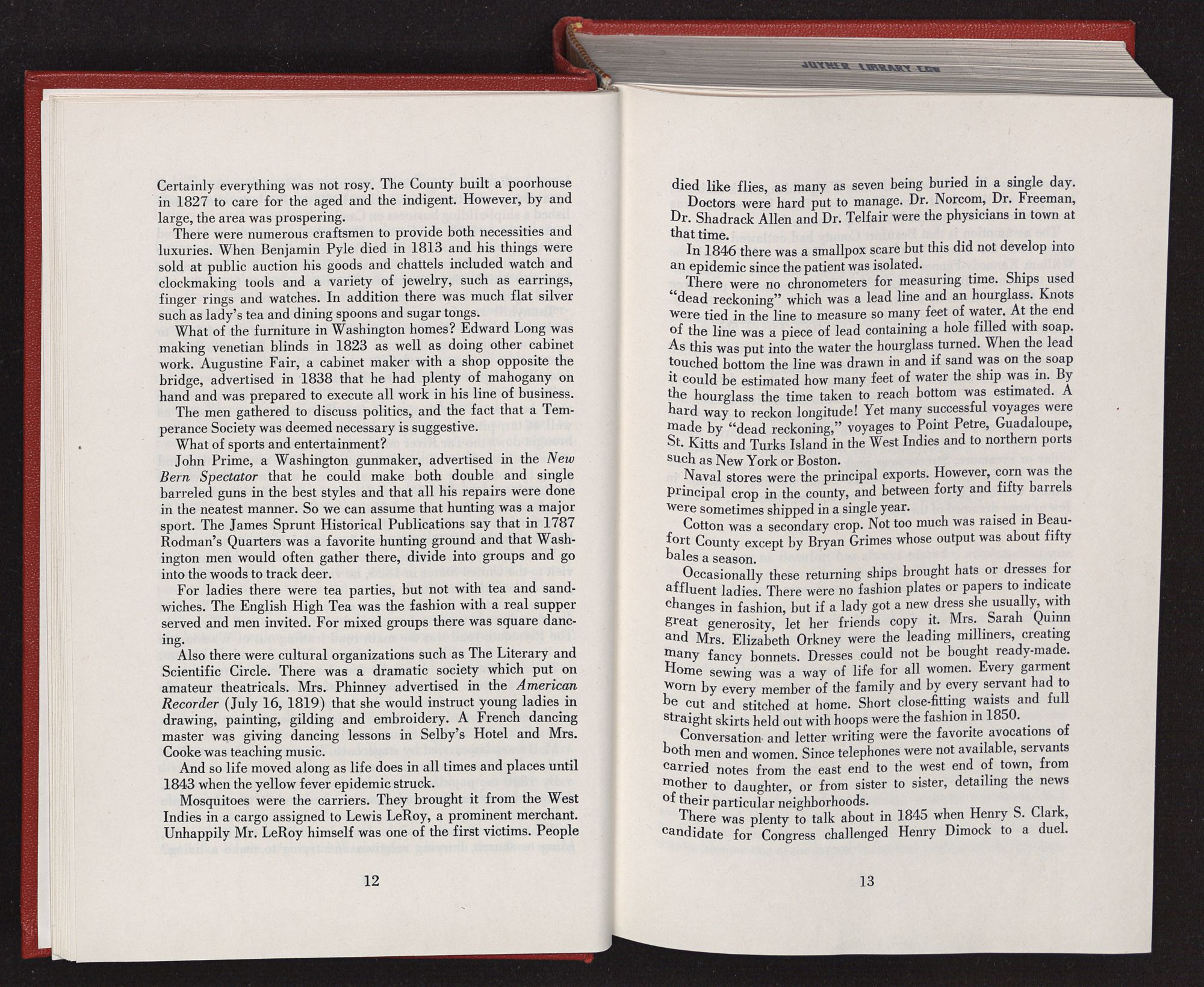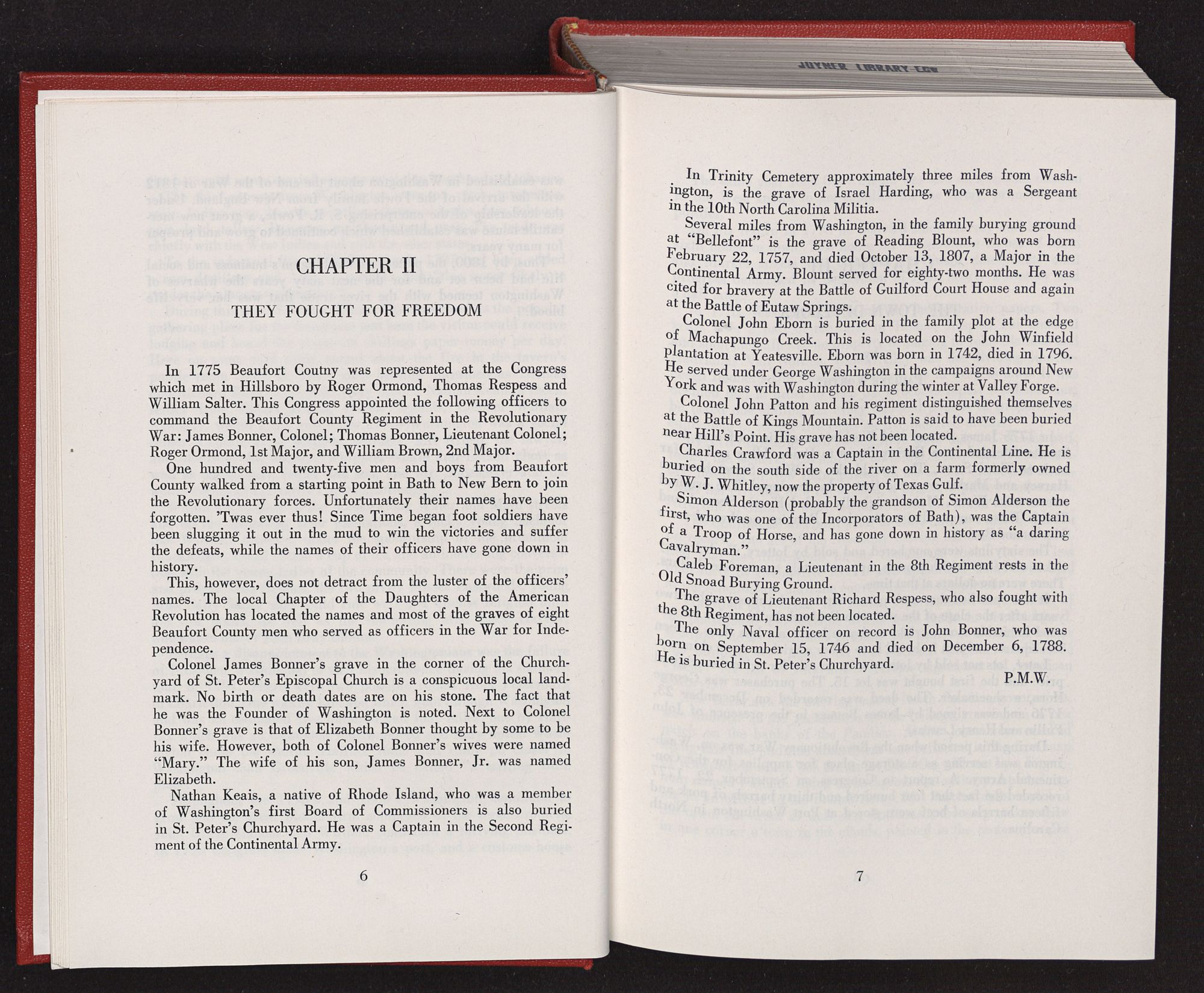 FOREWORDActing on instructions from the Washington-Beaufort County Bicentennial Commission with Roland Modlin, Chairman, the History Committee, under the Chairmanship of John Morgan, began in 1974 a history of the Washington area. The committee decided to use articles which spoke more graphically of their periods than those written today as the chronological base for the history, and to enlist the aid of a number of people in researching and writing in the areas in which they were interested. The result is a collection of articles, both old and new, which supplements the earlier work, Beaufort County: Two Centuries of its History by Colonel Wingate Reed, and brings to print much data heretofore not published. Hundreds of people have been interviewed. Records, letters, ledgers and scrapbooks have been brought from attics and used. Old newspapers have been collected and consulted. Much had to be omitted but the committee hopes that further volumes of Beaufort County history will follow. Quantities of material are now available and more is constantly accumulating, which has not been touched in this volume. This material is in the files at the George H. and Laura E. Brown Library where the data used for this book is stored.