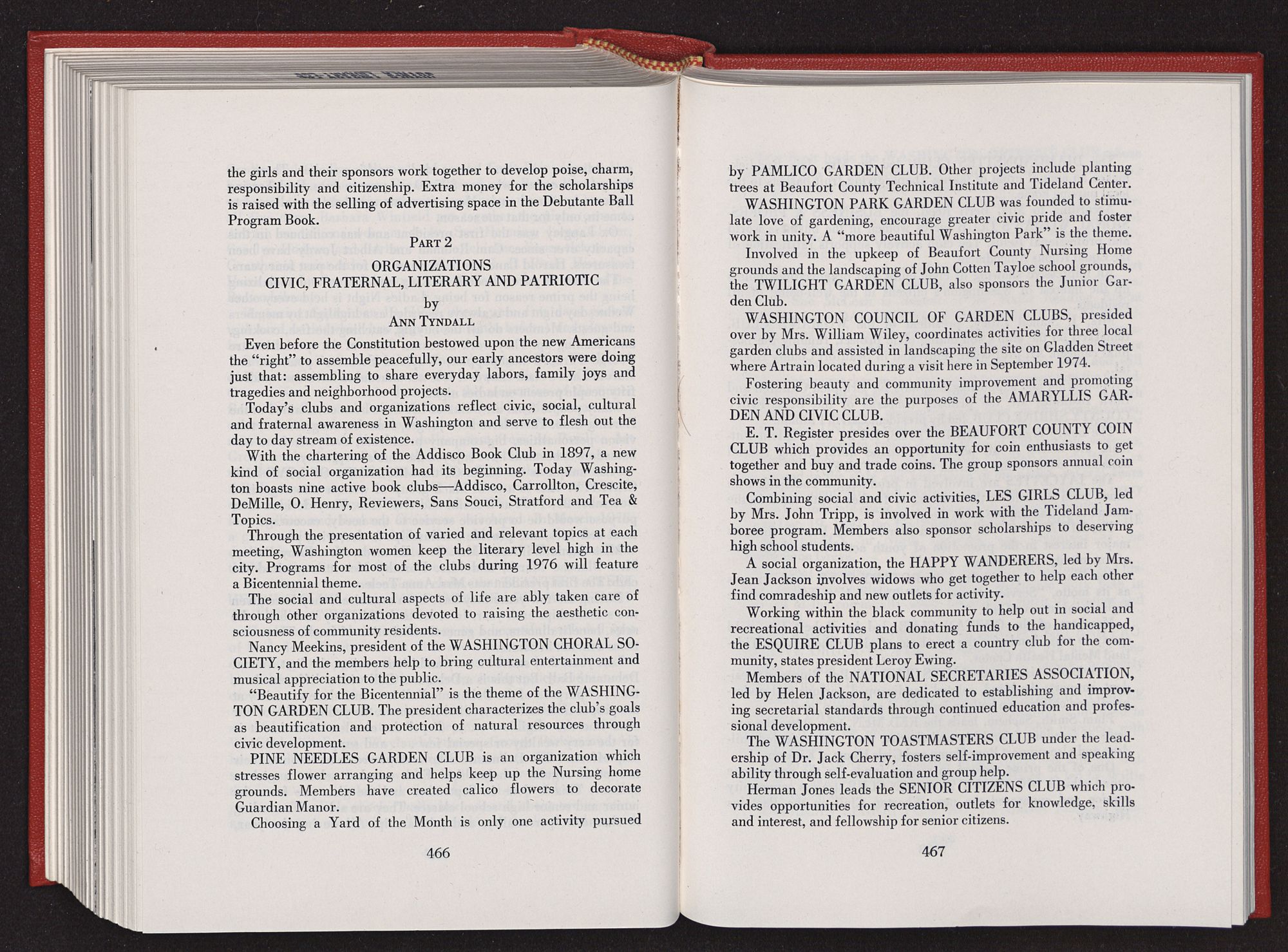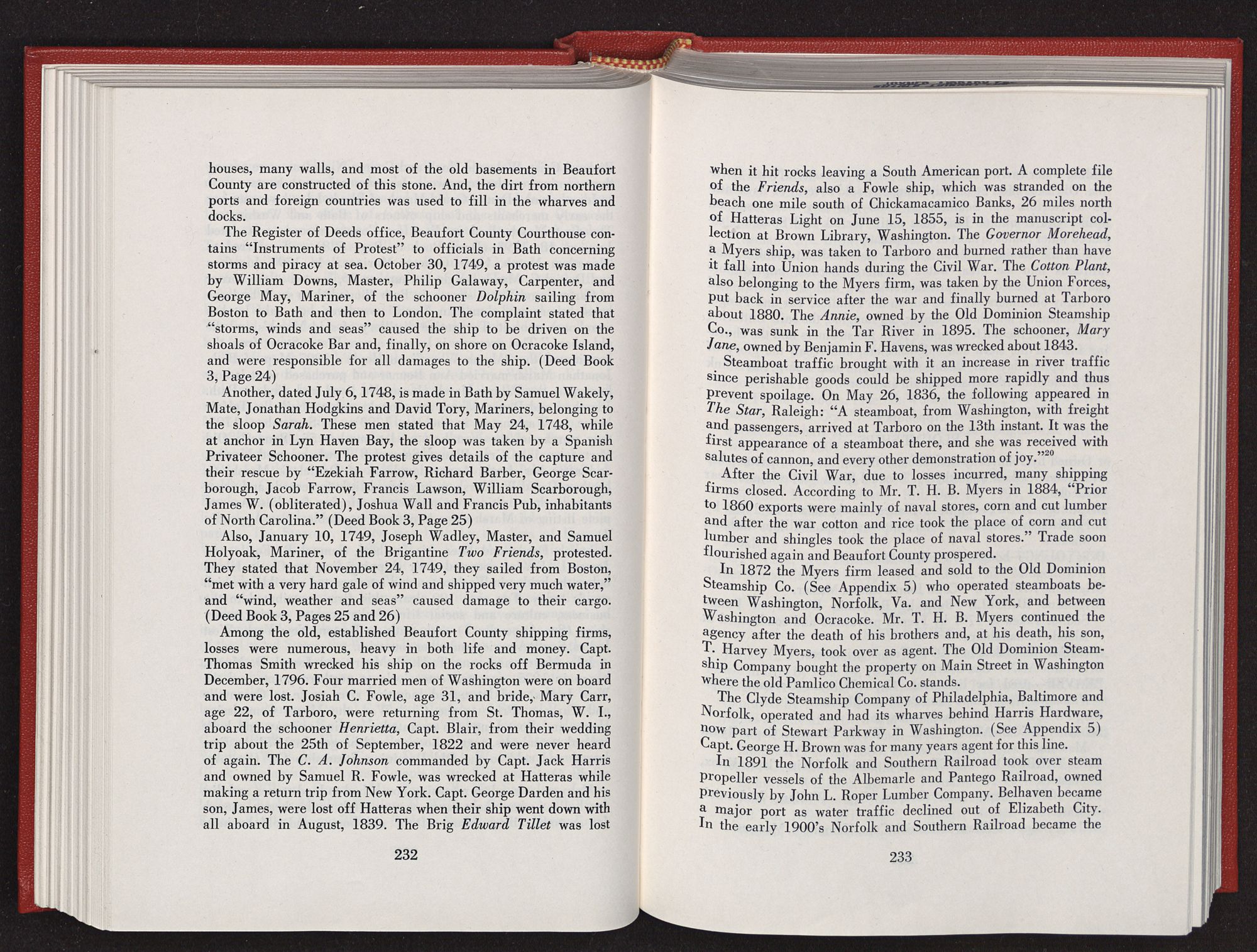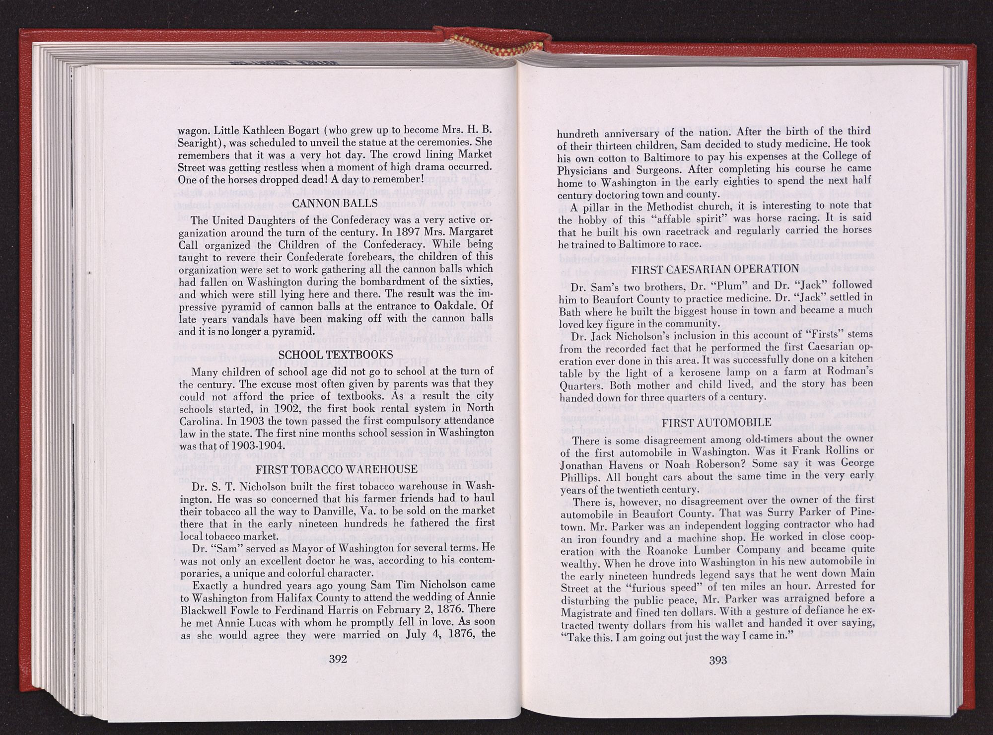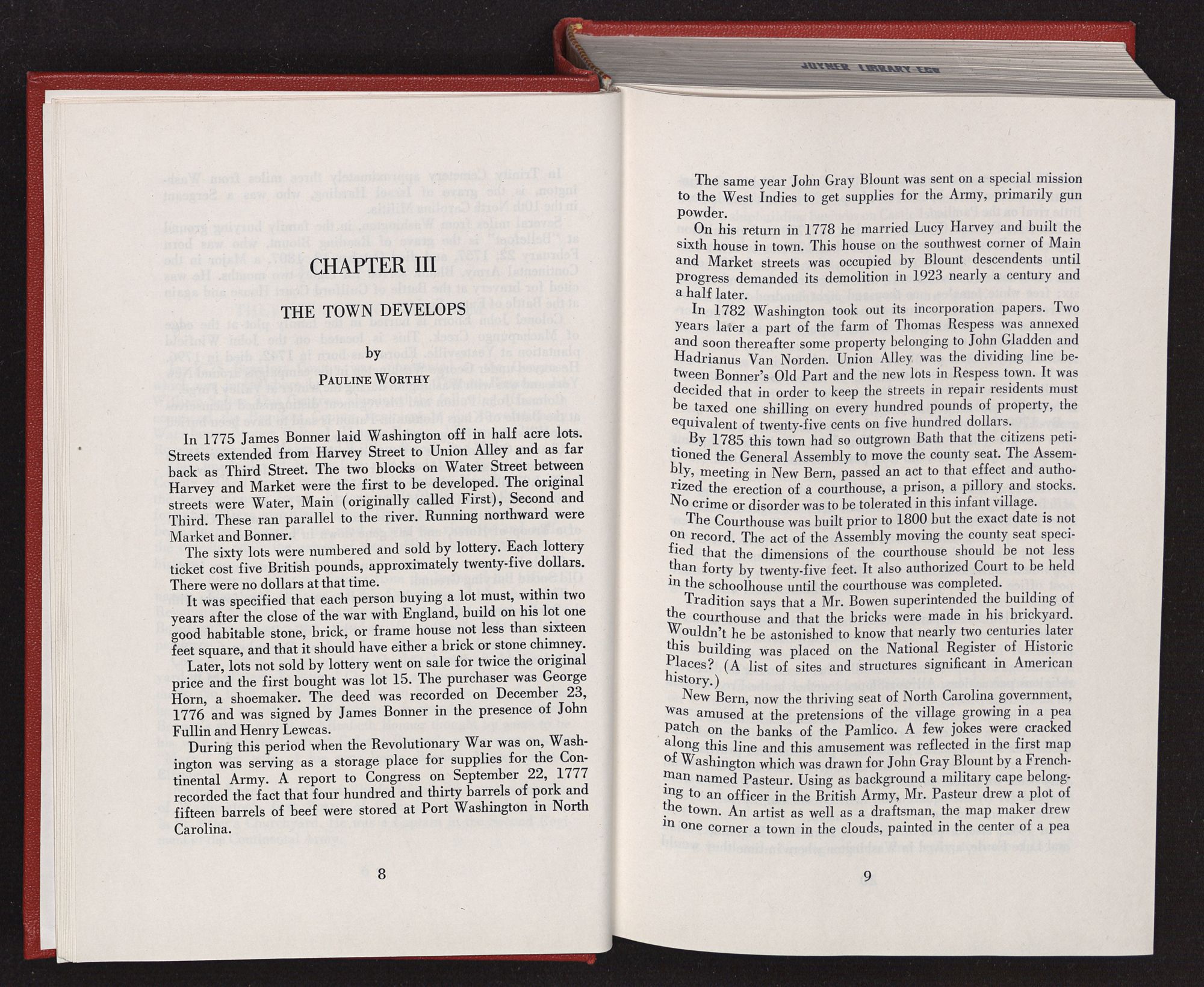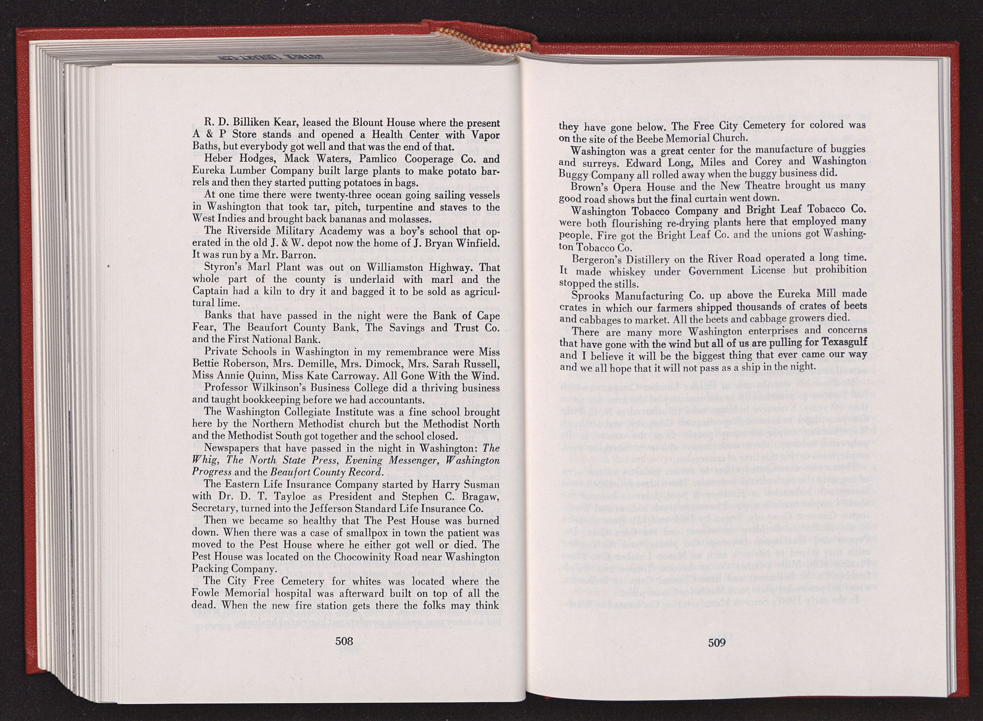 FOREWORDActing on instructions from the Washington-Beaufort County Bicentennial Commission with Roland Modlin, Chairman, the History Committee, under the Chairmanship of John Morgan, began in 1974 a history of the Washington area. The committee decided to use articles which spoke more graphically of their periods than those written today as the chronological base for the history, and to enlist the aid of a number of people in researching and writing in the areas in which they were interested. The result is a collection of articles, both old and new, which supplements the earlier work, Beaufort County: Two Centuries of its History by Colonel Wingate Reed, and brings to print much data heretofore not published. Hundreds of people have been interviewed. Records, letters, ledgers and scrapbooks have been brought from attics and used. Old newspapers have been collected and consulted. Much had to be omitted but the committee hopes that further volumes of Beaufort County history will follow. Quantities of material are now available and more is constantly accumulating, which has not been touched in this volume. This material is in the files at the George H. and Laura E. Brown Library where the data used for this book is stored.