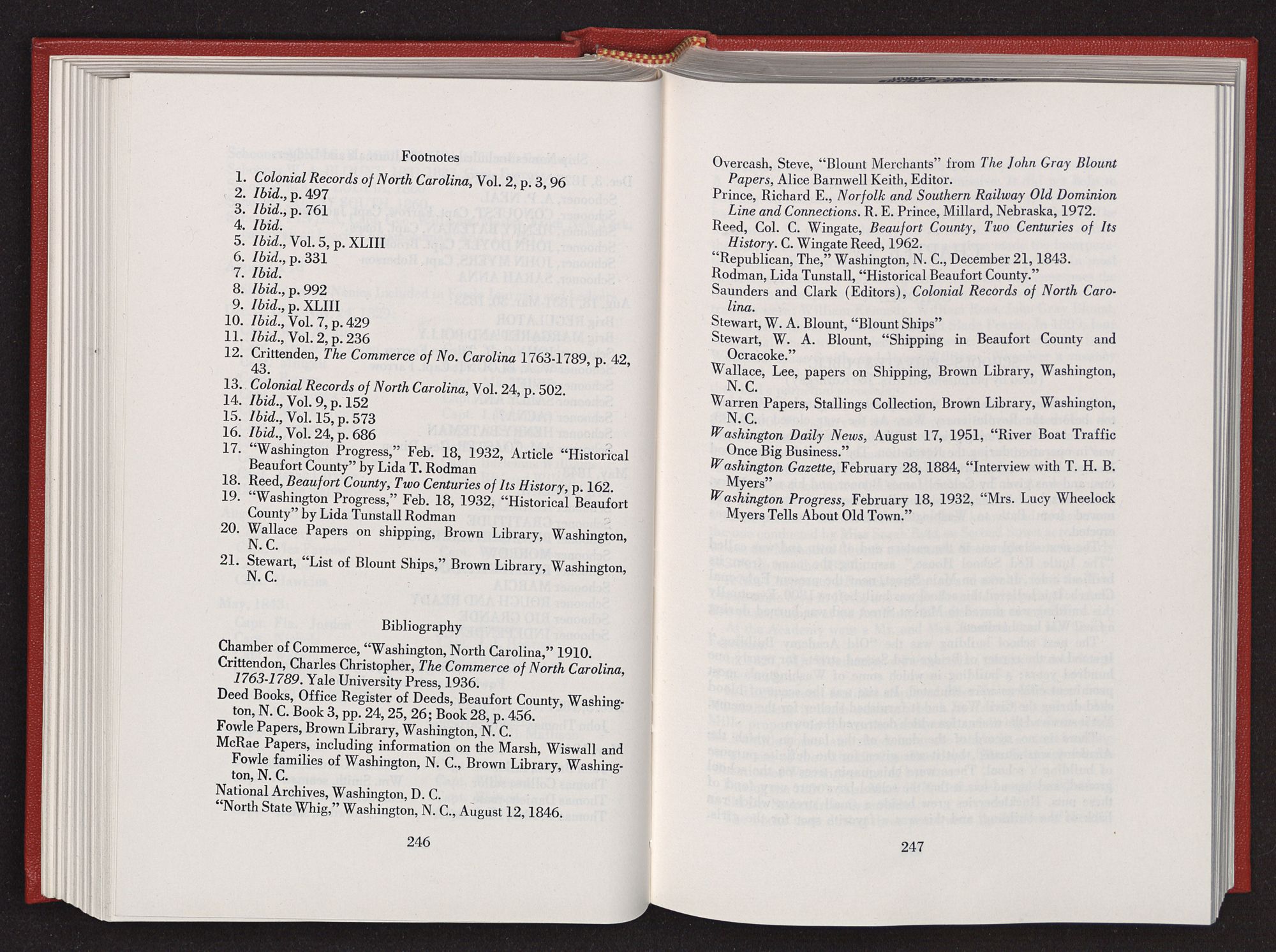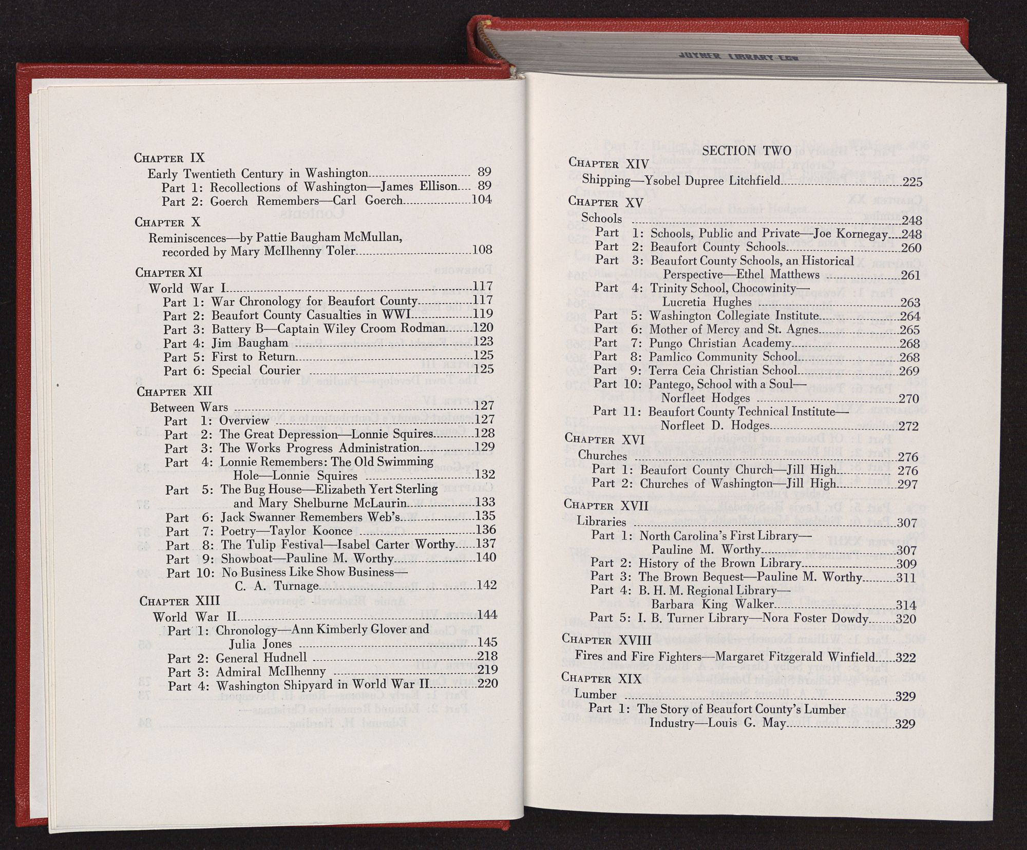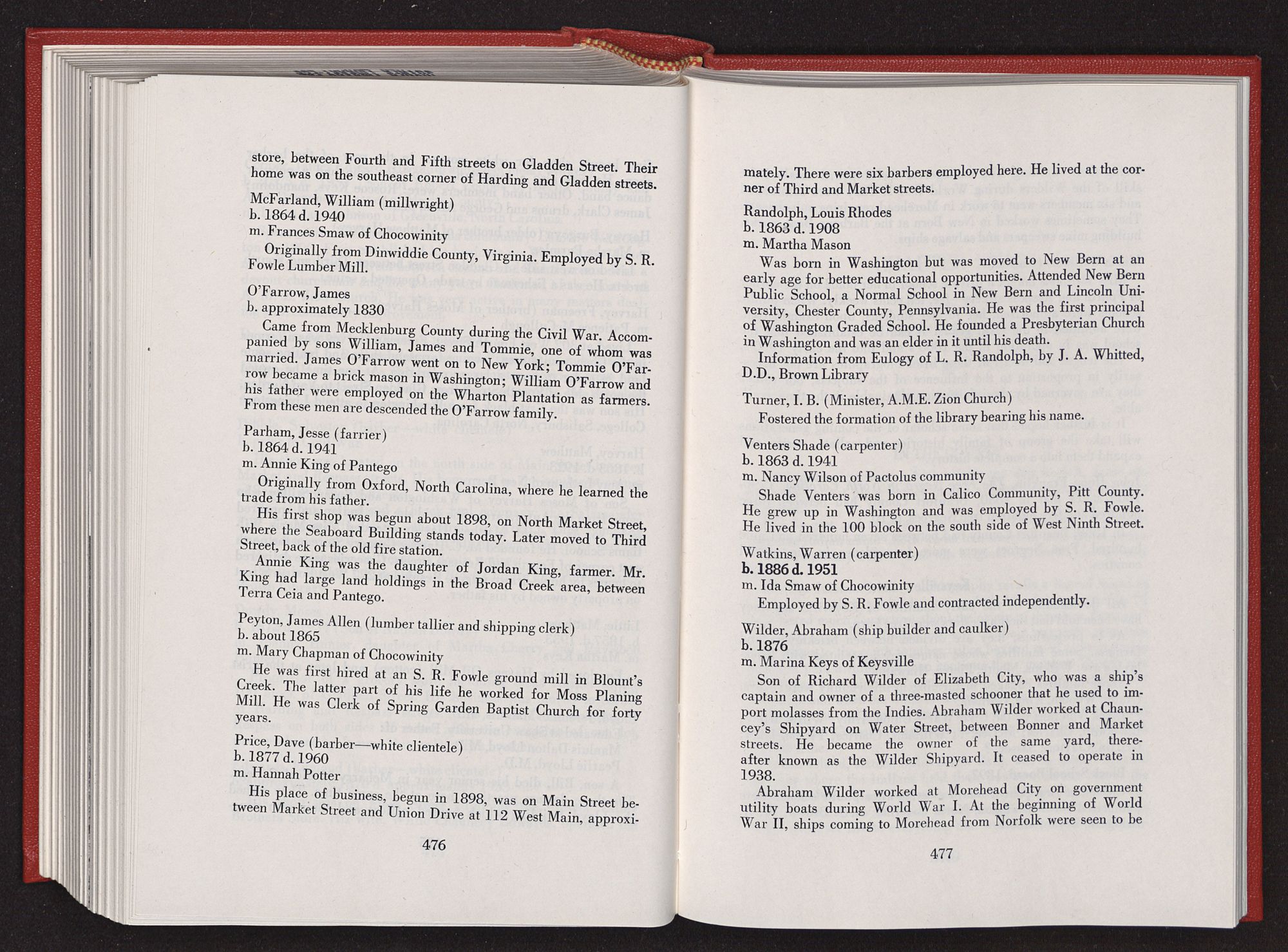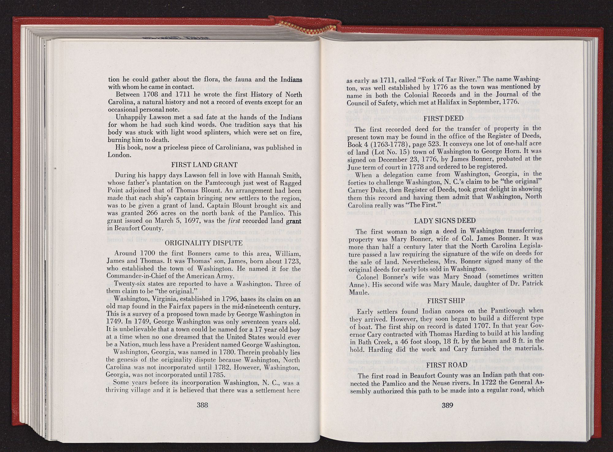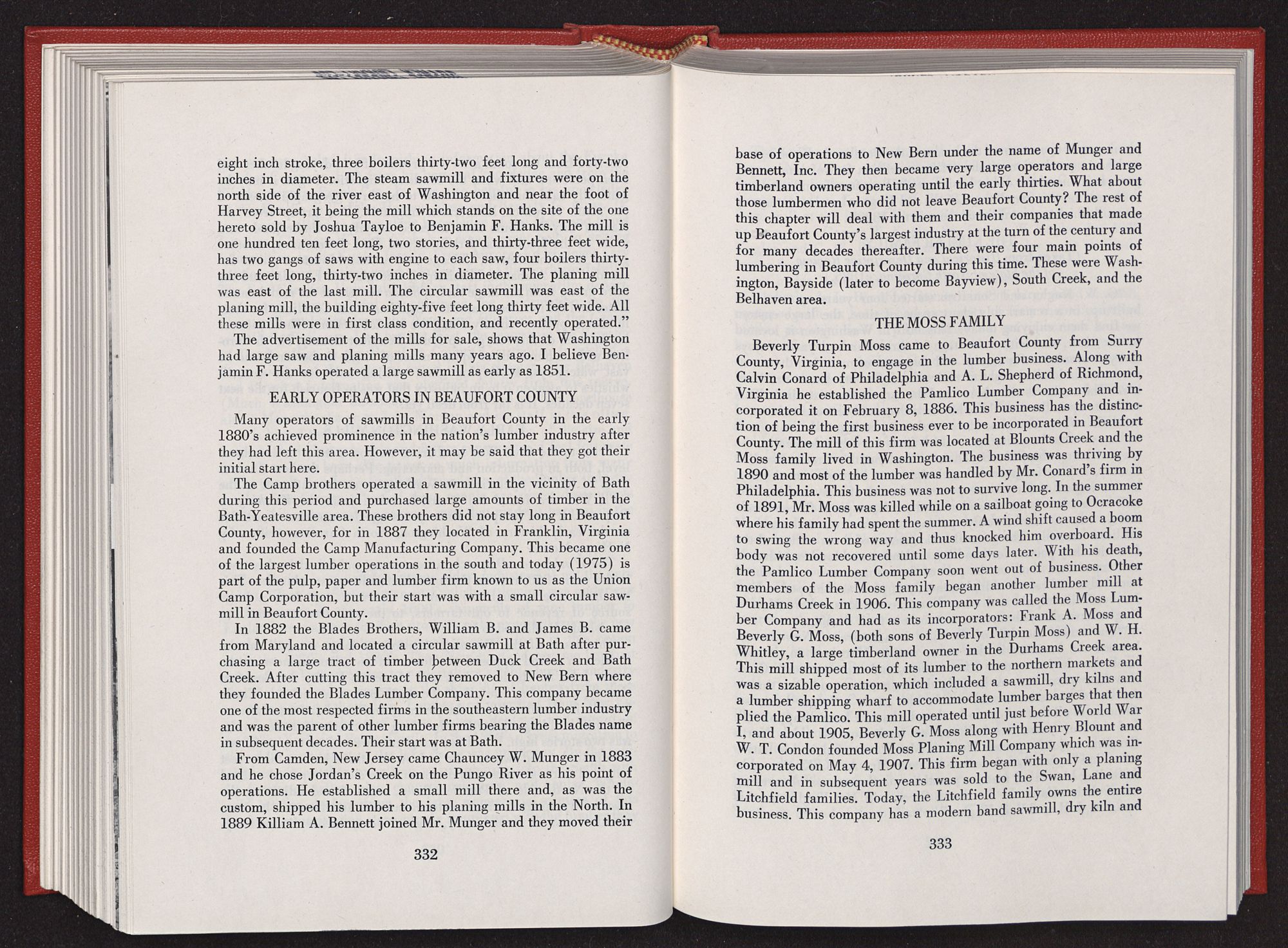 FOREWORDActing on instructions from the Washington-Beaufort County Bicentennial Commission with Roland Modlin, Chairman, the History Committee, under the Chairmanship of John Morgan, began in 1974 a history of the Washington area. The committee decided to use articles which spoke more graphically of their periods than those written today as the chronological base for the history, and to enlist the aid of a number of people in researching and writing in the areas in which they were interested. The result is a collection of articles, both old and new, which supplements the earlier work, Beaufort County: Two Centuries of its History by Colonel Wingate Reed, and brings to print much data heretofore not published. Hundreds of people have been interviewed. Records, letters, ledgers and scrapbooks have been brought from attics and used. Old newspapers have been collected and consulted. Much had to be omitted but the committee hopes that further volumes of Beaufort County history will follow. Quantities of material are now available and more is constantly accumulating, which has not been touched in this volume. This material is in the files at the George H. and Laura E. Brown Library where the data used for this book is stored.