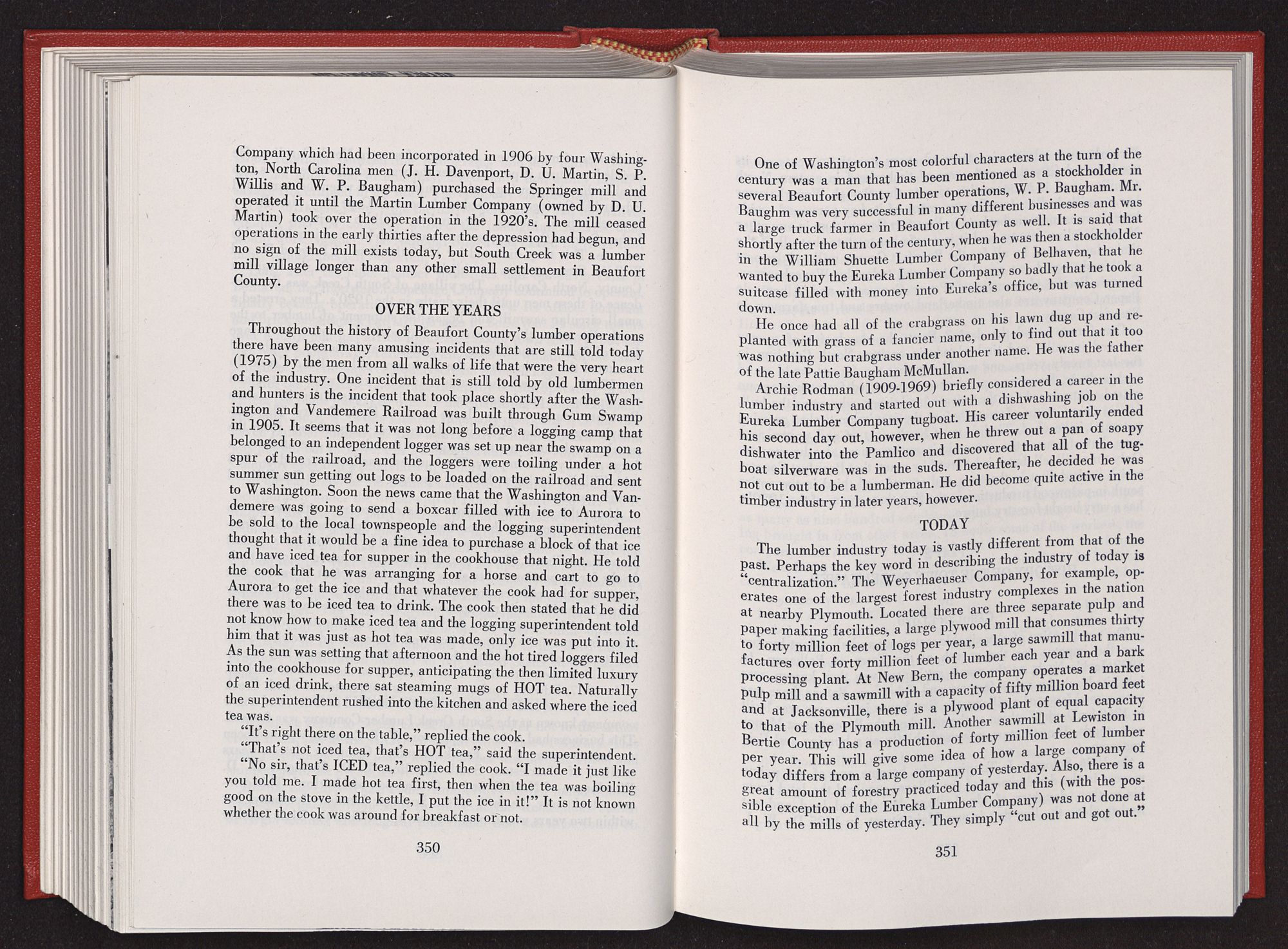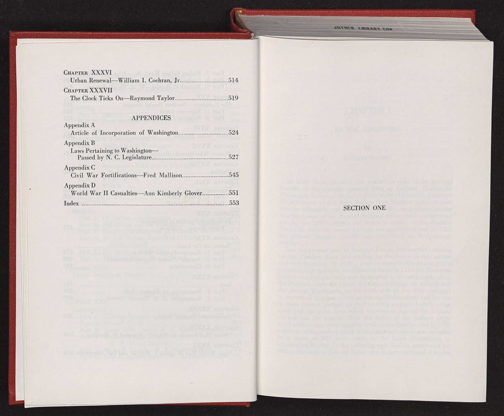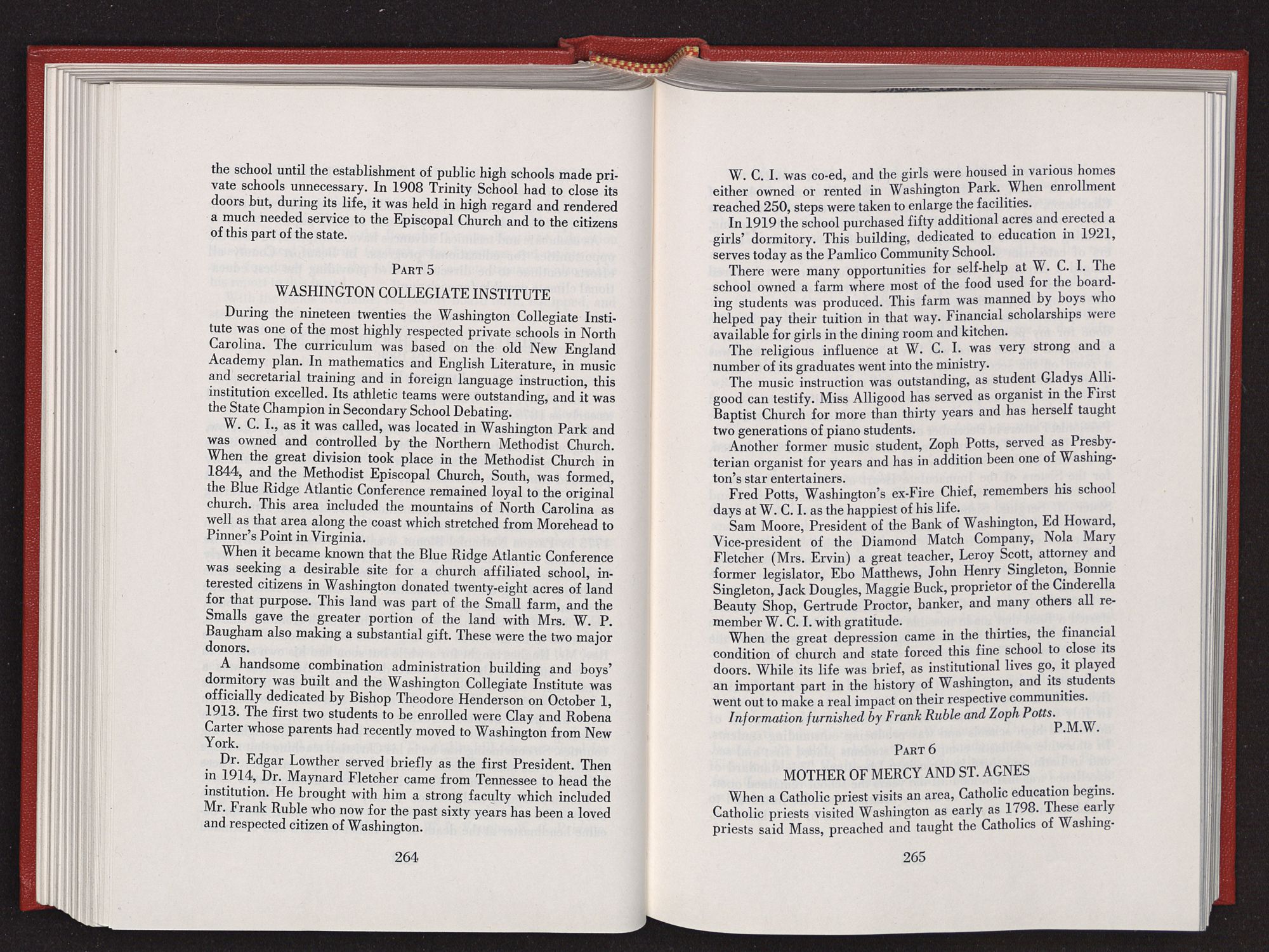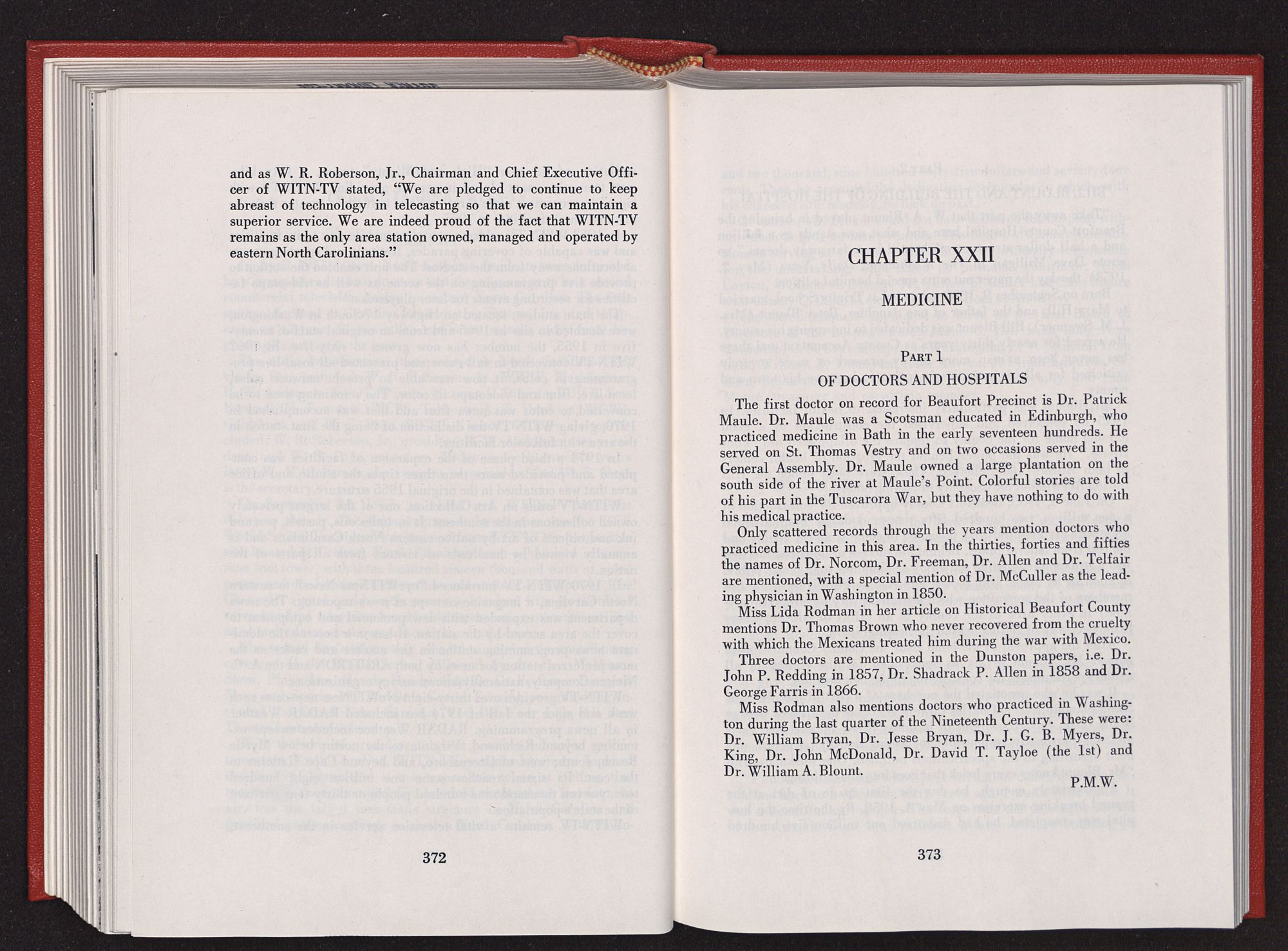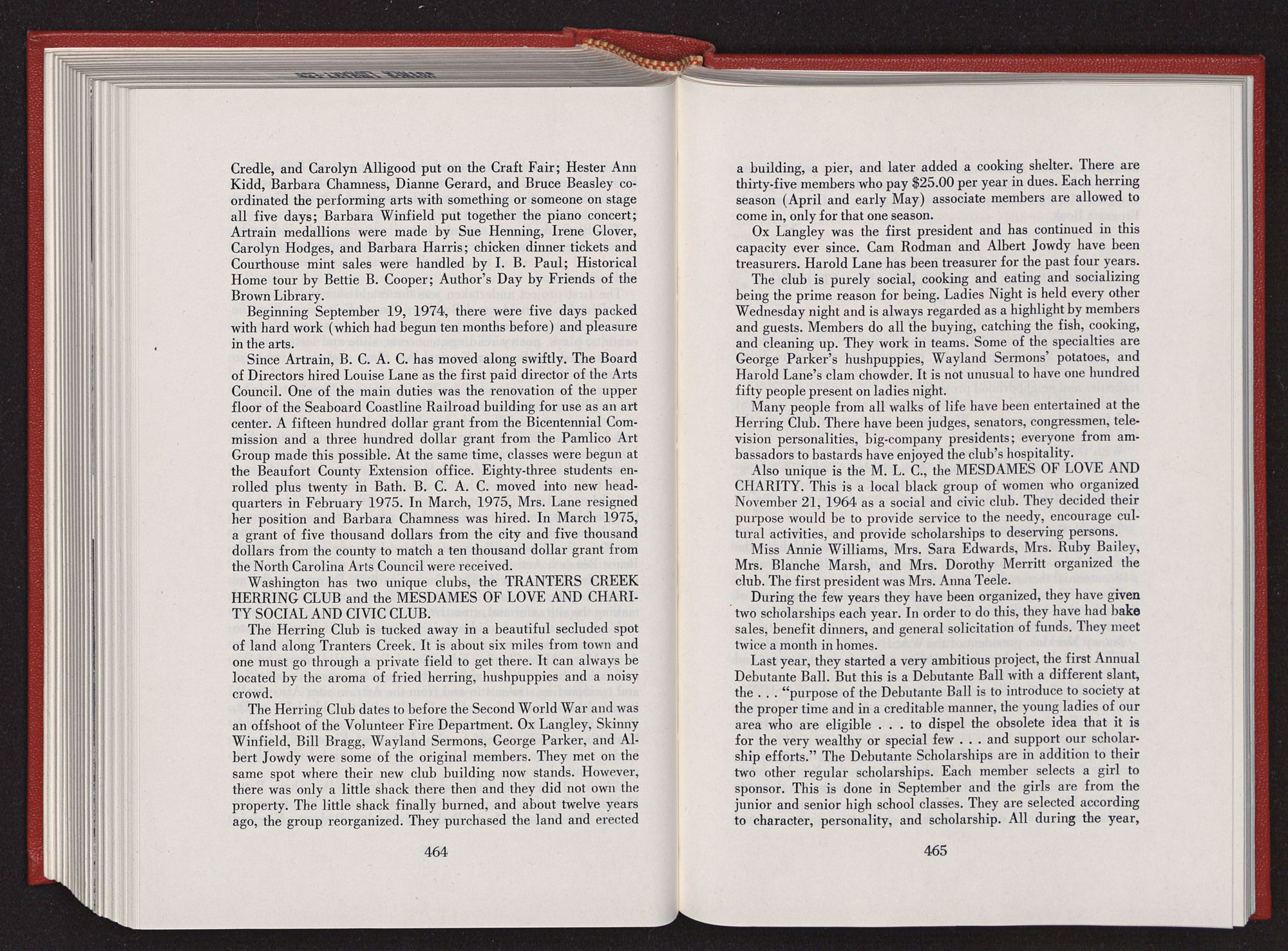 FOREWORDActing on instructions from the Washington-Beaufort County Bicentennial Commission with Roland Modlin, Chairman, the History Committee, under the Chairmanship of John Morgan, began in 1974 a history of the Washington area. The committee decided to use articles which spoke more graphically of their periods than those written today as the chronological base for the history, and to enlist the aid of a number of people in researching and writing in the areas in which they were interested. The result is a collection of articles, both old and new, which supplements the earlier work, Beaufort County: Two Centuries of its History by Colonel Wingate Reed, and brings to print much data heretofore not published. Hundreds of people have been interviewed. Records, letters, ledgers and scrapbooks have been brought from attics and used. Old newspapers have been collected and consulted. Much had to be omitted but the committee hopes that further volumes of Beaufort County history will follow. Quantities of material are now available and more is constantly accumulating, which has not been touched in this volume. This material is in the files at the George H. and Laura E. Brown Library where the data used for this book is stored.