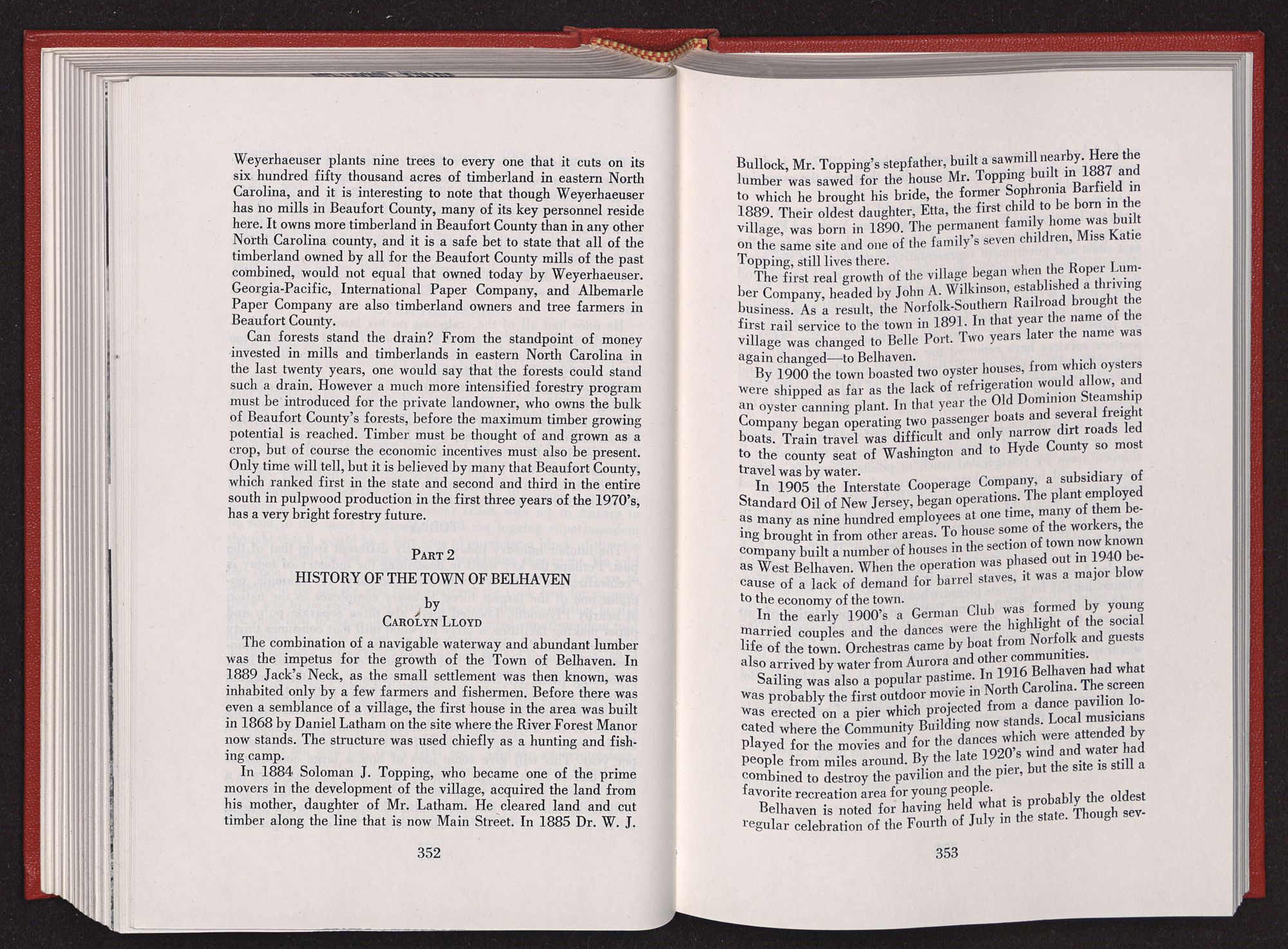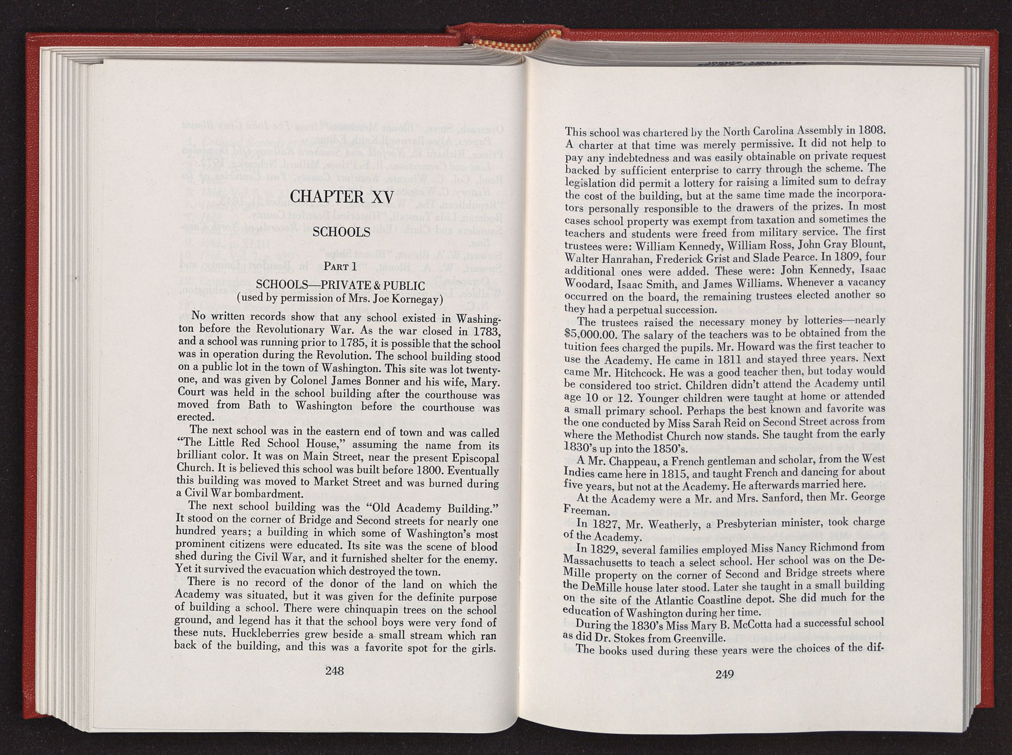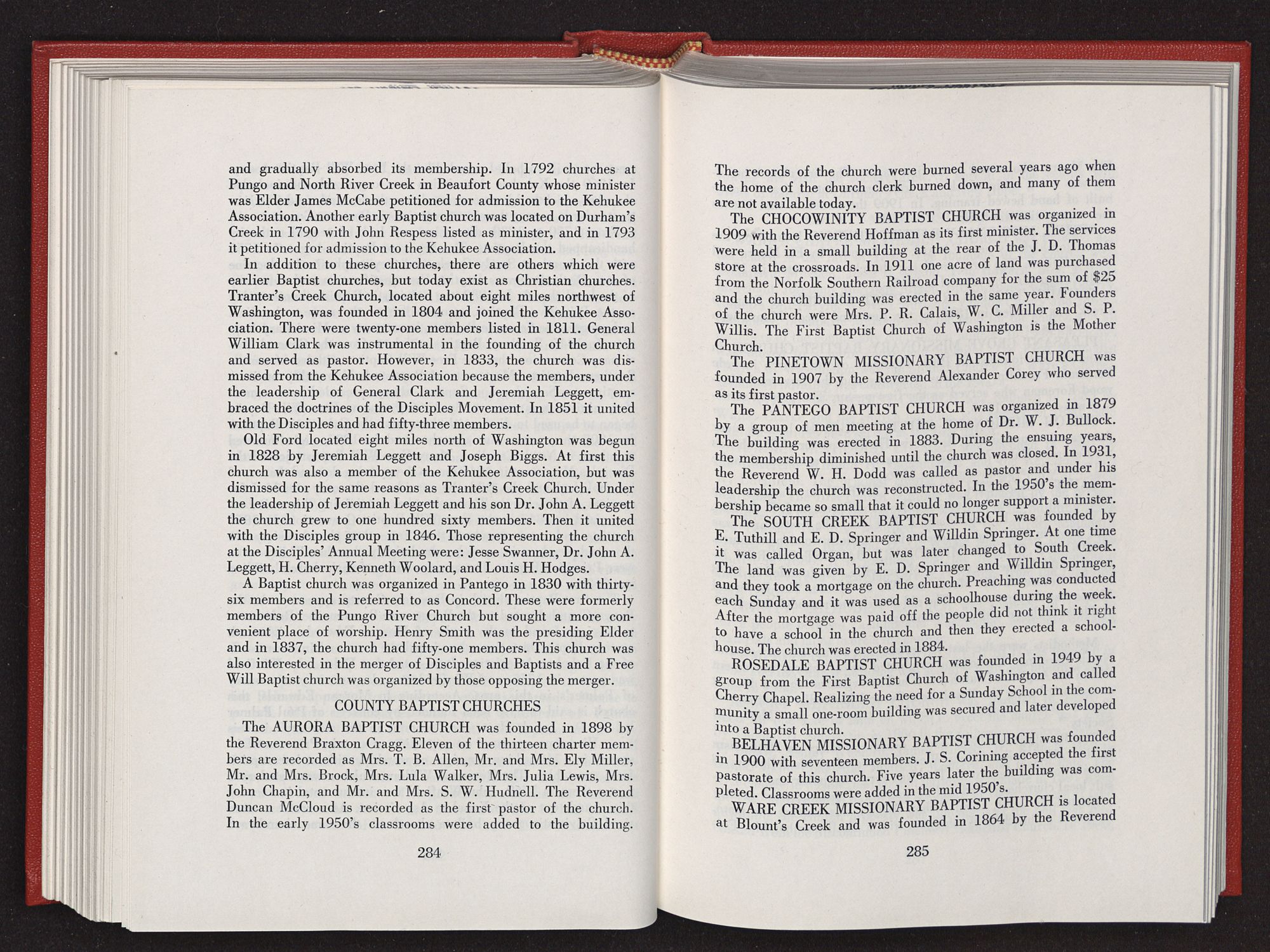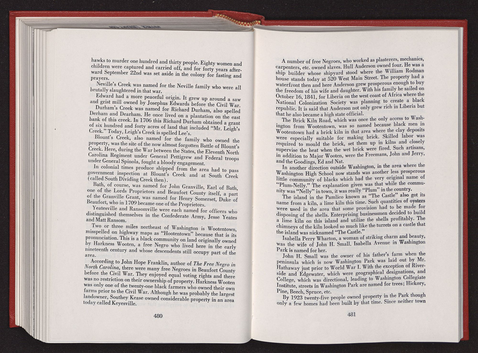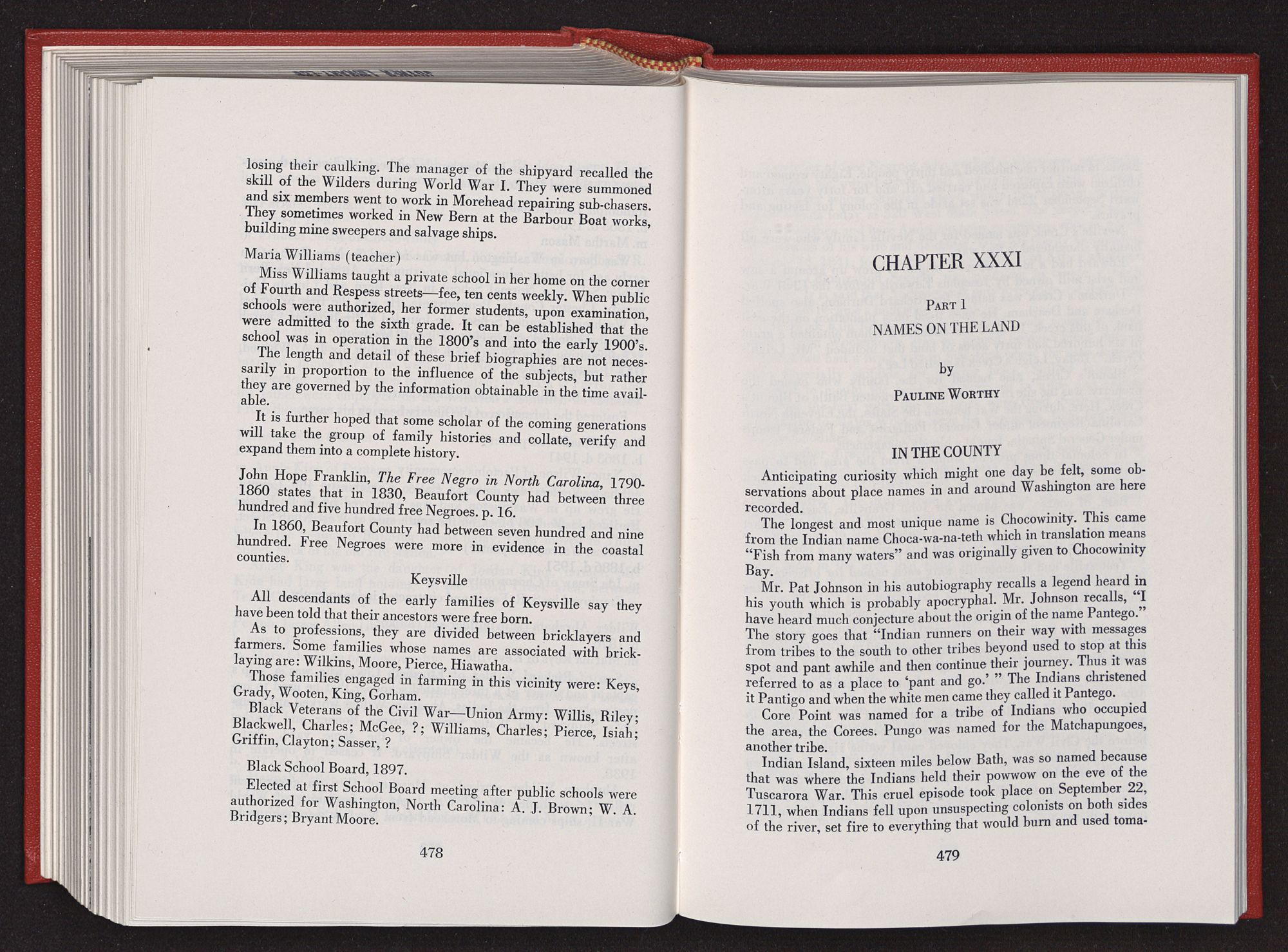 FOREWORDActing on instructions from the Washington-Beaufort County Bicentennial Commission with Roland Modlin, Chairman, the History Committee, under the Chairmanship of John Morgan, began in 1974 a history of the Washington area. The committee decided to use articles which spoke more graphically of their periods than those written today as the chronological base for the history, and to enlist the aid of a number of people in researching and writing in the areas in which they were interested. The result is a collection of articles, both old and new, which supplements the earlier work, Beaufort County: Two Centuries of its History by Colonel Wingate Reed, and brings to print much data heretofore not published. Hundreds of people have been interviewed. Records, letters, ledgers and scrapbooks have been brought from attics and used. Old newspapers have been collected and consulted. Much had to be omitted but the committee hopes that further volumes of Beaufort County history will follow. Quantities of material are now available and more is constantly accumulating, which has not been touched in this volume. This material is in the files at the George H. and Laura E. Brown Library where the data used for this book is stored.