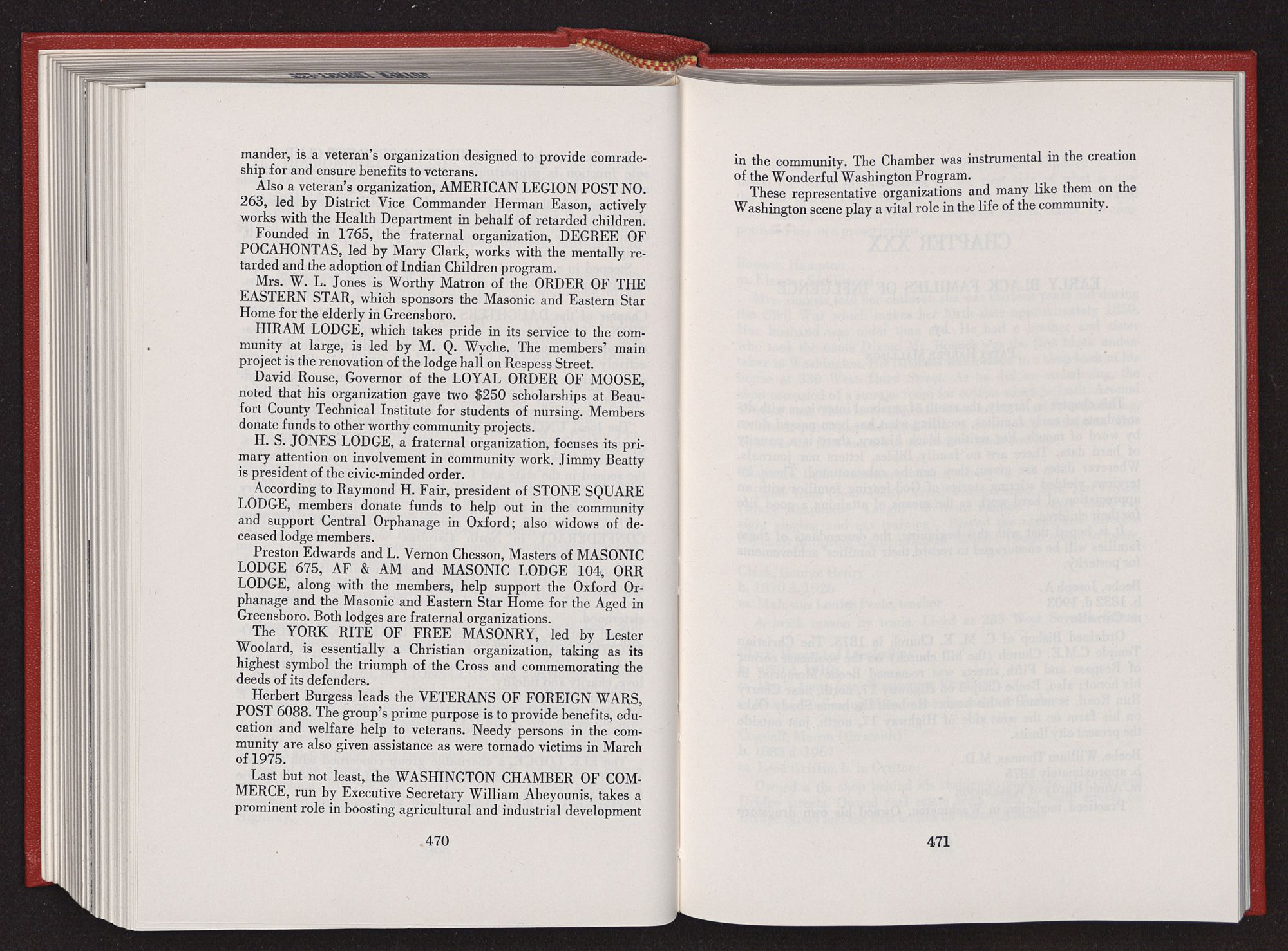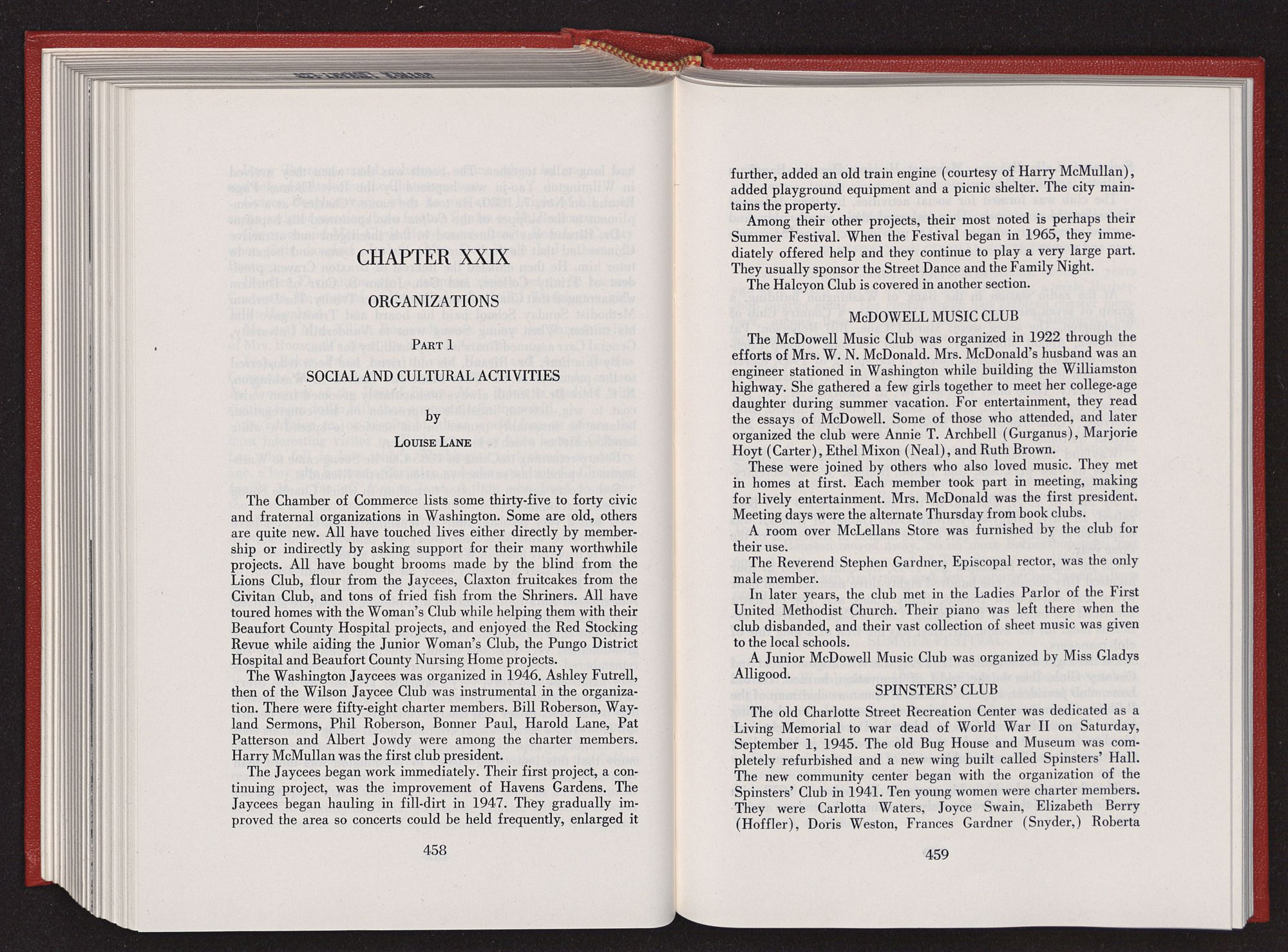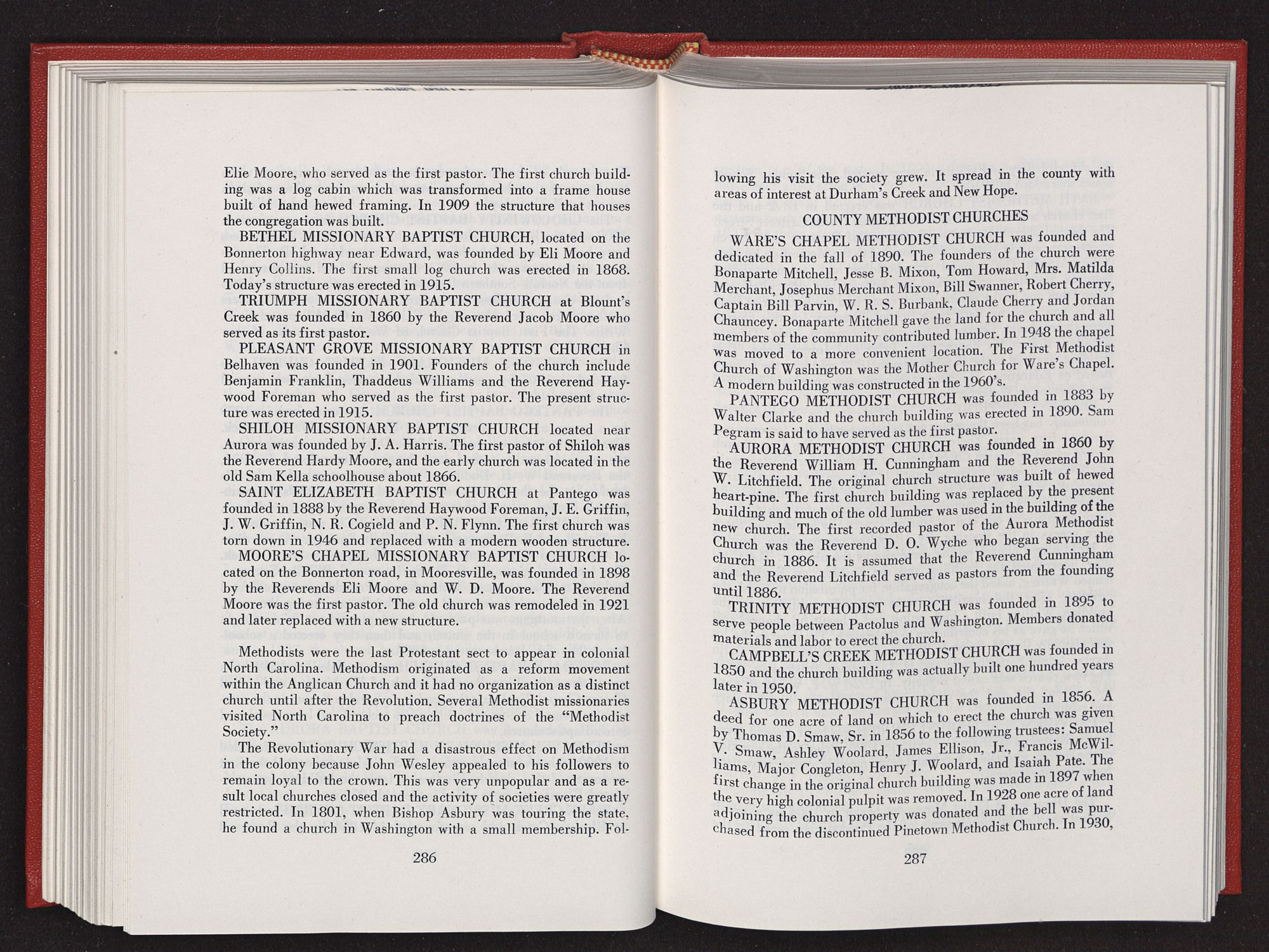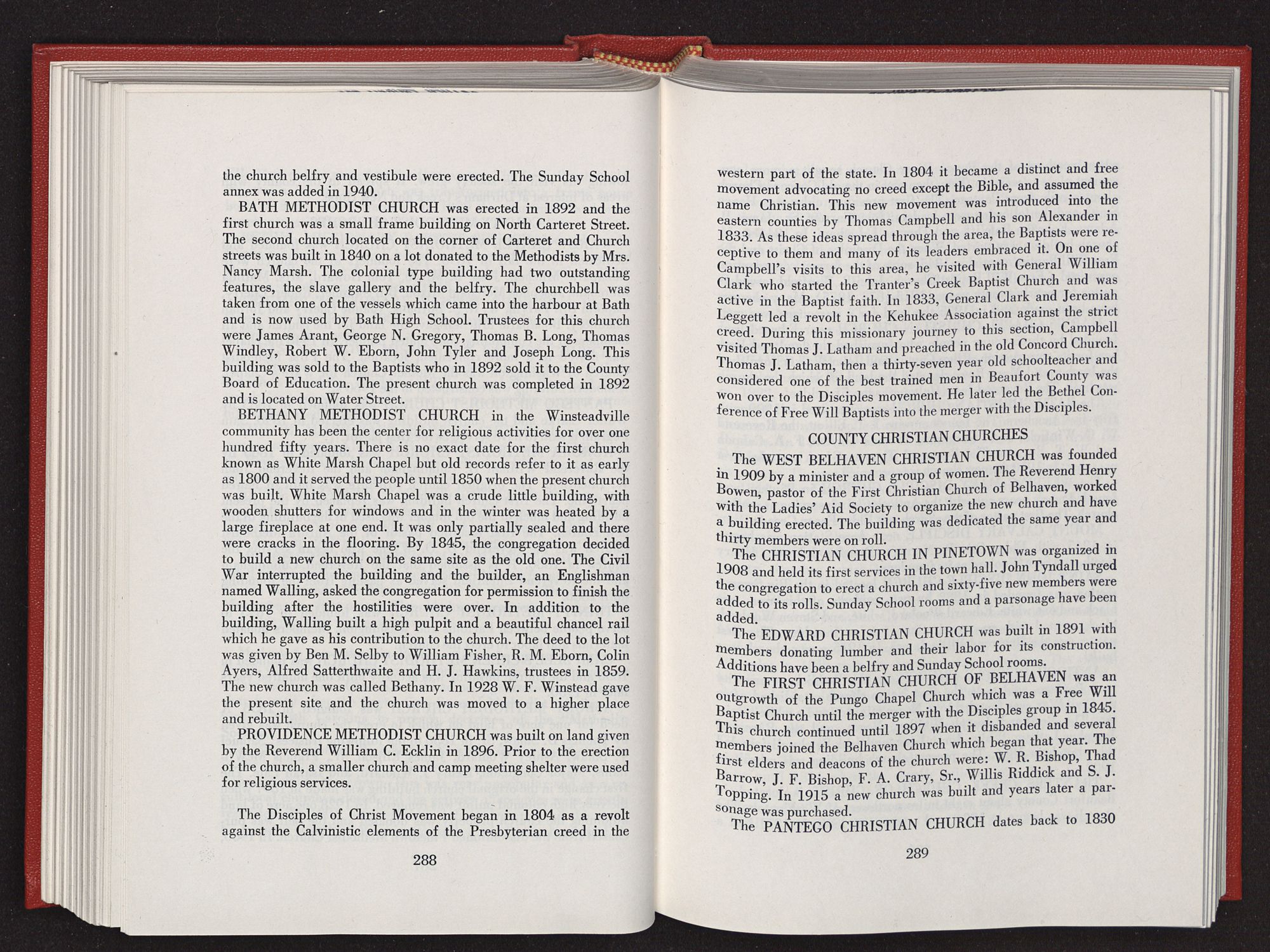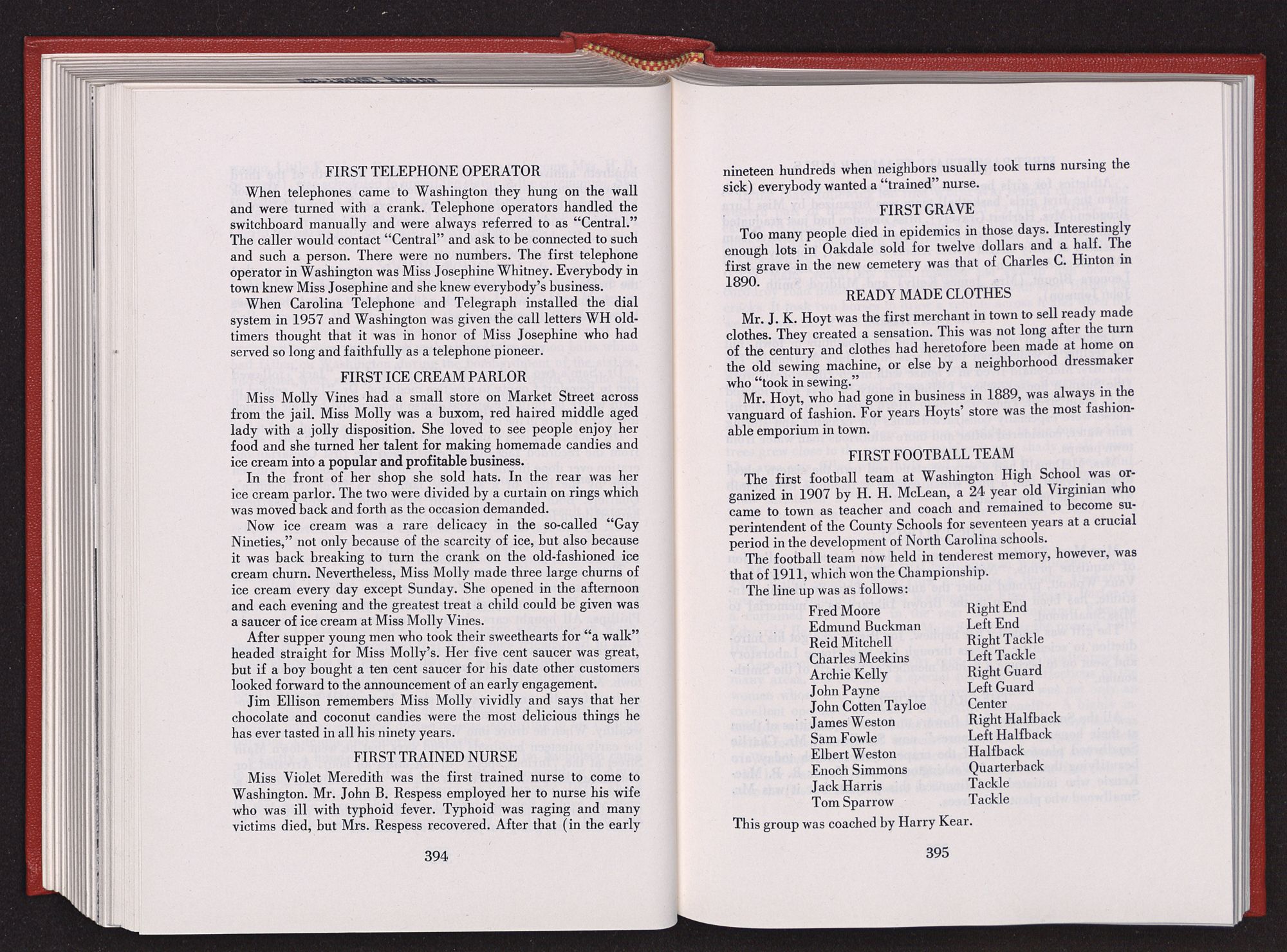 FOREWORDActing on instructions from the Washington-Beaufort County Bicentennial Commission with Roland Modlin, Chairman, the History Committee, under the Chairmanship of John Morgan, began in 1974 a history of the Washington area. The committee decided to use articles which spoke more graphically of their periods than those written today as the chronological base for the history, and to enlist the aid of a number of people in researching and writing in the areas in which they were interested. The result is a collection of articles, both old and new, which supplements the earlier work, Beaufort County: Two Centuries of its History by Colonel Wingate Reed, and brings to print much data heretofore not published. Hundreds of people have been interviewed. Records, letters, ledgers and scrapbooks have been brought from attics and used. Old newspapers have been collected and consulted. Much had to be omitted but the committee hopes that further volumes of Beaufort County history will follow. Quantities of material are now available and more is constantly accumulating, which has not been touched in this volume. This material is in the files at the George H. and Laura E. Brown Library where the data used for this book is stored.